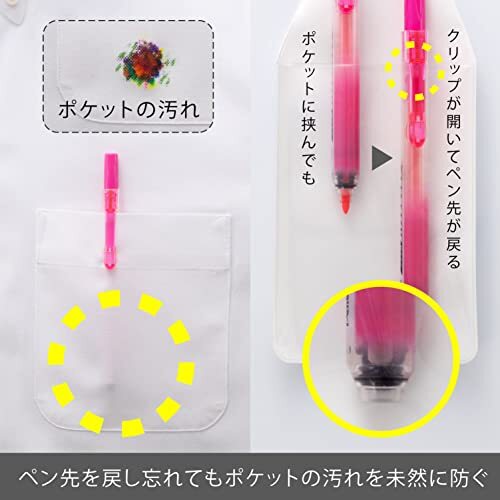カラーセット・5色 5色 SXNS15-5・・Color:5色Style:カラーセット・1本あたりサイズ/重さ:幅12mm×奥行16mm×長さ145mm/29g・インキ色:ピンク・オレンジ・イエロー・ライトグリーン・スカイブルー・特長:キャップのないノック式タイプ蛍光マーカー・ノックひとつでペン先を出し入れできるノック式。・経済的なカートリッジ式で本体は繰り返し使用可能。商品紹介 ペン先の出し入れは押すだけ。ノック式だから、キャップを失くすことがありません。 片手ですぐに使うことができます。普通紙・OA用紙に使えます。 参考書、資料などのマーキングに ノック式なのでキャップをなくす心配がなく、説明にも集中できます。 キャップがなくても、ペン先が乾燥しないボールシャッター機構を採用。 ノック式ながらも普通のペンと変わらない太さ(Ф12mm)で使いやすい。 クリップに挟むとペン先が戻る安心設計。 経済的なカートリッジ式。 ●商品の仕様が予告なく変更する場合がございます。●使用用途を守って正しくお使いください。