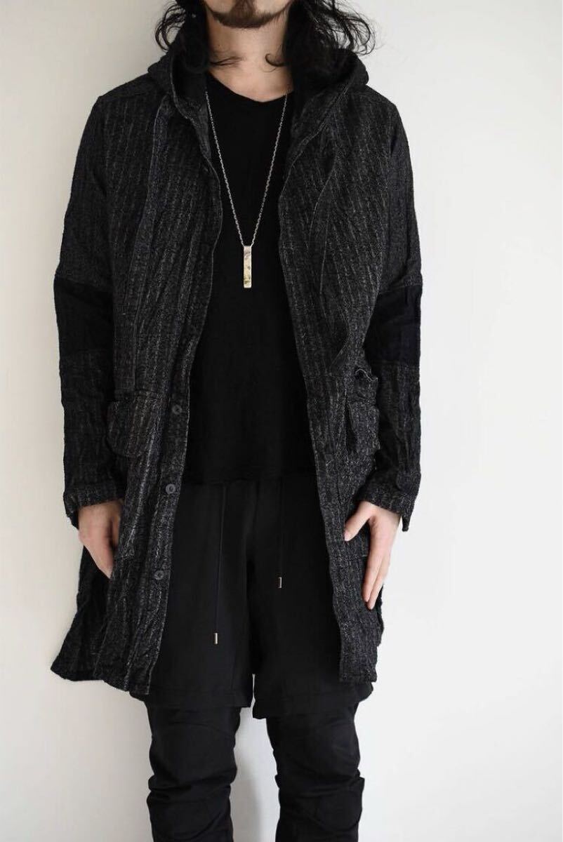 起毛感のあるドライタッチな生地感とシワ加工が特徴のロングフードシャツになります。