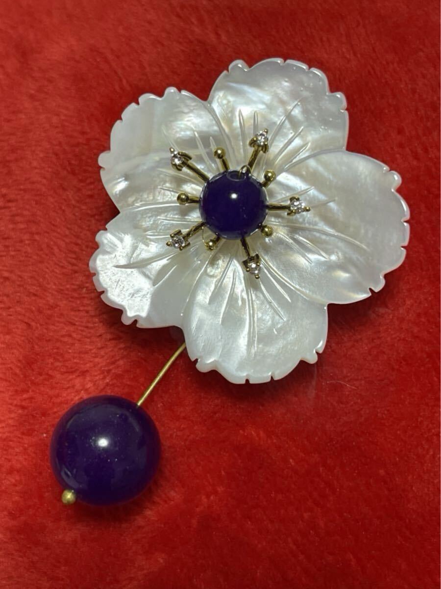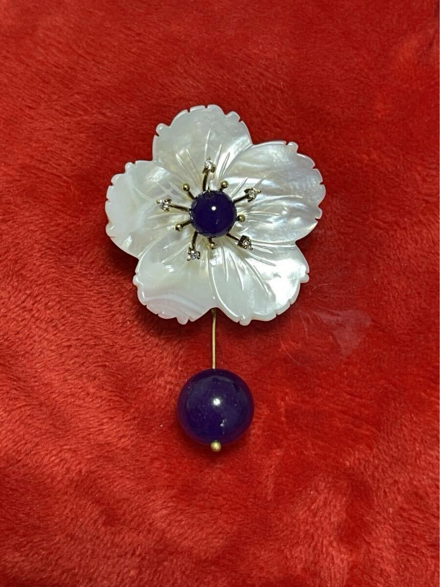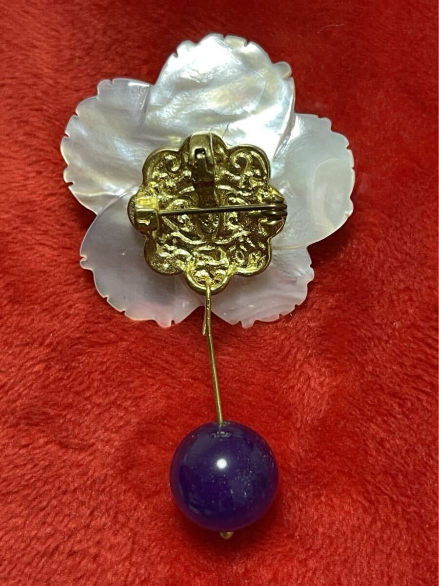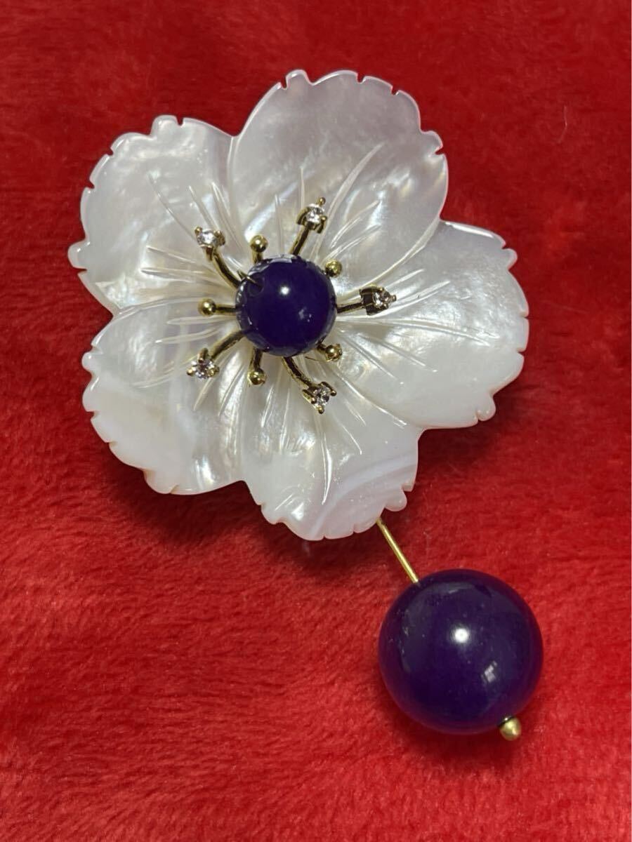 【商品名】:桜の花 白蝶貝殻 天然シェル&紫玉髄 ゆらゆらブローチ ペンダントトップ とペンダント両用 上品 D02