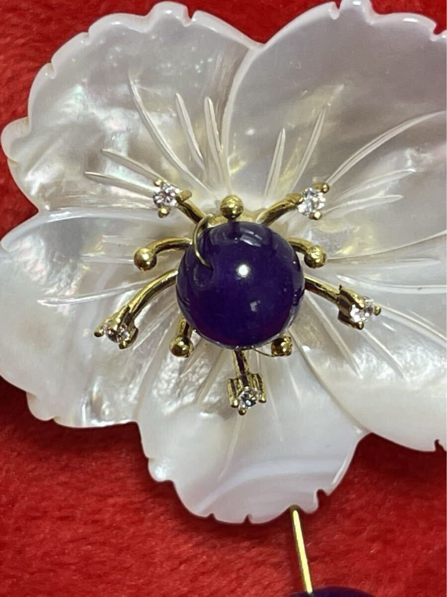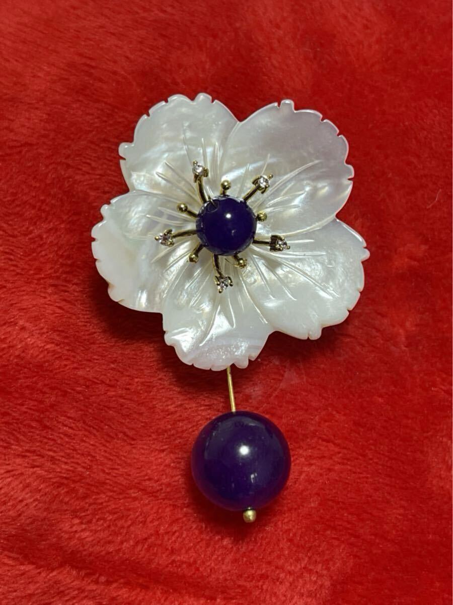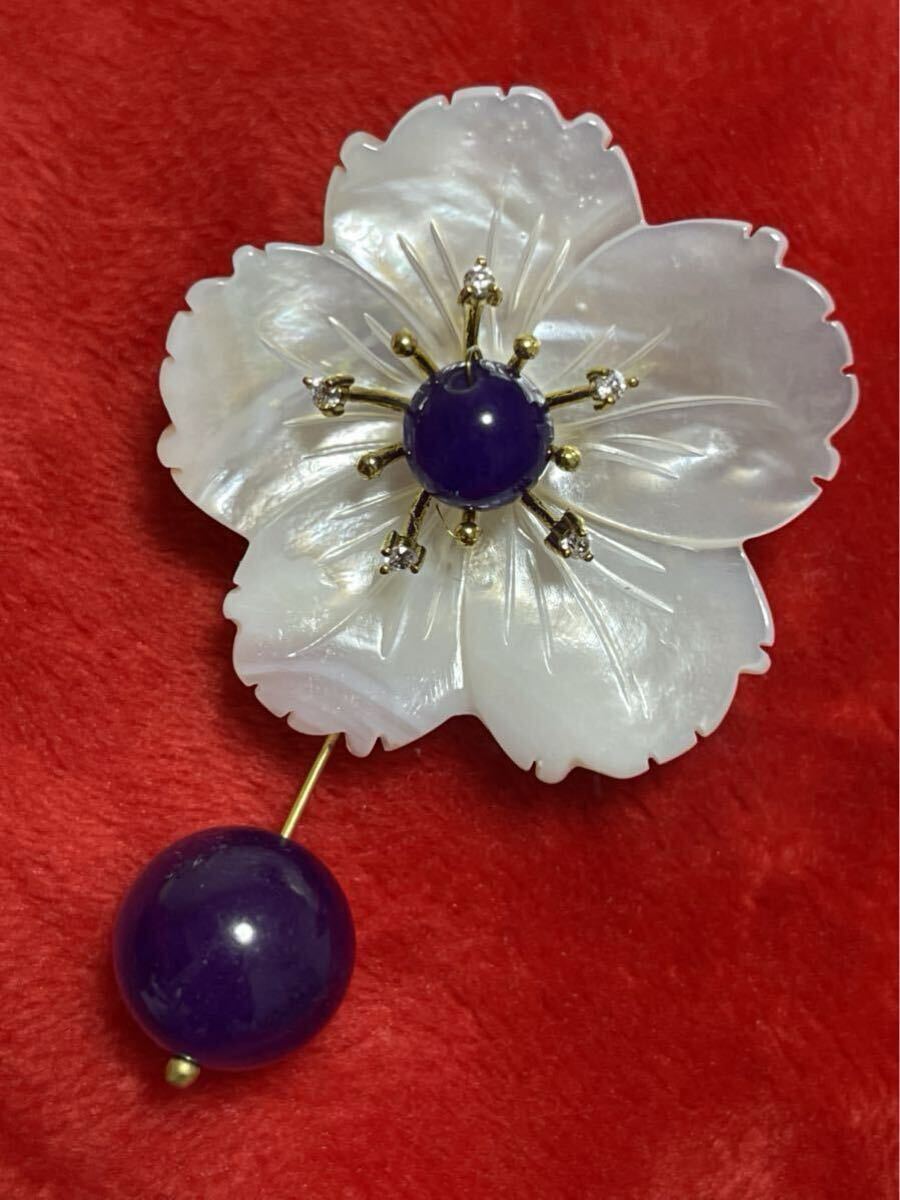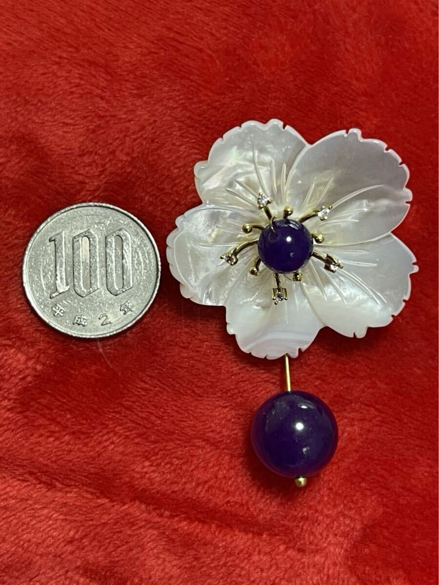 【商品名】:桜の花 白蝶貝殻 天然シェル&紫玉髄 ゆらゆらブローチ ペンダントトップ とペンダント両用 上品 D02