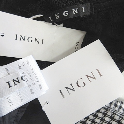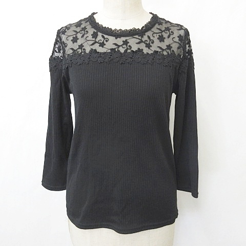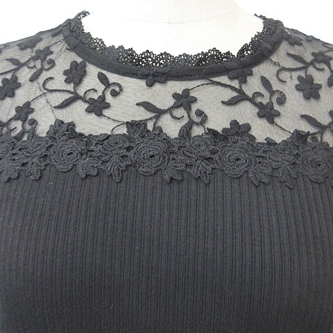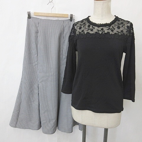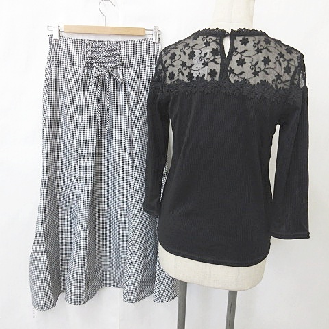 未使用品 イング ニット スカート 2枚セット 八分袖 丸首 レース フレア ロング丈 レースアップリボン 黒 M F