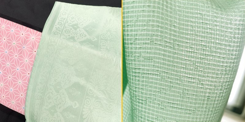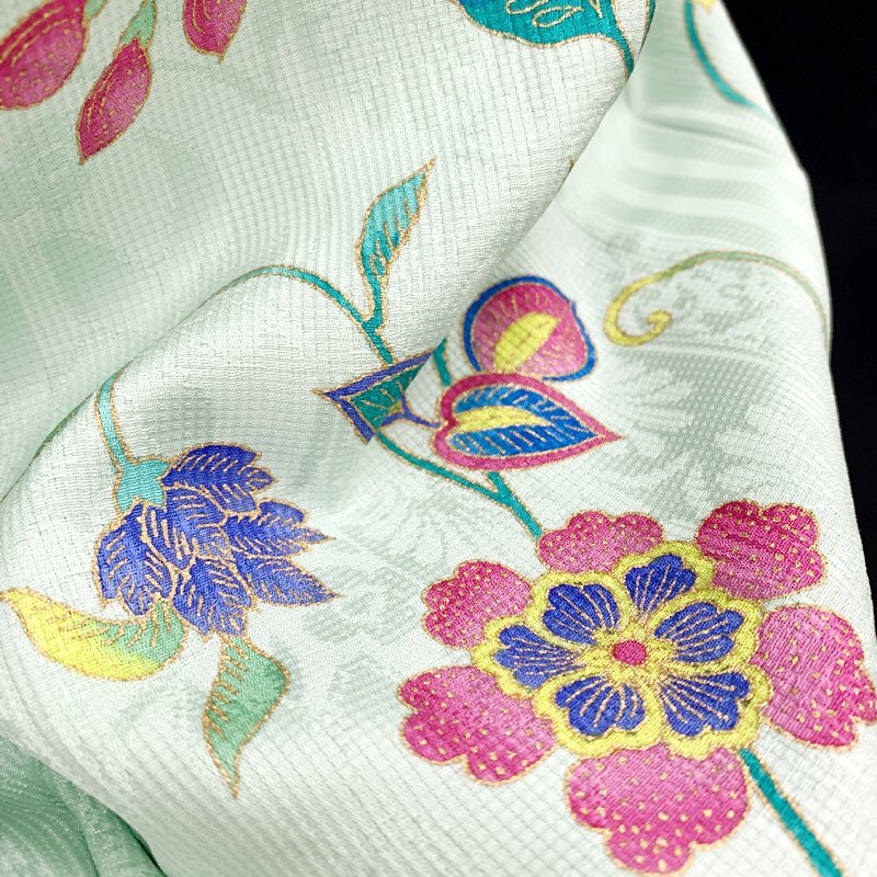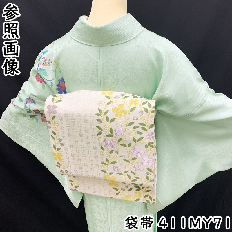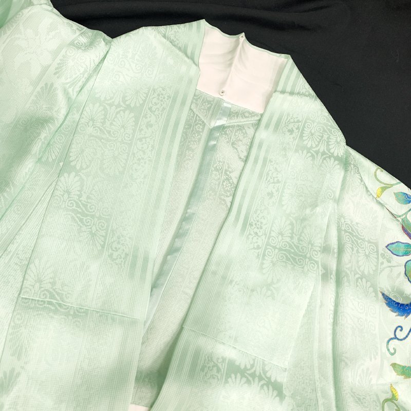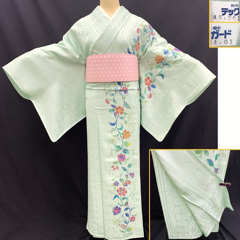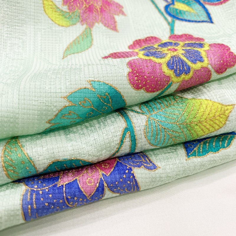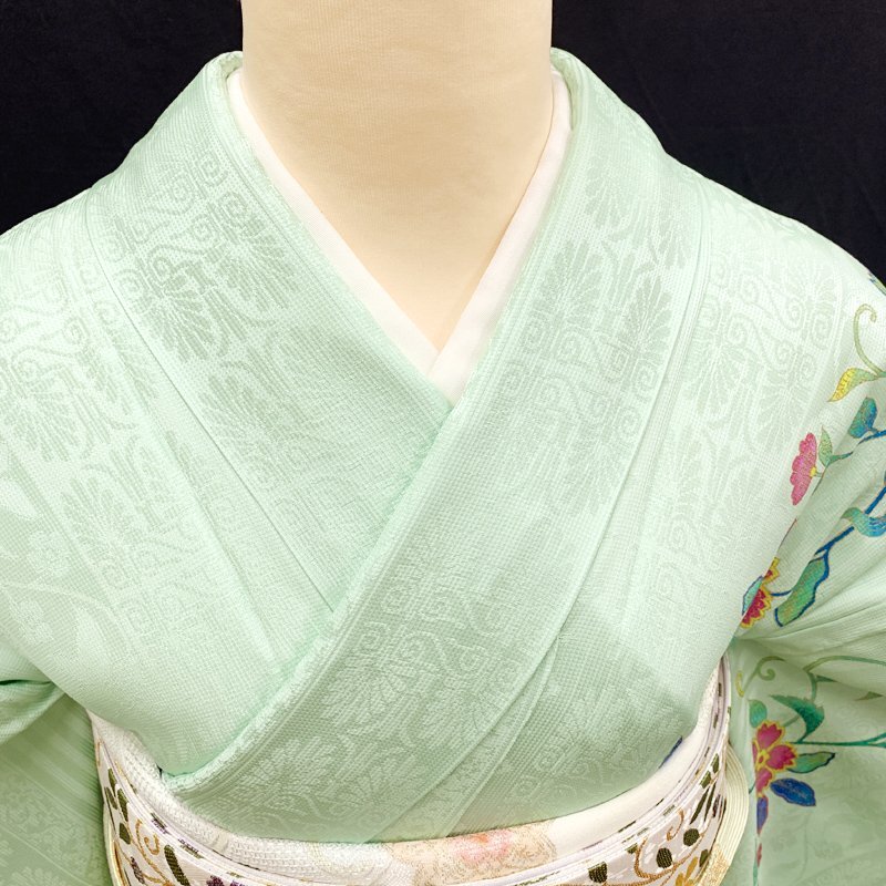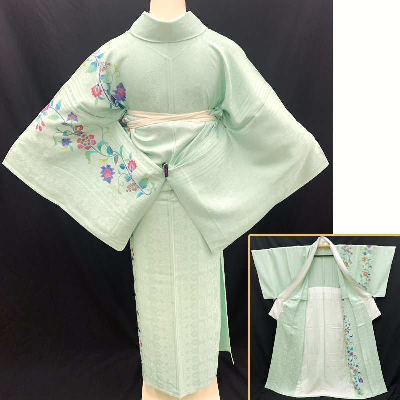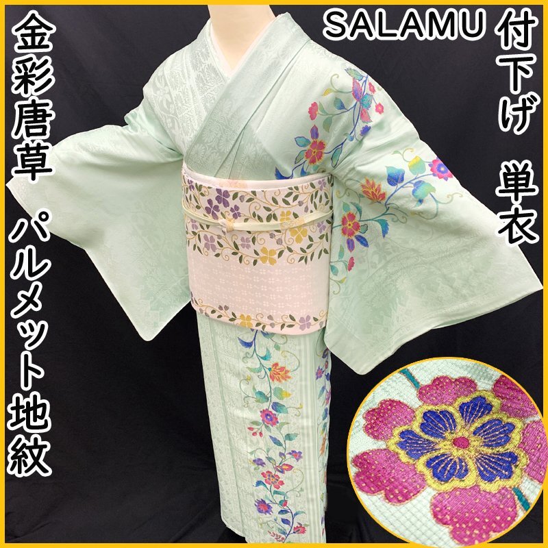 | ●SALAMU 付下げ 単衣 ミントグリーン 金彩唐花 パルメット地紋●美品 (No.ggd) 京都で活躍されている着物ブランド「SALA★MU(サラム)」のドレッシーな単衣の付下げです。エレガントな光沢ある爽やかなミントグリーン色の地には、美しいパルメット唐草などの美しい地紋が浮かびます。袖や左前身頃などには、金彩で縁取られた鮮やかな極彩色の唐花草が。エキゾチックな色でアクセントを加えた、とてもおしゃれな付下げです。(画像の帯411my71や小物は参考商品で、本品には含まれません)。 透け感はないのですが、生地を光に透かすと細かな隙間があり、通気性があるのが分かります。軽やかな生地感で単衣仕立てですので、6月や9月などの季節の変わり目や、季節外れの暑さなどに最適です。 テックガードタグ、居敷当て付き。特筆すべきシミ・ダメージもなく美品です。 【素材】正絹 【色】ミントグリーン *モニターによって色味は実際と異なる場合がございます。 【サイズ】裄:70cm、丈(肩から):162cm、袖幅:35.2cm、袖丈:49cm、前幅:23.8cm、後幅:30cm、裄の縫込み 身頃側:1.5cm、お袖側:0.8cm、内揚げ幅:11.5cm *素人採寸のため、多少の誤差はご容赦ください。 上質な逸品ですので、いかがでしょうか?よいお品物でお勧めです^^ | |