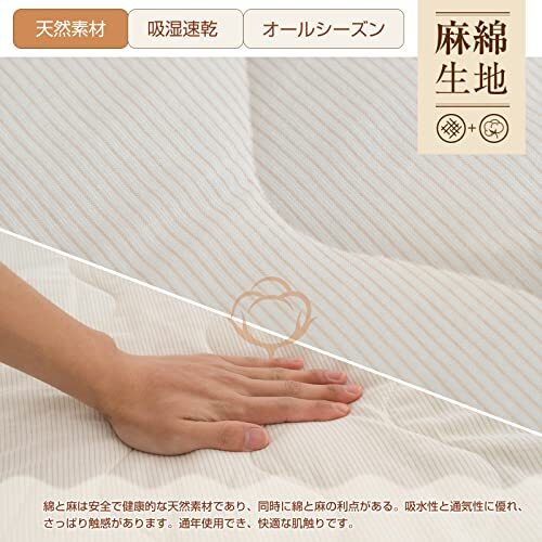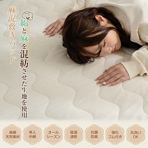 商品説明 | 【おすすめ天然素材:麻混生地】綿の含有量が高く、冬に使っても優しいです。麻が入っていてさらにさっぱり。合繊の敷きパッドが使いたくないなら、天然素材の麻混敷きパッドがおすすめ!ポリエステルのべたつき感を脱し、麻のシャリ感を楽しむ!綿と麻を混紡させた生地を使用しています。お肌に触れる表面は吸水性の良い綿と、さっぱり触感の麻混で、吸汗性に優れ、シャリ感があるため秋に最適な敷きパッドです。さらに、これまでの製品よりも綿の含有量を高め、製品の柔軟性と耐久性を大幅に向上させた。綿麻生地は軽量で、触っても非常に柔らかく、長持ちし、快適感があります。 【天然素材生地・TEIJIN(帝人)中綿使用】 綿繊維も麻繊維も安全で健康な天然繊維であり、自然界における天然の環境保護素材でもあり、環境にやさしいと同時に、体の健康にもよいです。中わたには上質なTEIJIN(帝人)マイティトップ?中綿を使用し、防ダニ・防菌防臭加工を施し、細菌の繁殖を防止し、抗菌防臭機能に優れています。機能が持続し、何度も洗濯した後の効果は依然として新しいものと同じです。 【オールシーズン向け&ゴムバンド付き】綿麻生地は人体の皮膚の汗を吸着し、体温を迅速に正常に回復させ、本当に通気性、吸汗効果を達成し、冬は暖かく夏は涼しく、肌に優しくで、四季の使用に適している。敷きパッドの四隅に滑り止めのゴムバンドが付いていて、敷きパッド をマットレスにしっかり固定できる。同じ色のゴムバンドを使用しているので、より美しくなる。お洗濯の際の取り外し&取り付けも簡単なので、使いやすくて、家事の負担も軽減してくれる。 【吸湿速乾&丸洗いOK】表地も裏地も吸汗速乾の生地で、汗や湿気をすばやく吸収する。じめじめしないので、吸水速乾でベタつかず蒸れにくい、体をずっとサラサラに保つことができる。丸洗い可能なので、家庭用洗濯機で洗えばOK。速乾効果と合わせて、清潔で便利。(洗濯ネットの使用をおすすめします) 【商品情報】シングルサイズ:約幅100cm*奥行200cm【素材】表地:綿と麻を混紡させた生地。裏地:ポリエステル生地。中綿:上質なTEIJIN(帝人)中綿を使用し、品質が保障されている。【メーカー保証】初期不良対応 :お客様を満足させるように努めていきますので、万が一、製品不良などがあった場合は、保証対象となりますのでお気軽にお問い合わせください。弊社にご連絡いただければ迅速に対応いたします。安心してお買い求め頂けます。