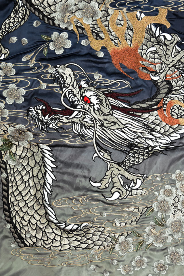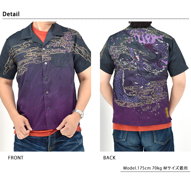 絡繰魂さんから「粋 桜龍降臨刺繍半袖シャツ(252026)」のご紹介です。 重みすら感じるほどの刺繍量が魅力的な粋シリーズから、最新作が登場。 今回はグラデーションがかけられたボディーに、龍が降臨する様子を大胆に刺繍しました。 背景には桜がちりばめられており、裾には印風のロゴが落とし込まれています。 柄は縫い目を跨いで身頃から袖へと続いており、実際に着用した際には、体のラインに沿って柄が立体的に浮かび上がります。 ボディーには、てろんとした肌触りでいて、刺繍に負けないしっかりとした生地感のものを採用。 左胸にはしっかりと柄合わせされたポケットが縫い付けられています。 | |||||||||||||||||||||||||