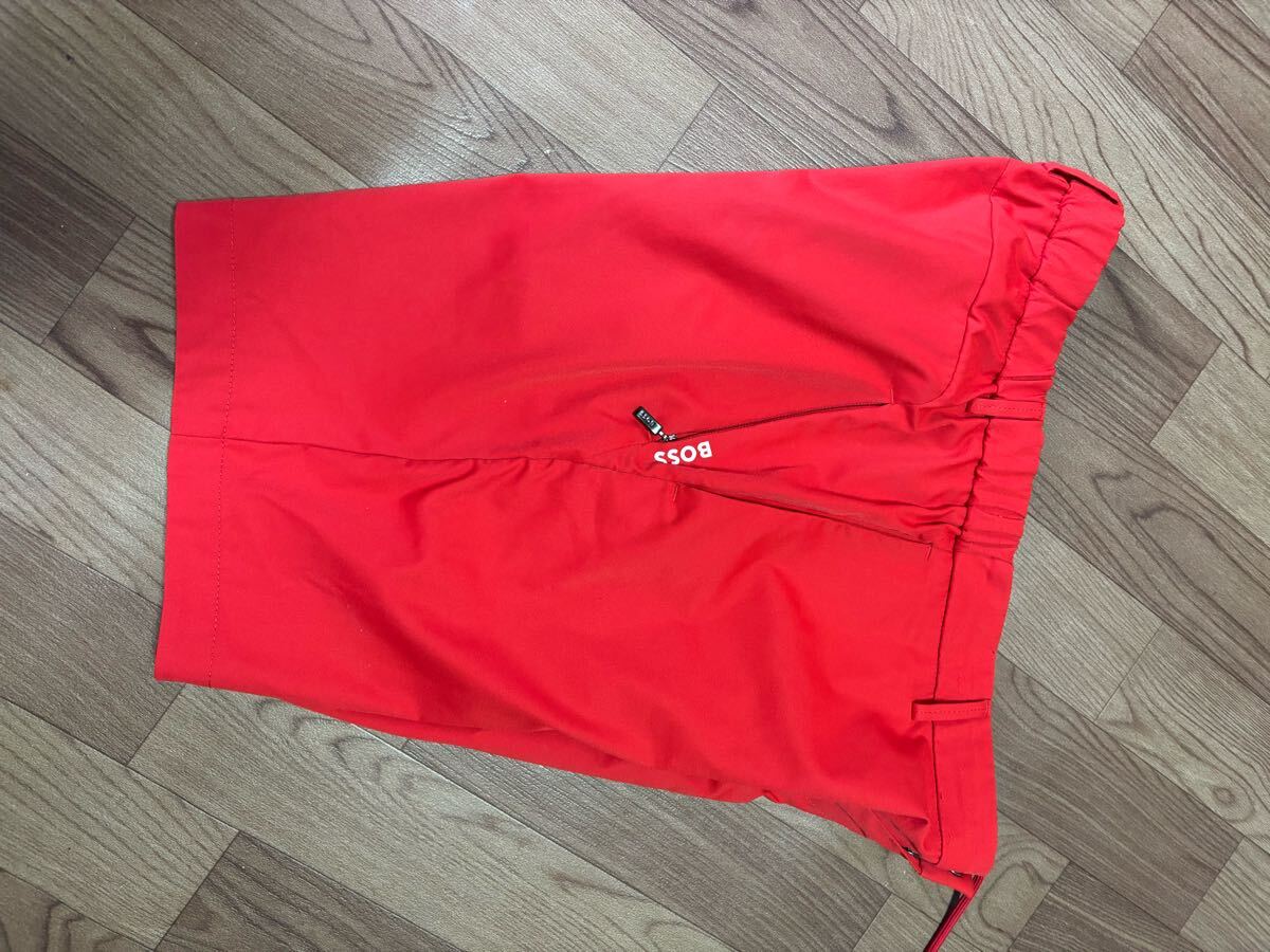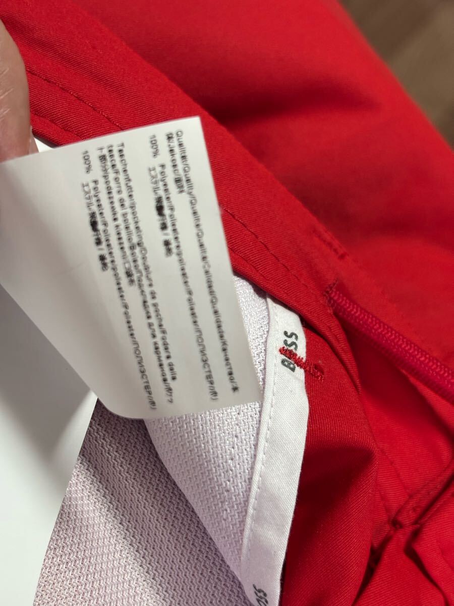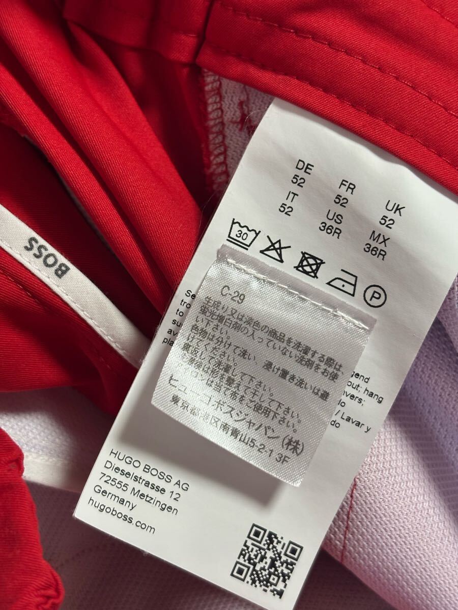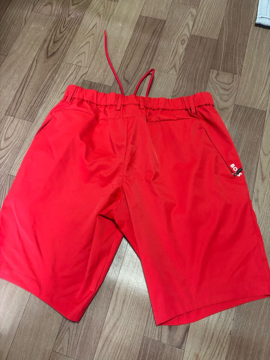 ヒューゴボスのレッドショートパンツです。サイズ52表記で平置きウエスト後ろゴム43〜51股下26裾幅26全長49センチ位です。