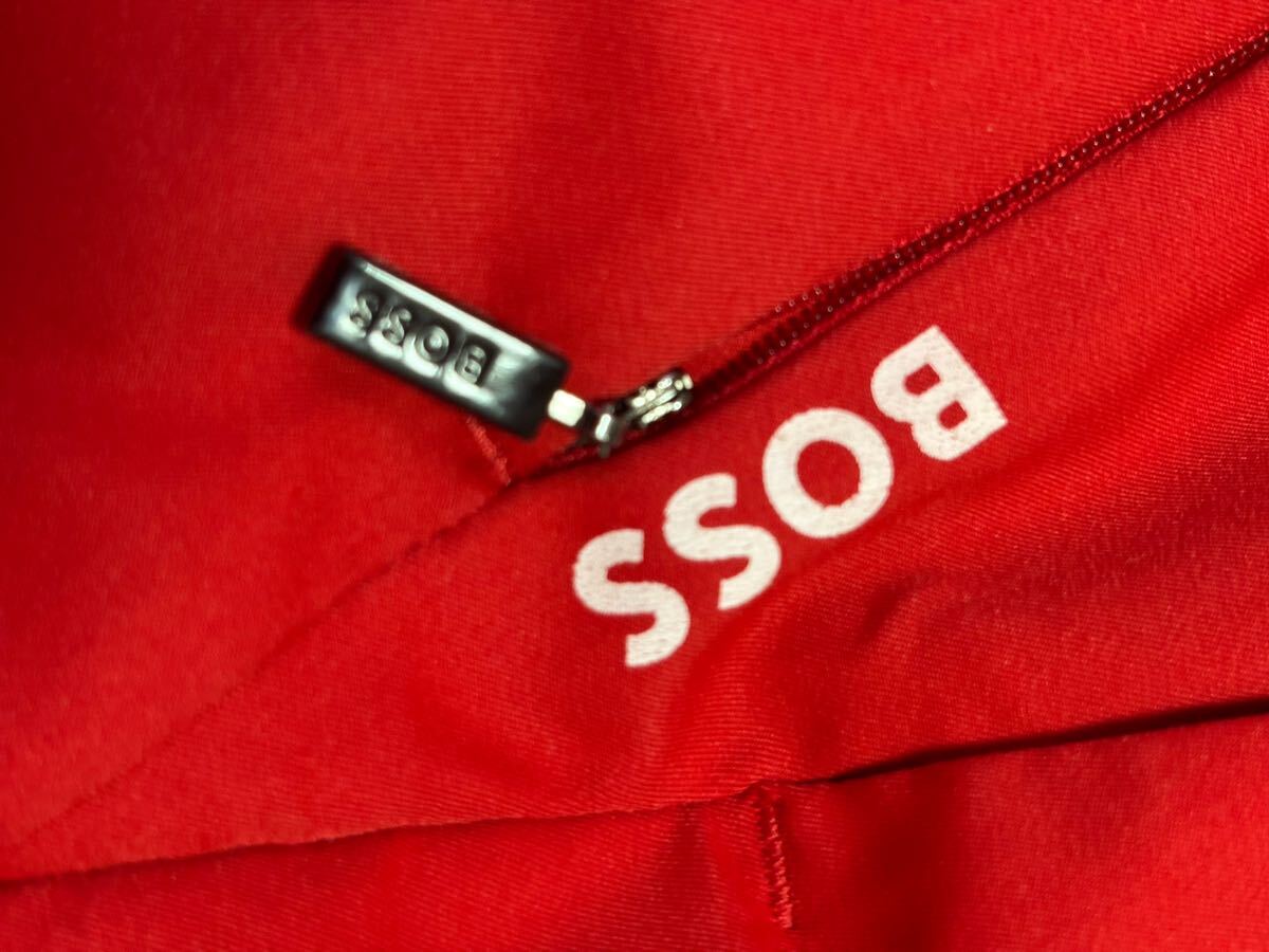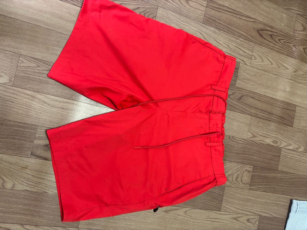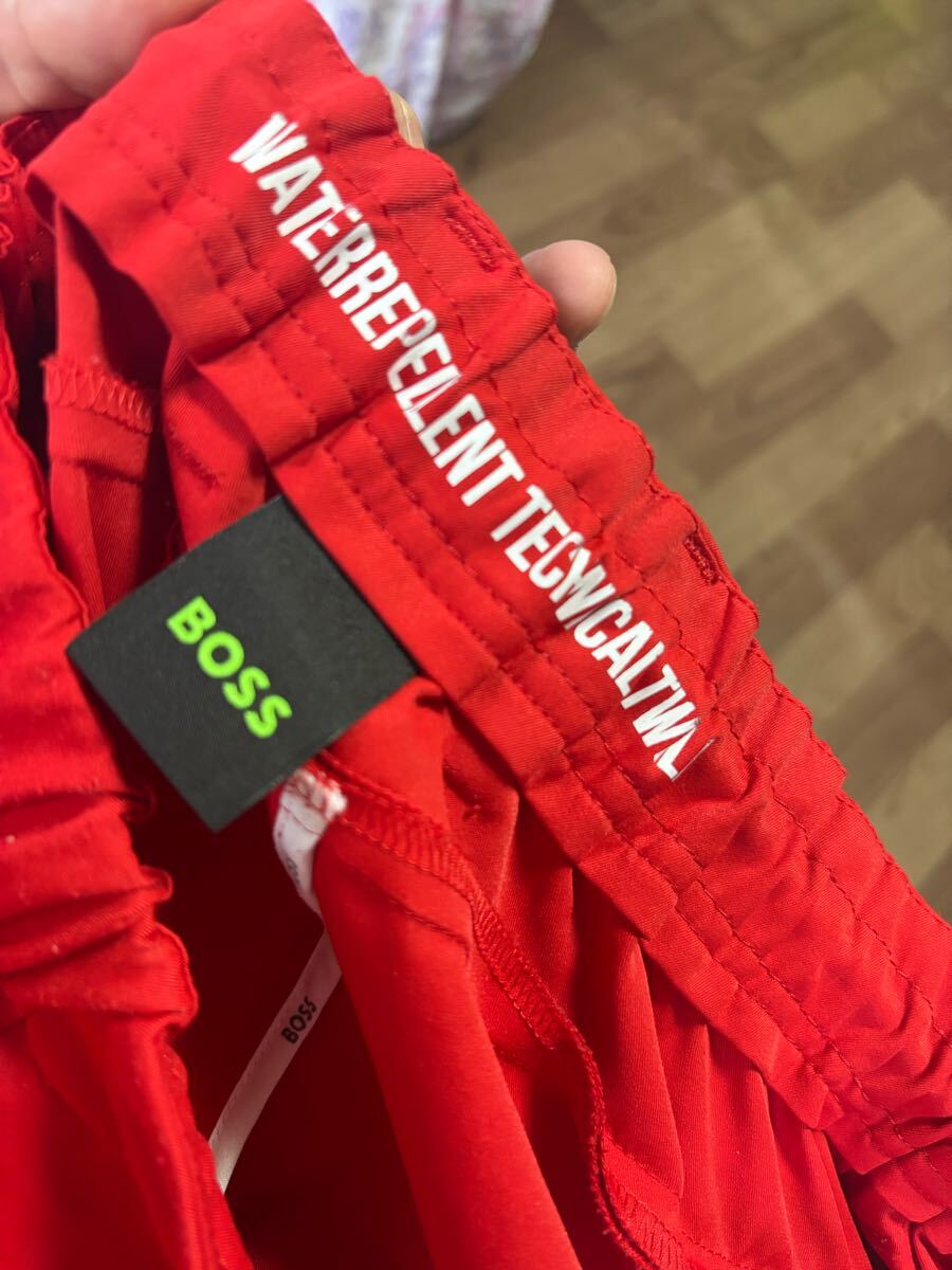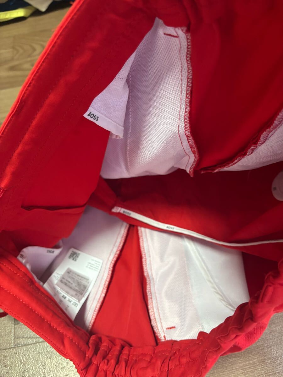 ヒューゴボスのレッドショートパンツです。サイズ52表記で平置きウエスト後ろゴム43〜51股下26裾幅26全長49センチ位です。