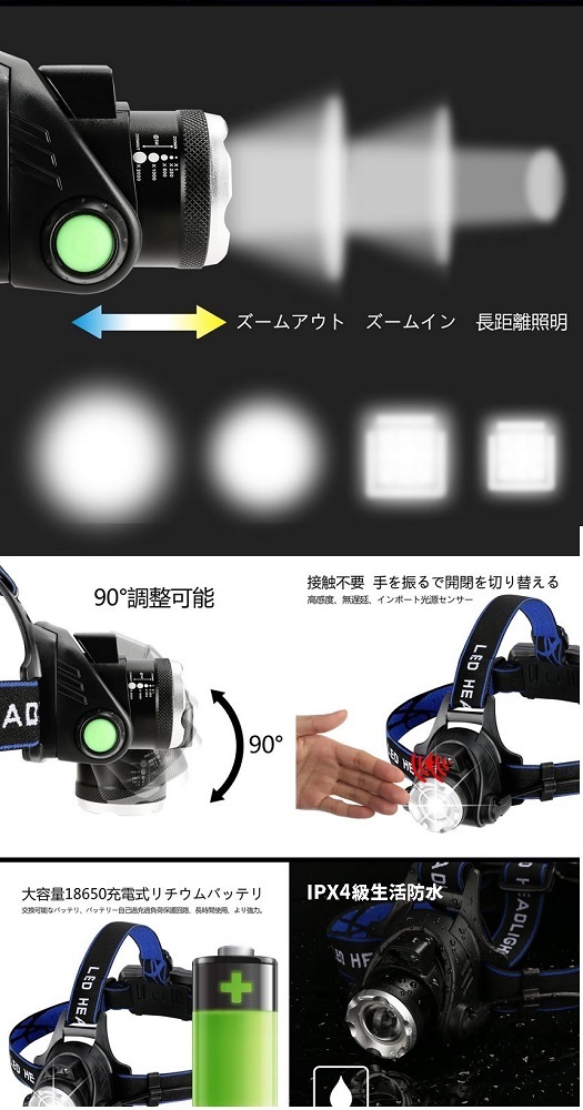*センサー搭載★ LEDヘッドライト 1200LM 角度調整 充電式 防水 防塵
