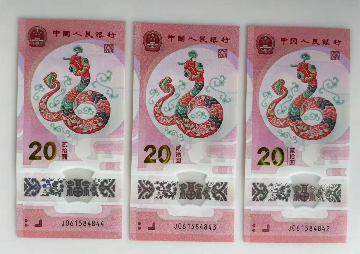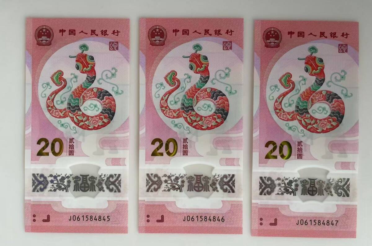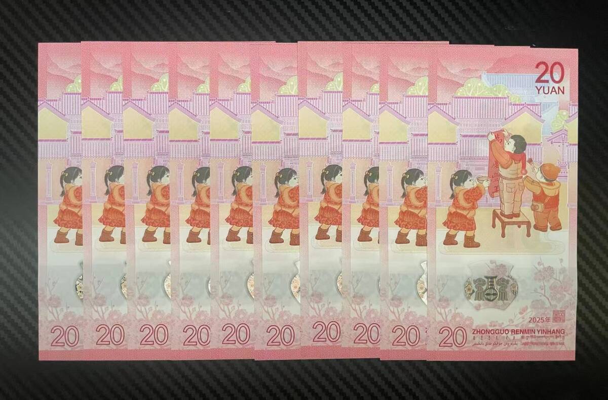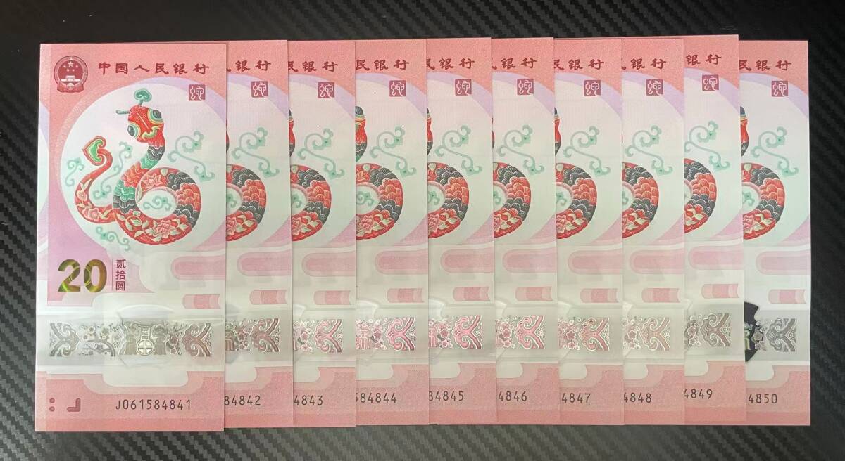中国紙幣・2025年 中国生肖蛇記念紙幣・20圓・10枚連番・ピン札・完全未使用