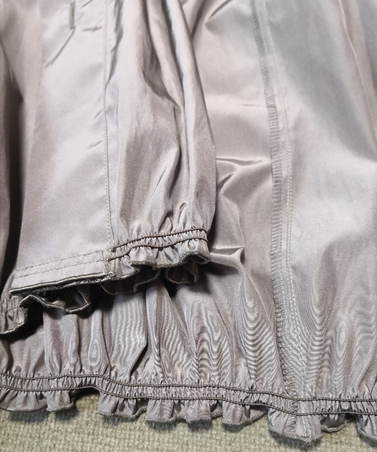自宅では、ウレタンハンガーにかけてしまっています。もとからシワ感がある風合いです。裾にシャーリングゴムが縫いついたバルーン型のため、ギャザーによるシワやスジ状の跡があります。