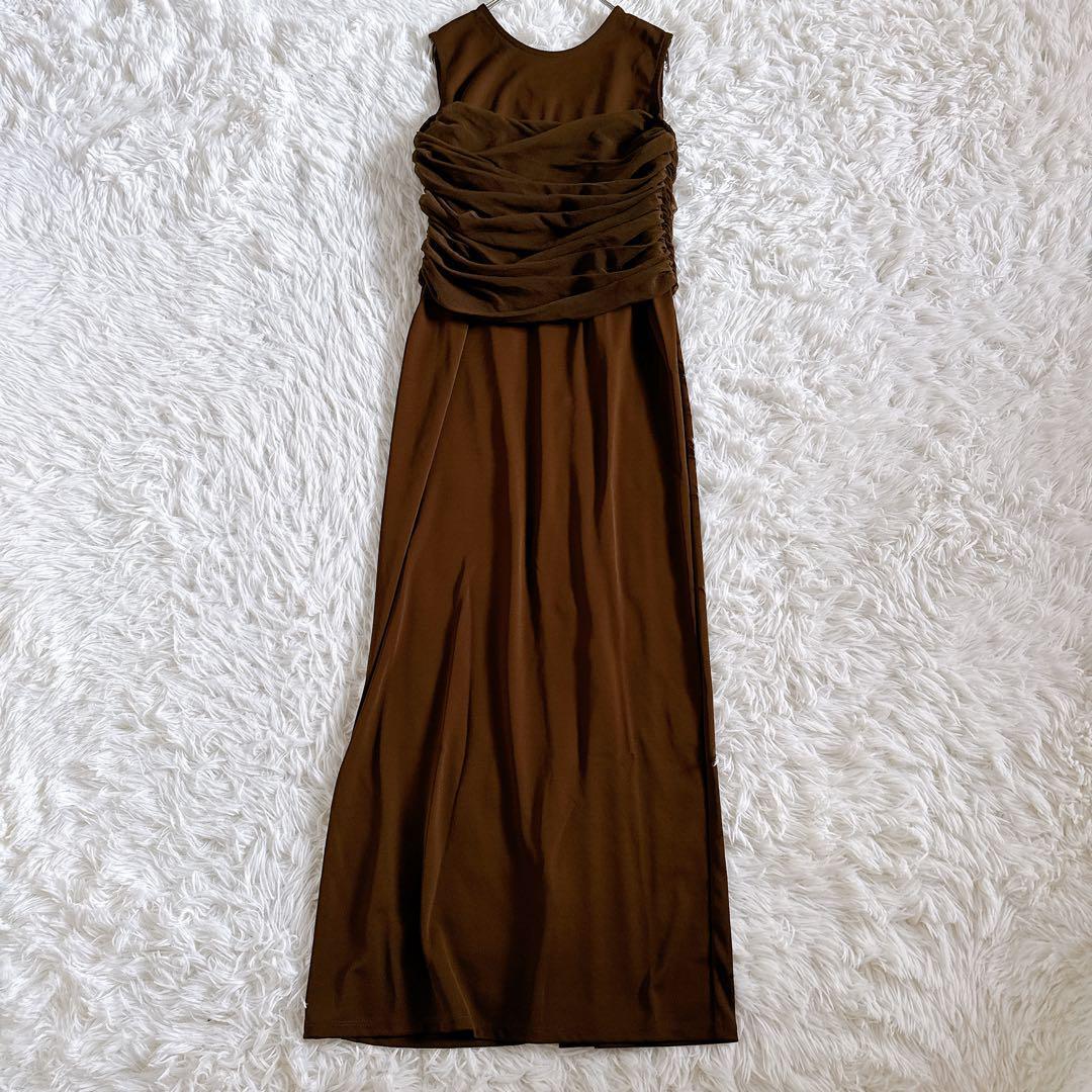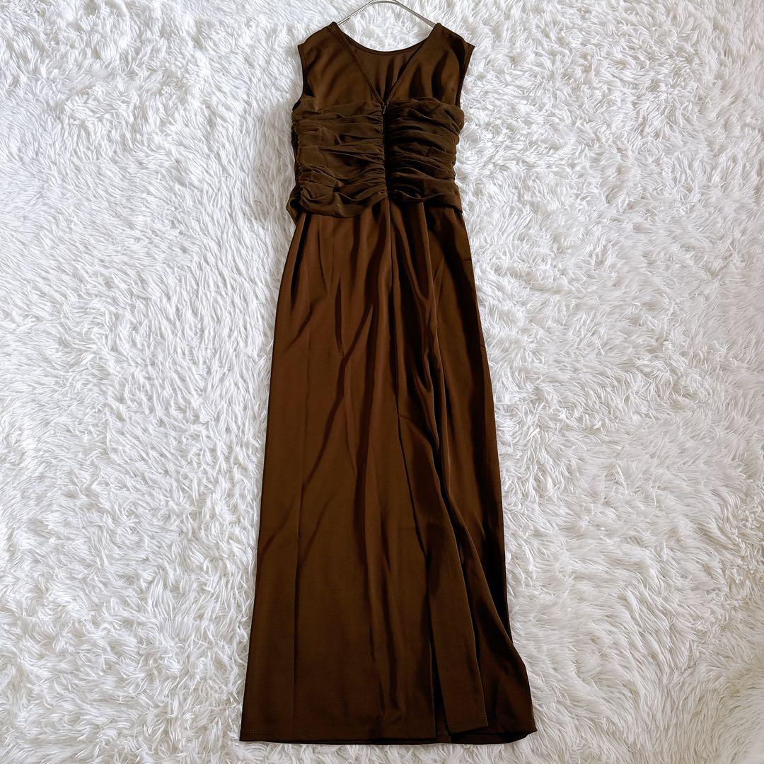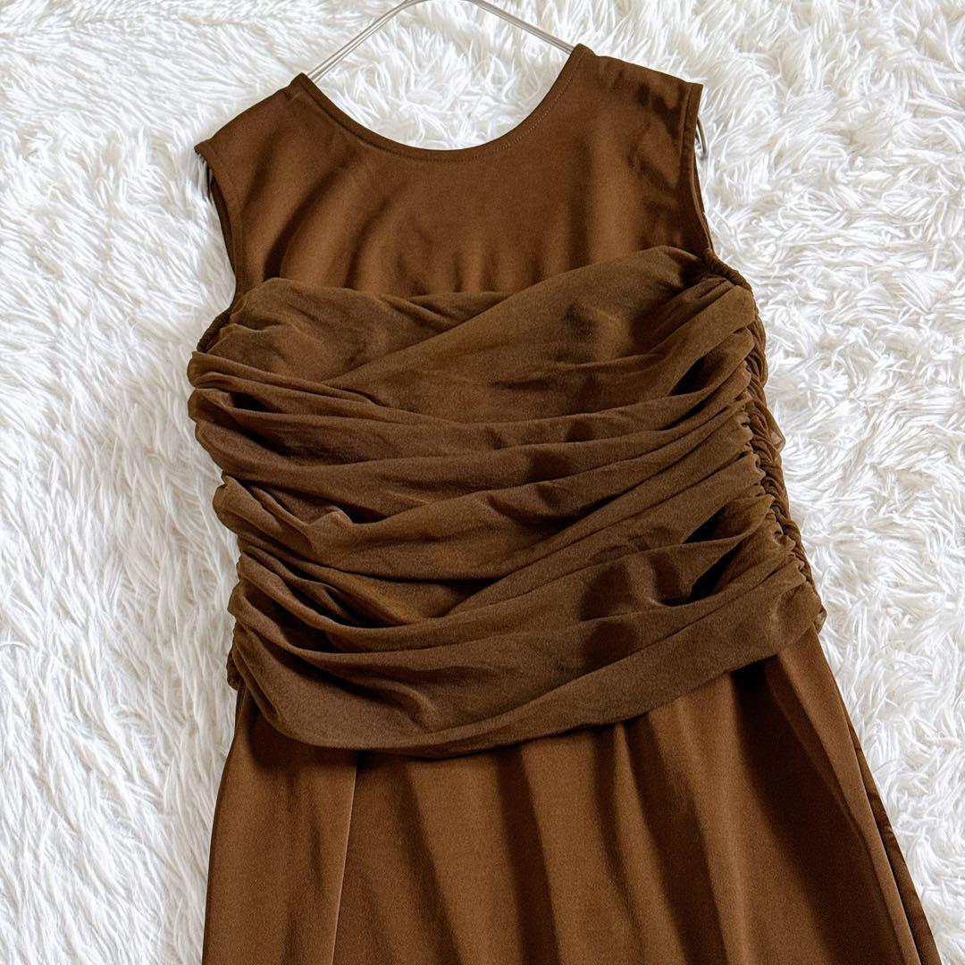 シアーコンビストレートワンピース ギャザーデザイン ノースリーブ ロング丈 38 ブラウン 2024年モデル 24SS
