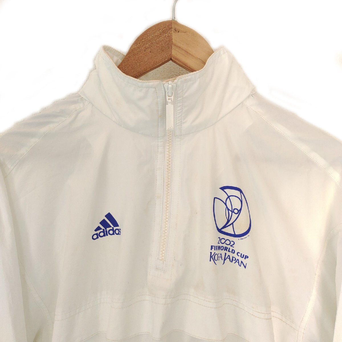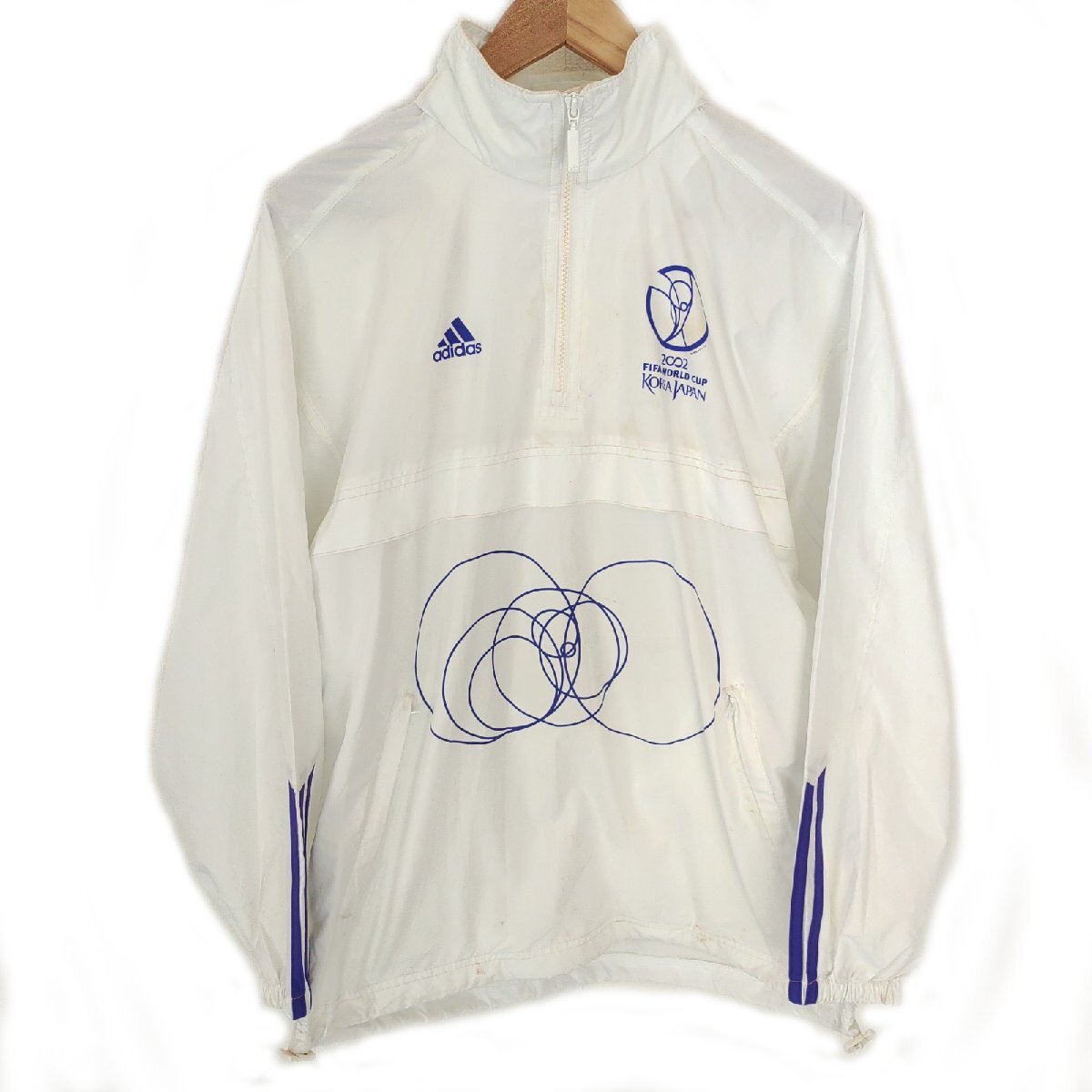 フロント両サイドにファスナーポケットの付いた、ハーフジップ・プルオーバー仕様。 『2002 FIFA WORLD CUP KOREA JAPAN』のロゴ入り。優れた防水性と透湿性を備えた素材『Climaproof』により、雨や雪などの悪天候下でも、身体をドライに保ち、パフォーマンスをサポートします。裏地メッシュ&ベンチレーション付きで余分な熱を逃がし、快適な着心地の一着。薄手なので持ち運びに便利で、急な天候変化も安心です。