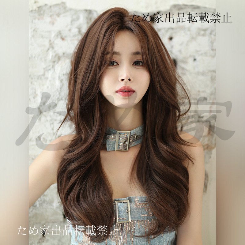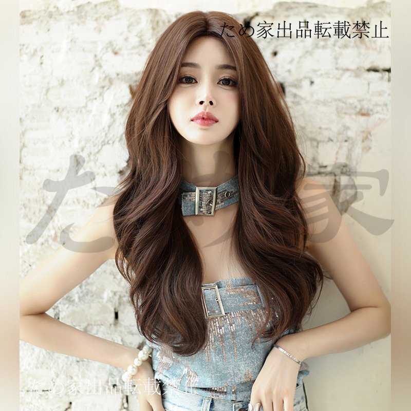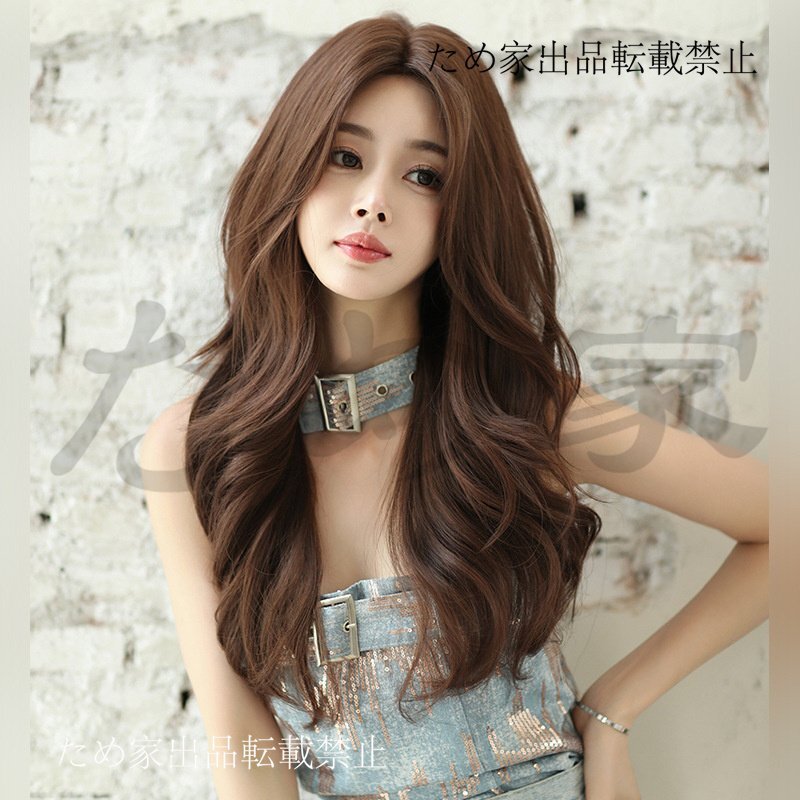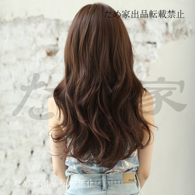 新品人毛 ロングウェーブウィッグ センター分け サンセットブラウン つむじ部分手植え 自然に見えますフルウィッグ