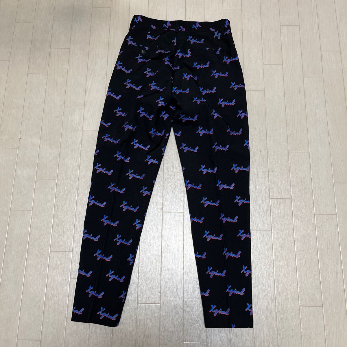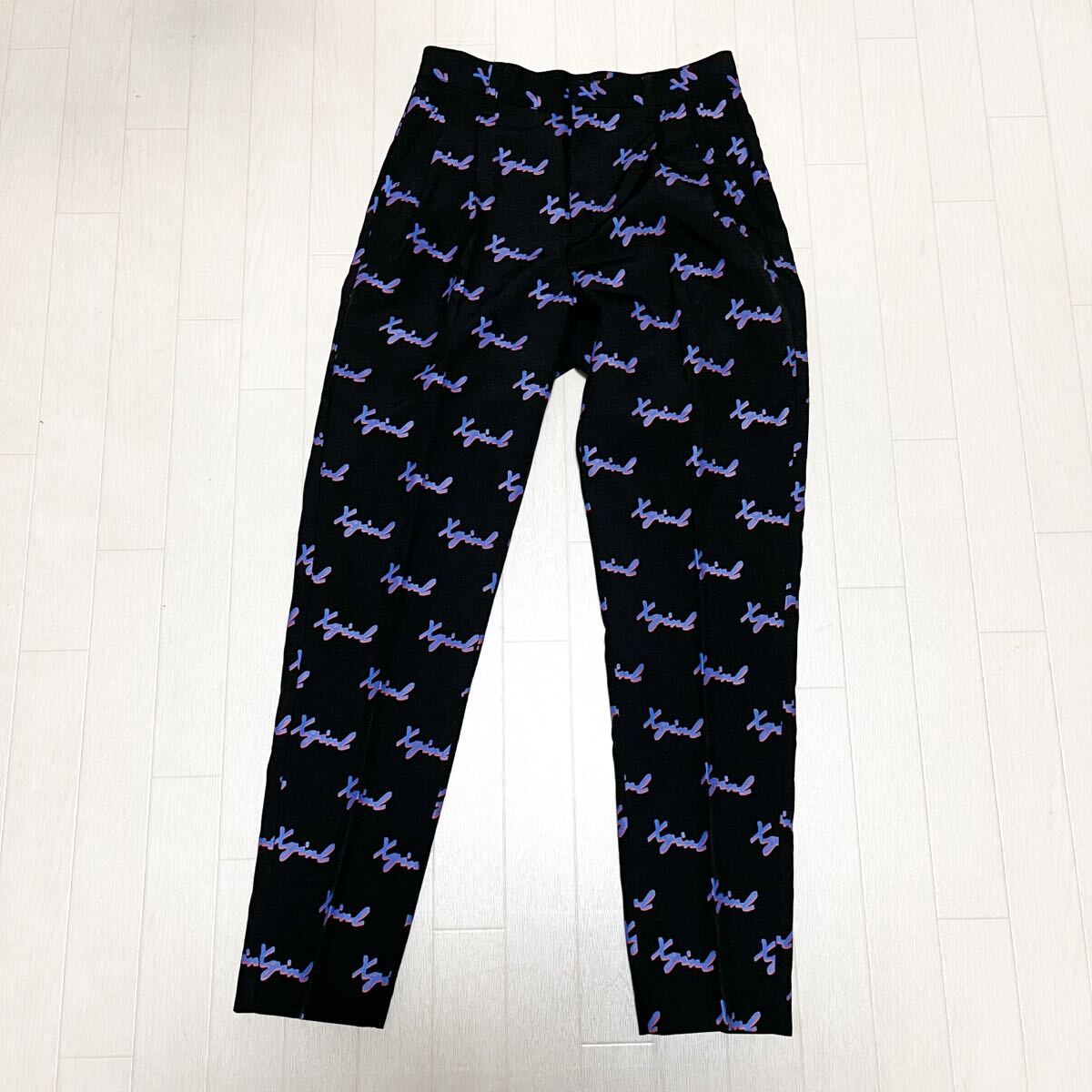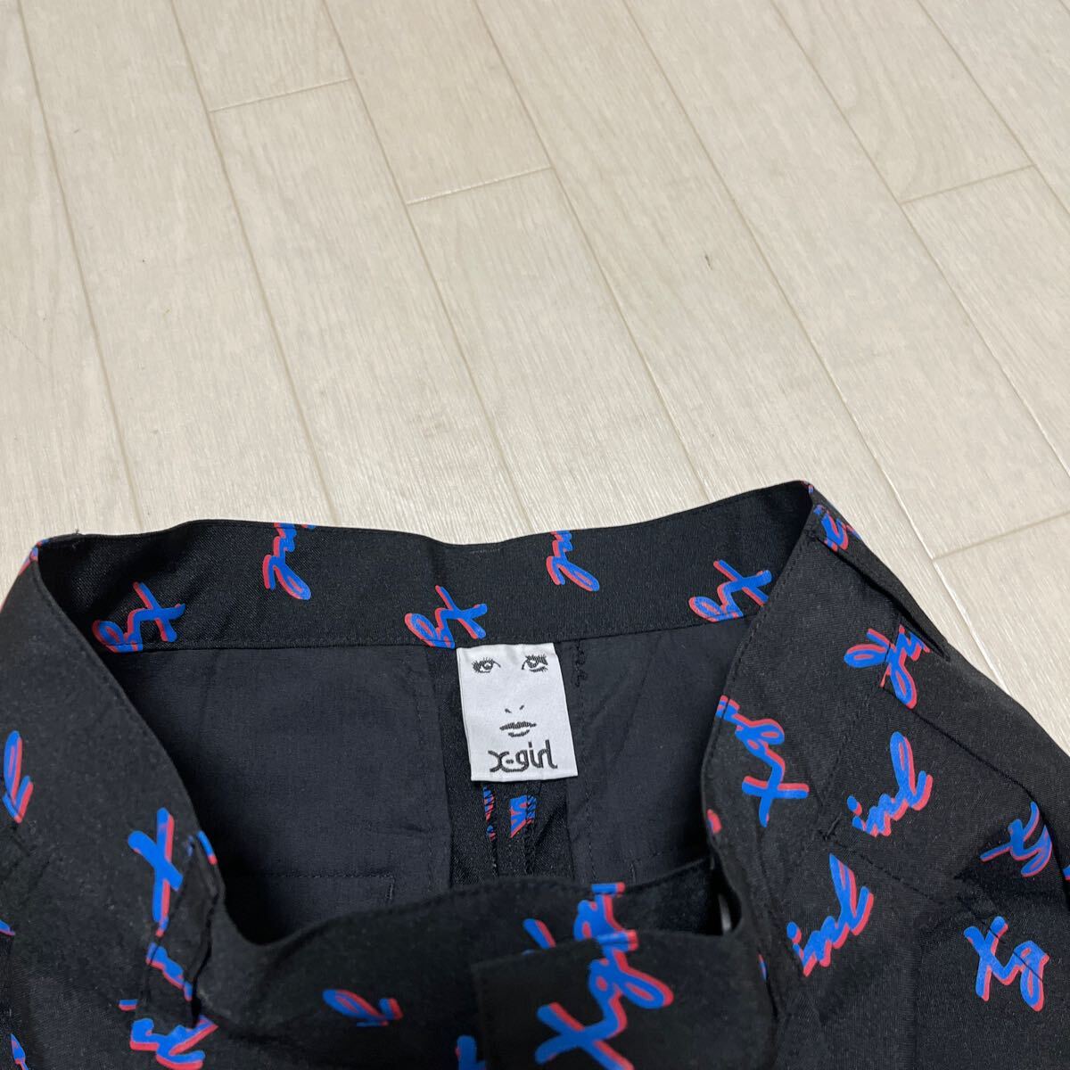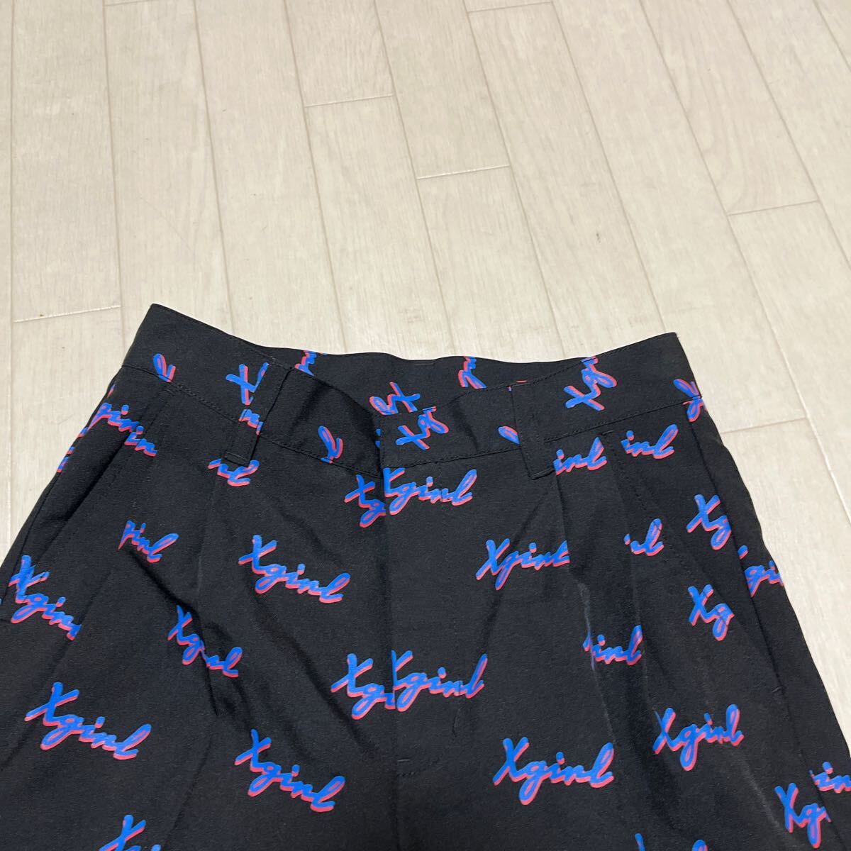 和738★ x-girl エックスガール スリム カジュアルパンツ ボトムス ロゴ柄 総柄 タックパンツ ジップフライ 1 ブラック レディース