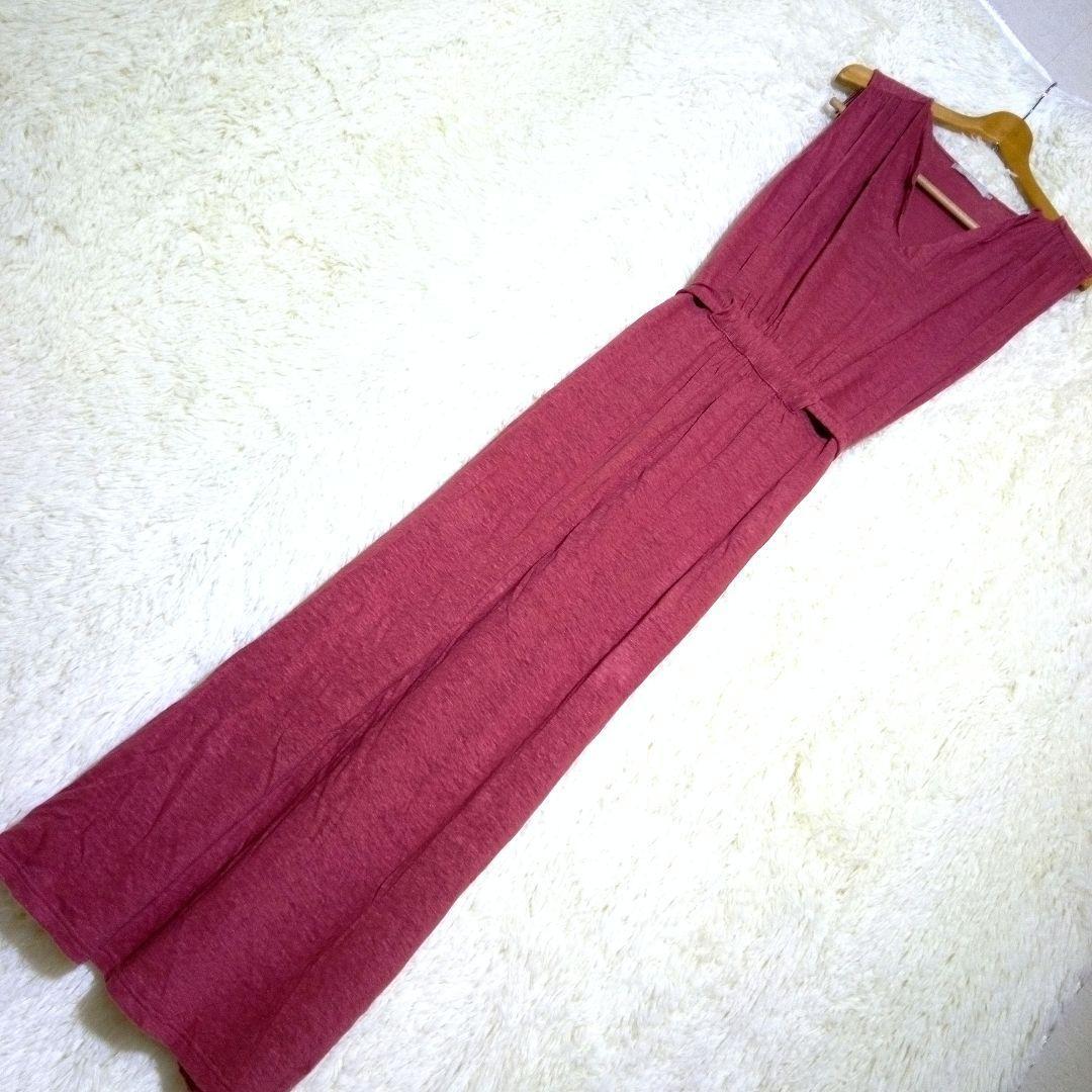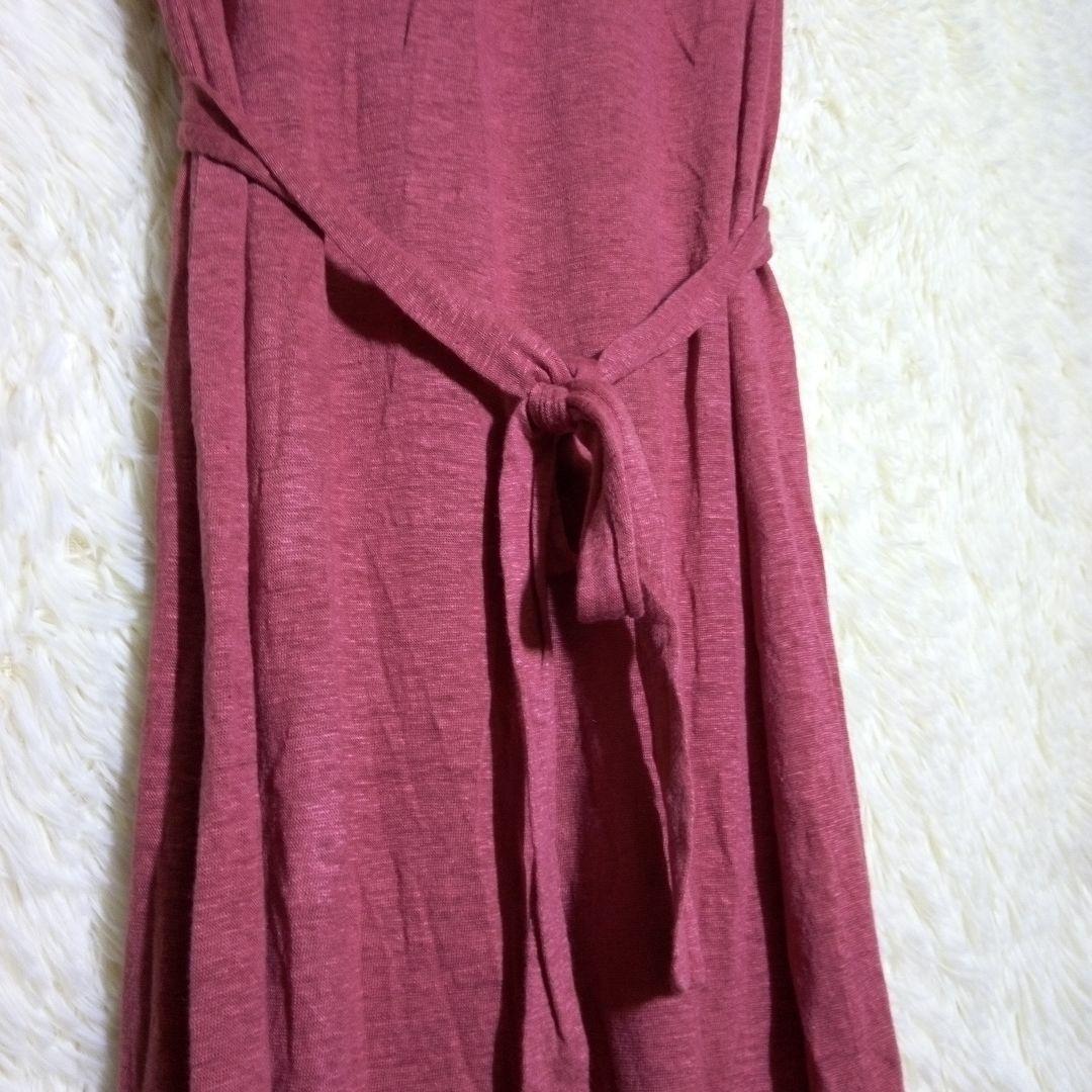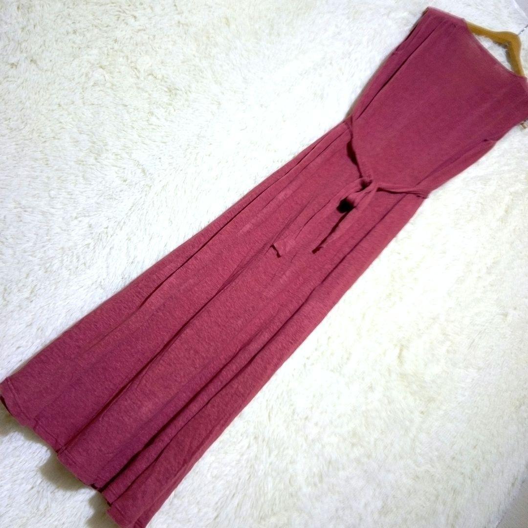 ウエストリボン付きのレンガ色のノースリーブロングワンピース