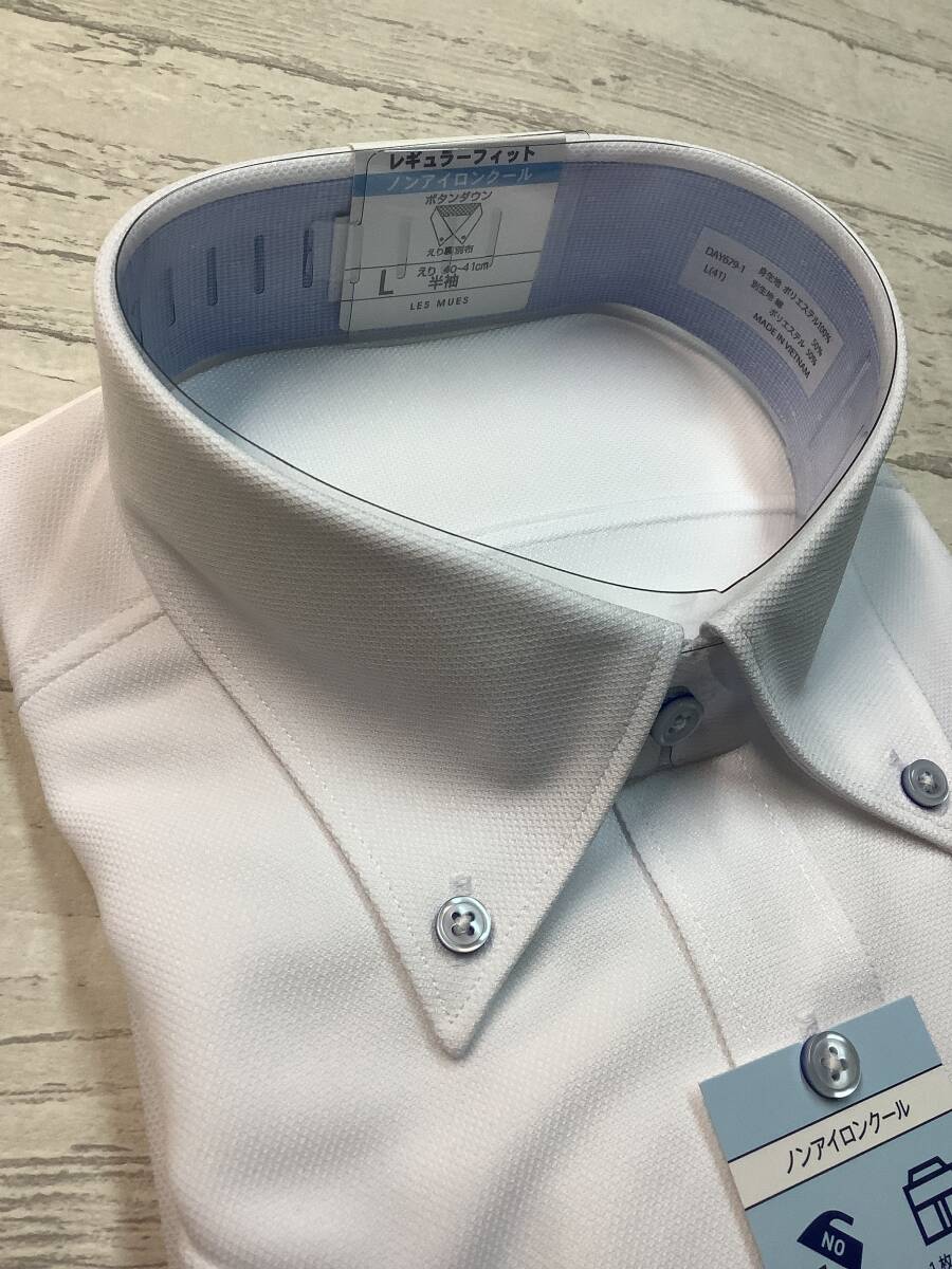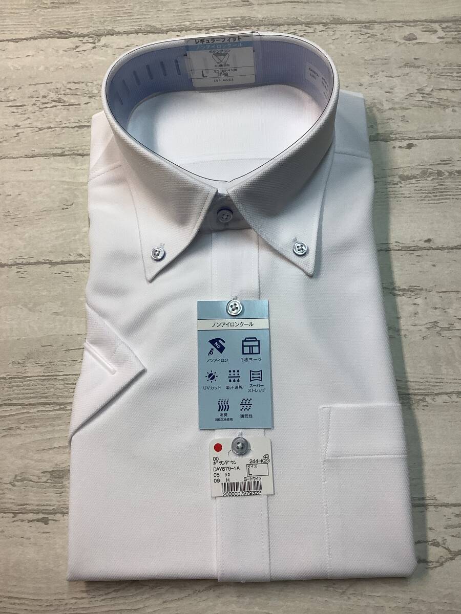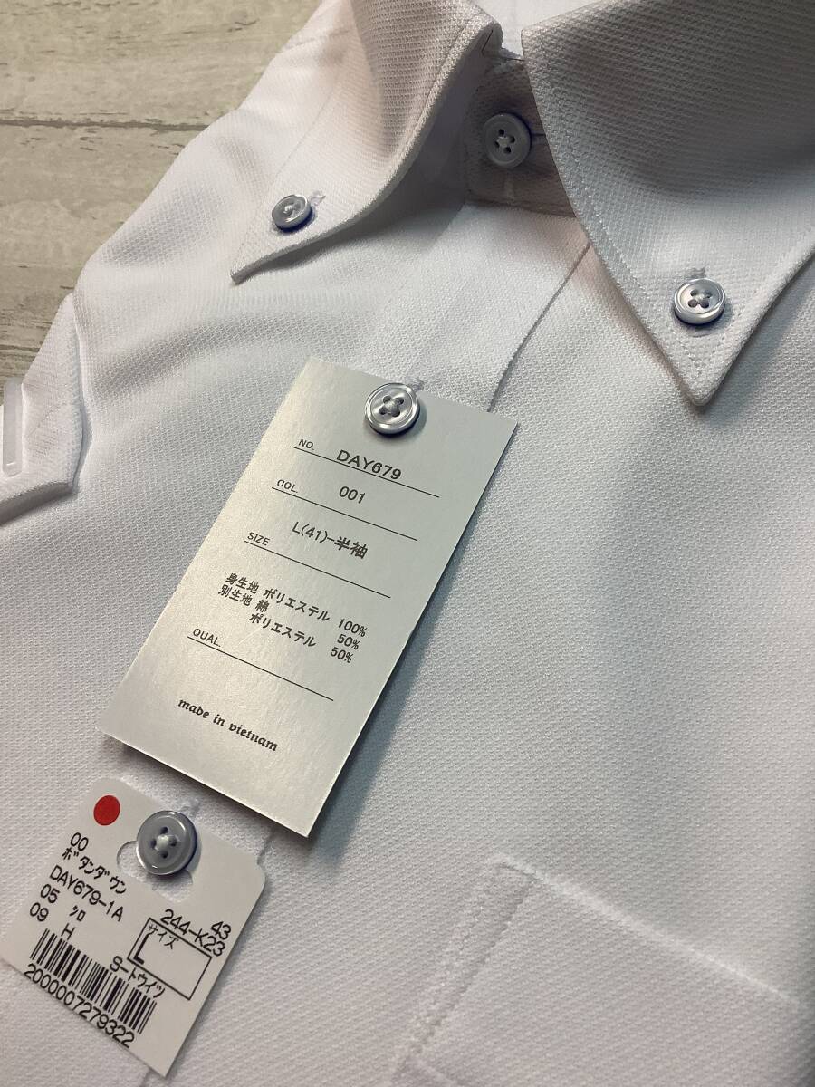 新品未使用★41- 半袖 Lサイズ  ボタンダウン 定価4,990円の品 ノンアイロン スーパーストレッチ 白無地 クールビズ対応