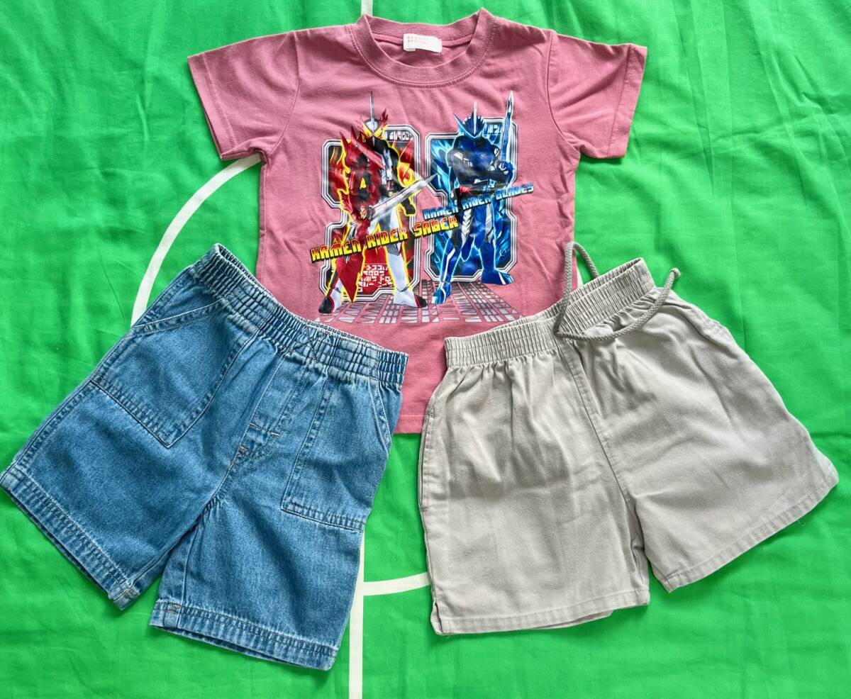 仮面ライダーのTシャツ、カーターズの半ズボン、デニム半ズボンの3点セットです。ユーズドをご理解の上ご入札ください。