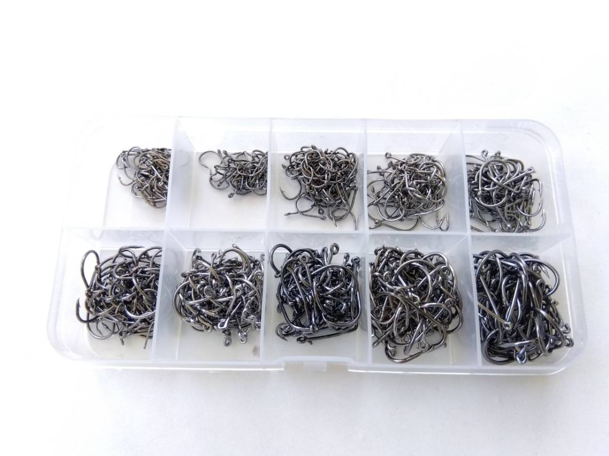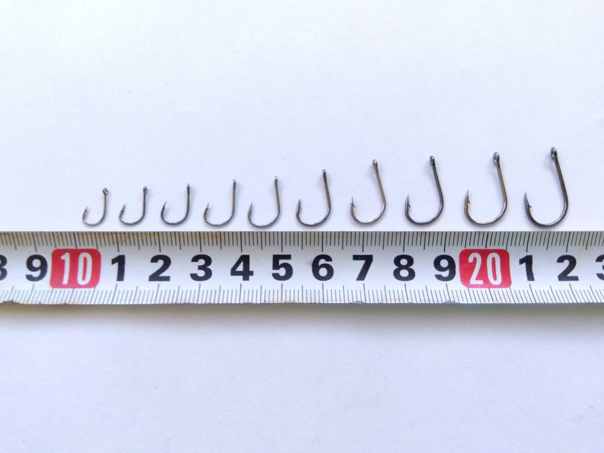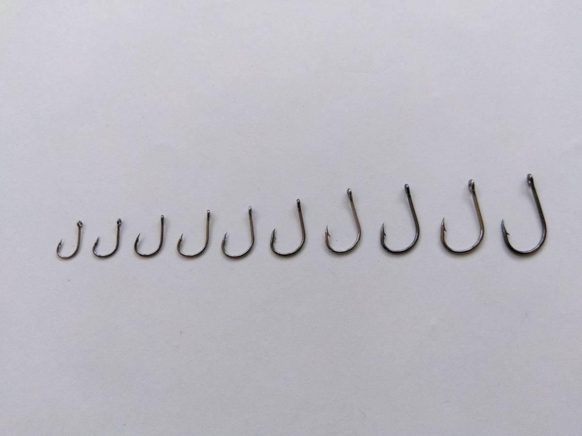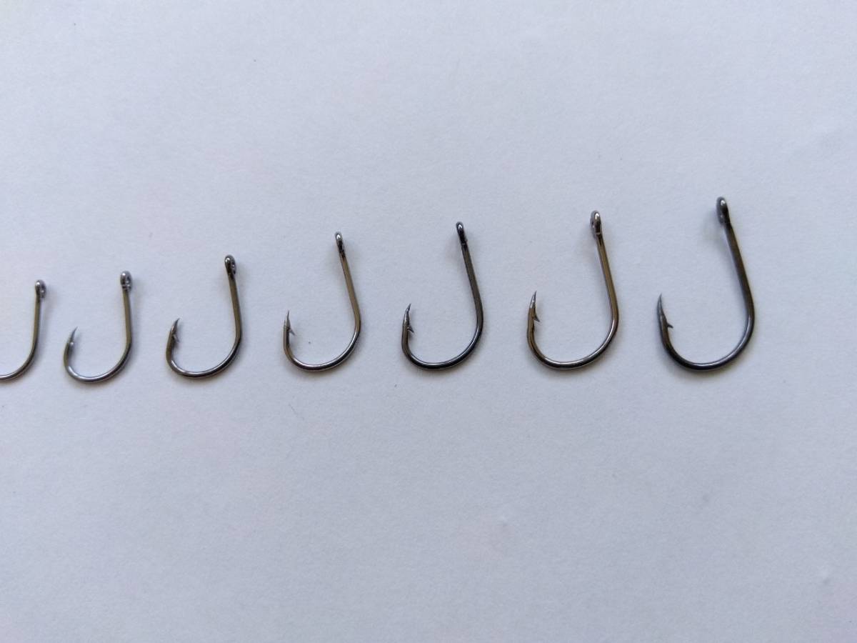 最も大きい針だと、チヌ・グレ・ブラックバス・トラウト(マス)を狙うような針になります。
