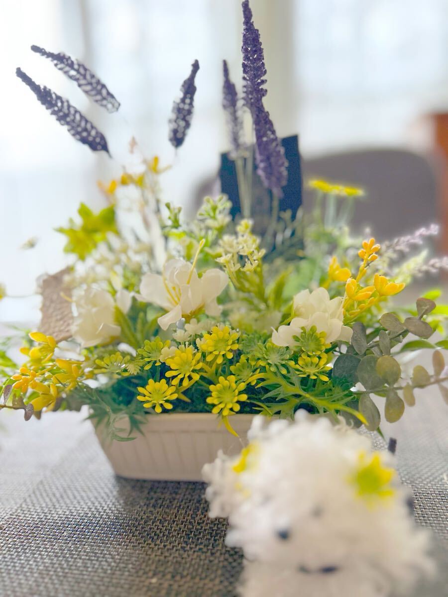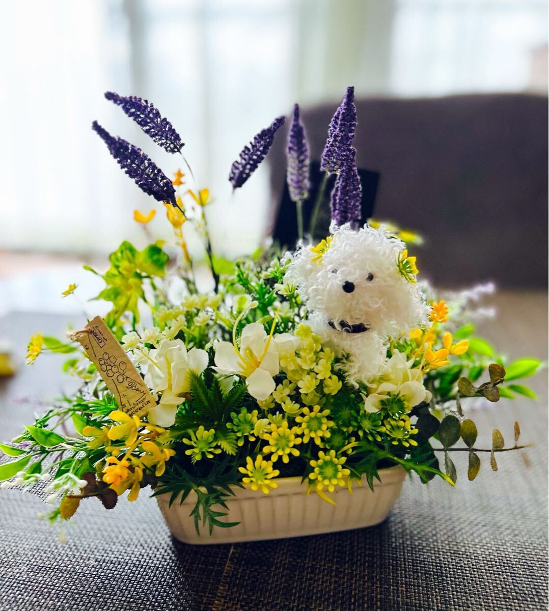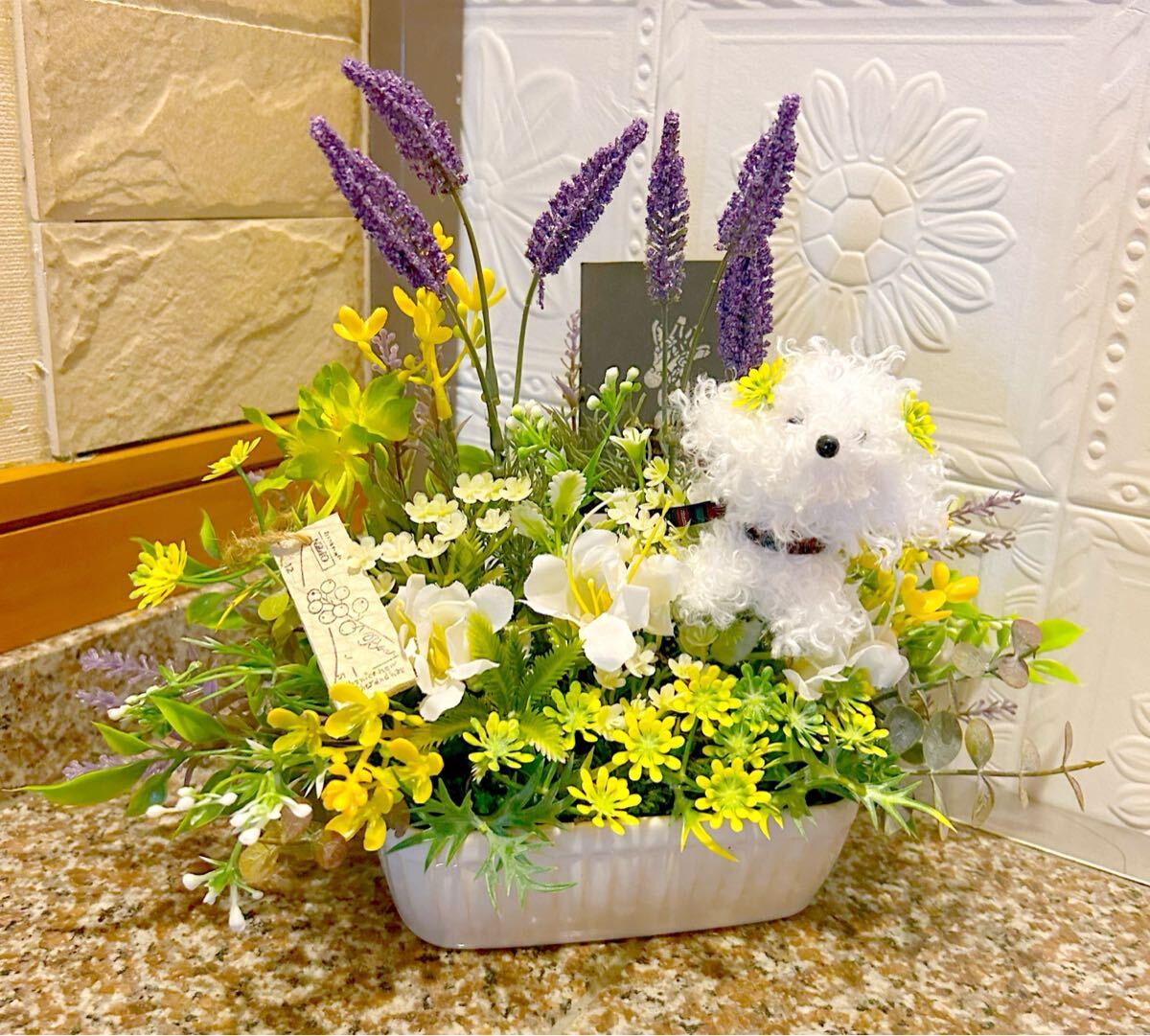 No.95 特価!1,000円〜白いプードルちゃんモールドール入り!白の器爽やかラベンダーアレンジ!ラッピング付き!