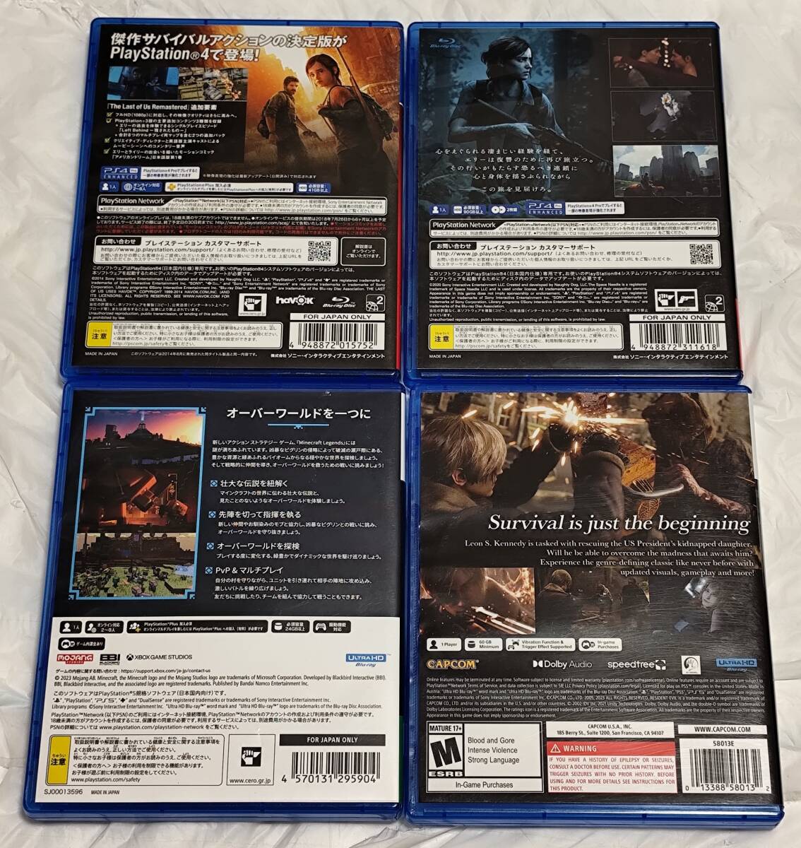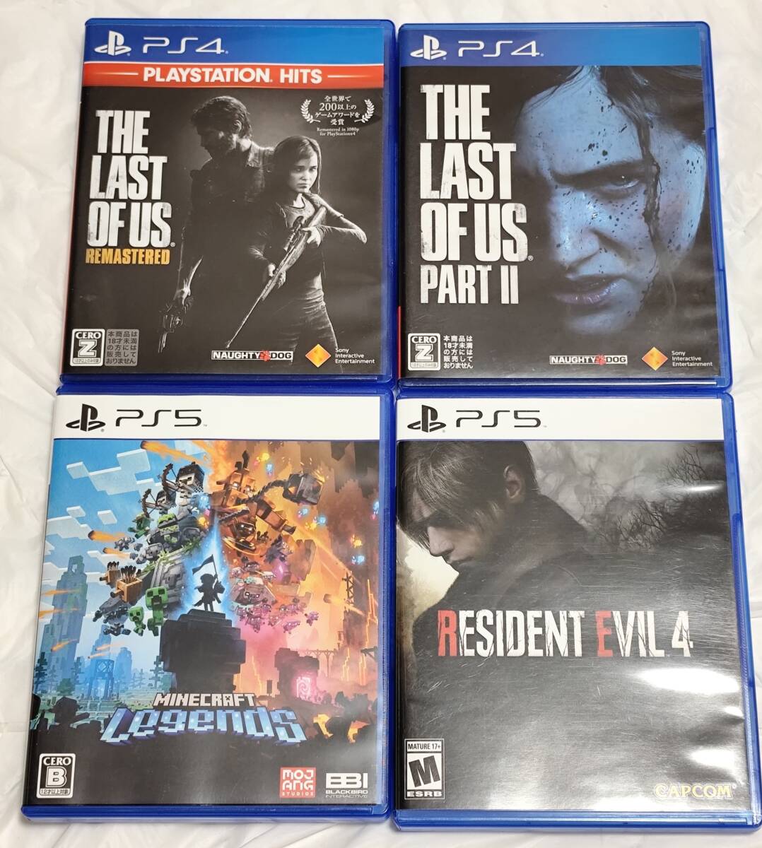 PS4ソフト「THE LAST OF US Ⅰ&Ⅱ」PS5ソフト「RESIDENT EVIL4 北米版」「MINECRAFT Legends」中古品 4本セット