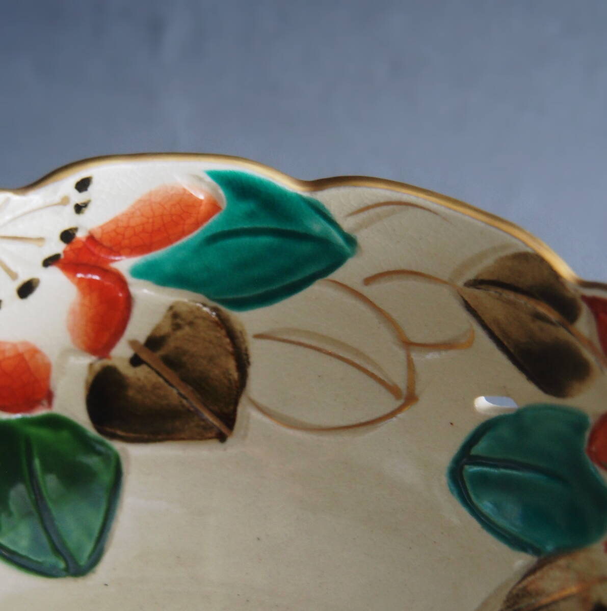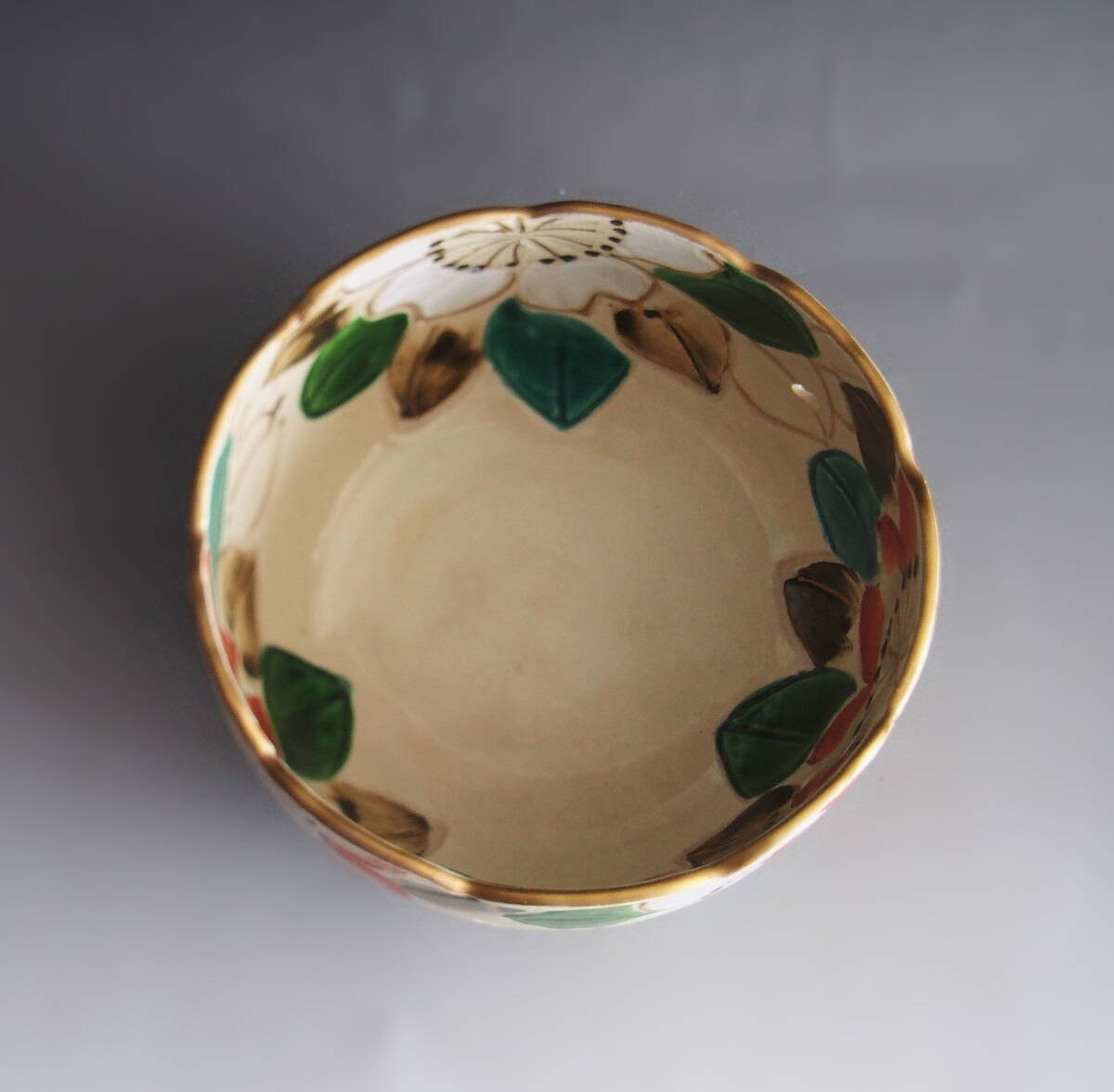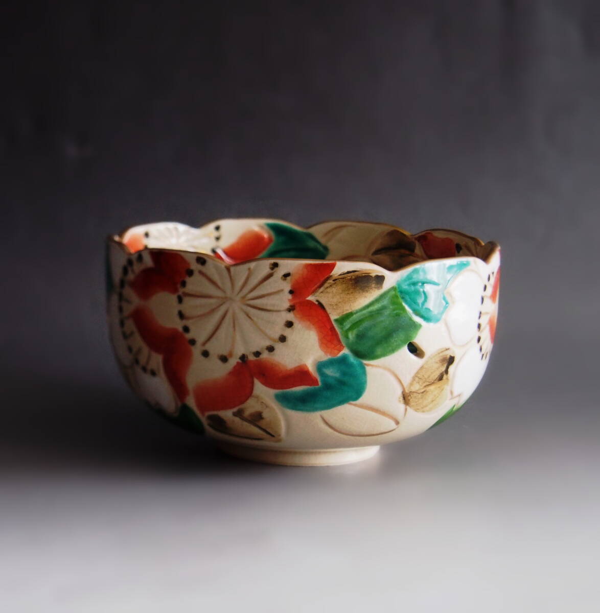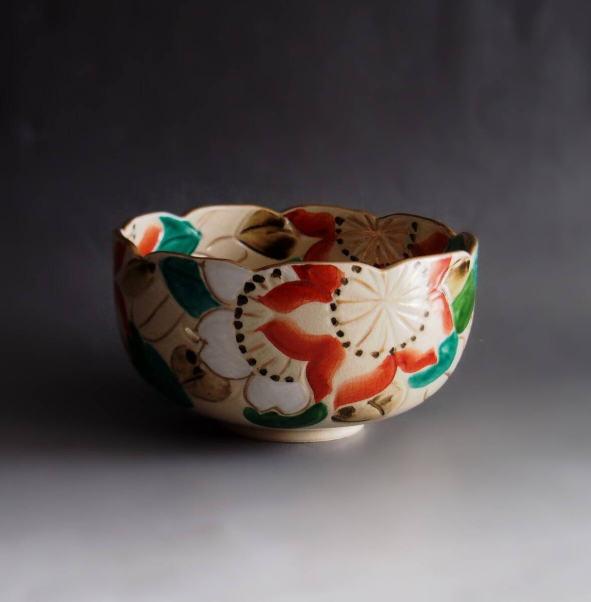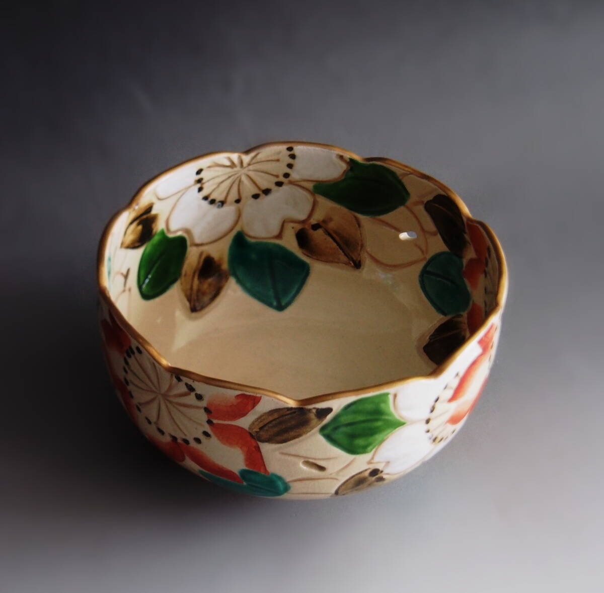 京都の清水焼 雲楽窯で造られた輪花形菓子鉢になります。山茶花の色絵が彩美で金彩と組み合わされ上品な作品となっております。底に「雲楽」と銘あり。宜しく御願い致します。