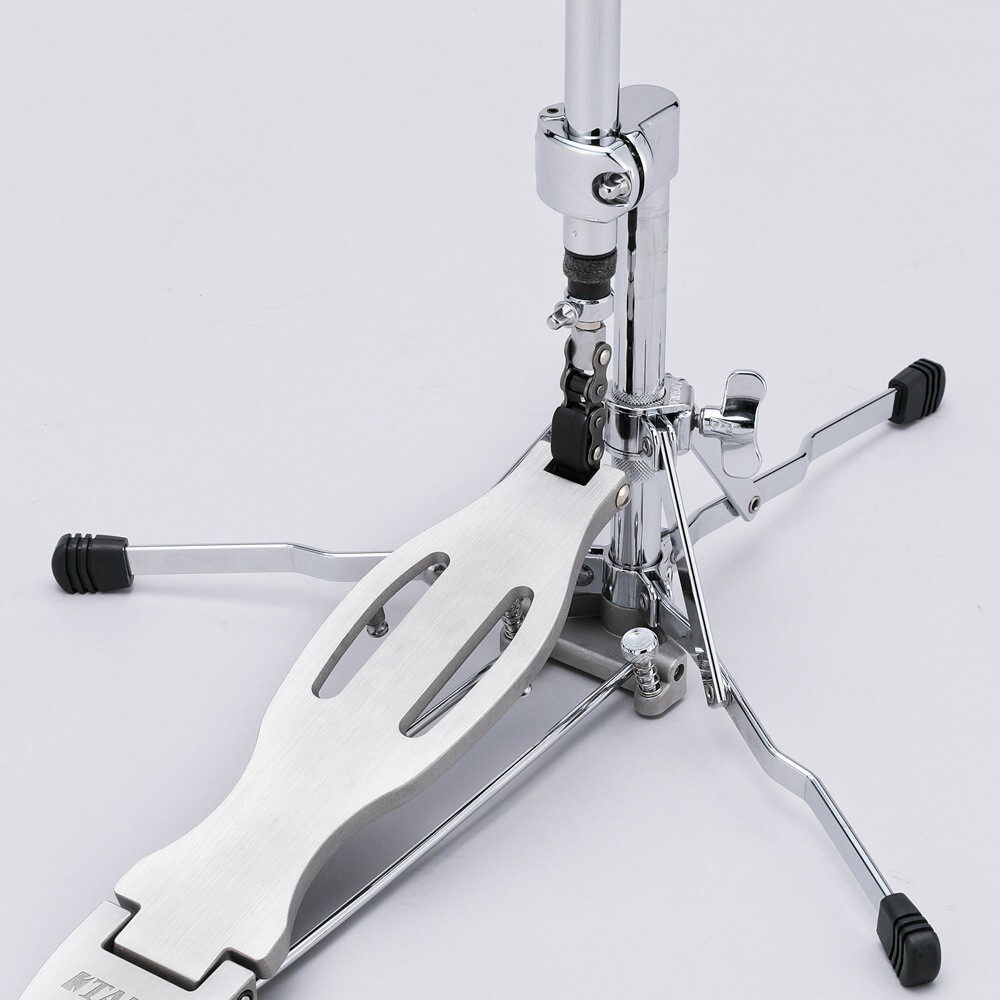 コンパクトなサイズと軽さ、扱いやすいシンプルな構造、そしてヴィンテージ感溢れるルックスを持つフラットベース・タイプのハイハットスタンド。コンパクトながらも安定したセッティングを実現する3脚部や、スプリングテンションとフットボードの角度を独立して調整可能な機構、更には収納時にラジアスロッドをプレート裏に固定することが可能な点など、単なるヴィンテージスタンドのコピーではない、TAMAの技術と工夫を盛り込んだ、新しいフラットベース・ハイハットスタンドです。