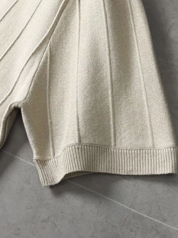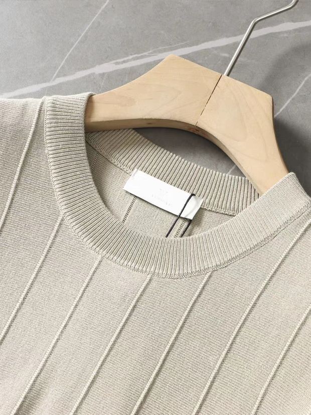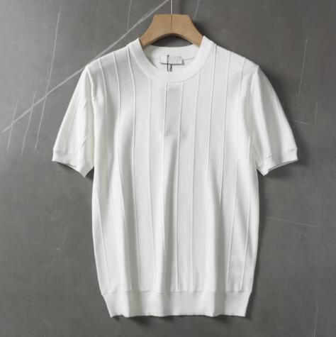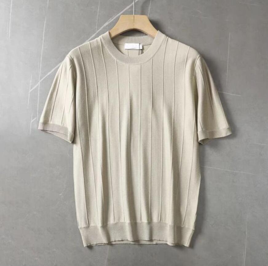 人気上質 新品 Tシャツ サマー ニット メンズ 半袖 テンセル混 夏 薄手 冷感 ストライプ柄 ジャカード 通気性 伸縮性/XL