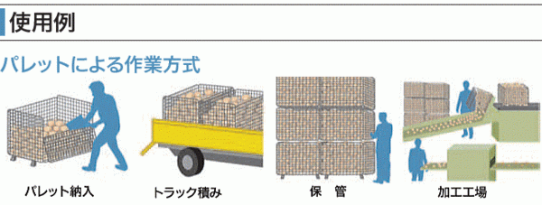 | 軽量ながら強度は抜群。 組立て・折りたたみが簡単で、作業コストを低減。 折りたたんでおけば、保管スペースをとりません。 段積みができ、空間を有効に利用できます。 フォークリフト作業が容易で、作業効率があがります。 | |