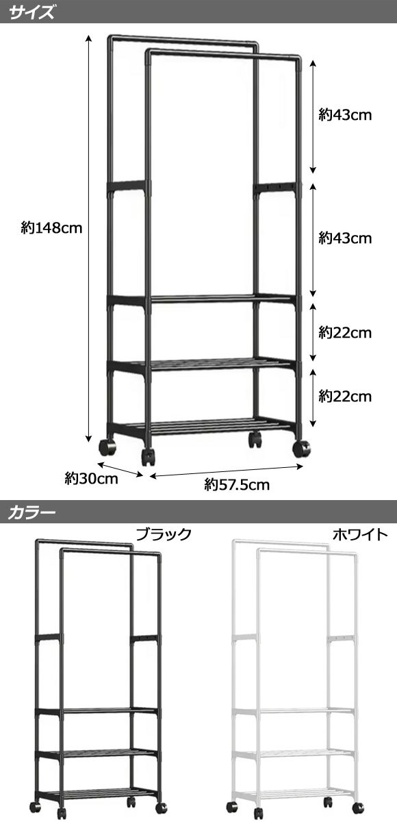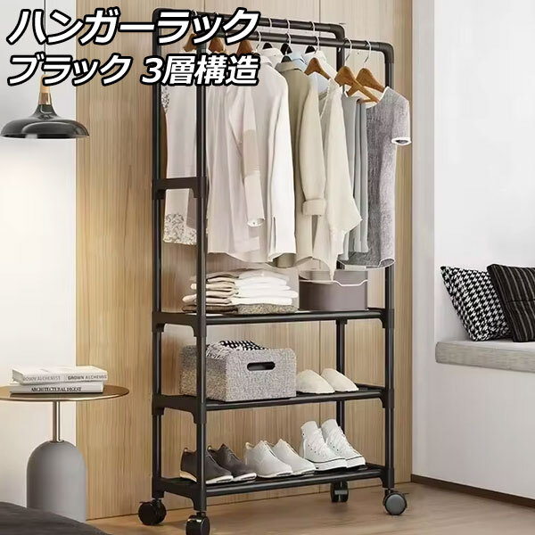 ハンガーラック ブラック 3層構造 キャスター付き 収納力抜群のダブルハンガータイプ AP-UJ1126-BK