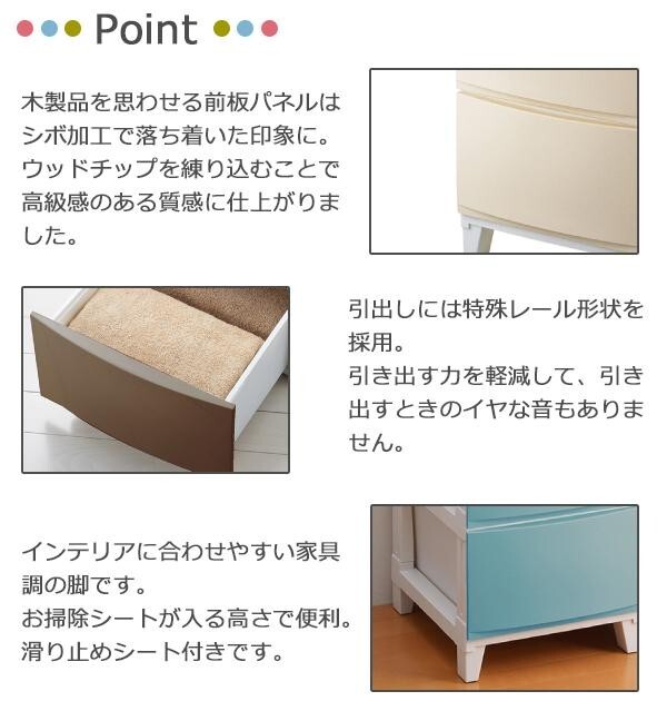 中が見えないので、リビングや寝室に置いてもしっくり馴染みます。特殊レール形状で引き出す力を軽減し、イヤな音もありません。オールプラスチック製ですので、湿気の多い脱衣所などでも活躍します!! |