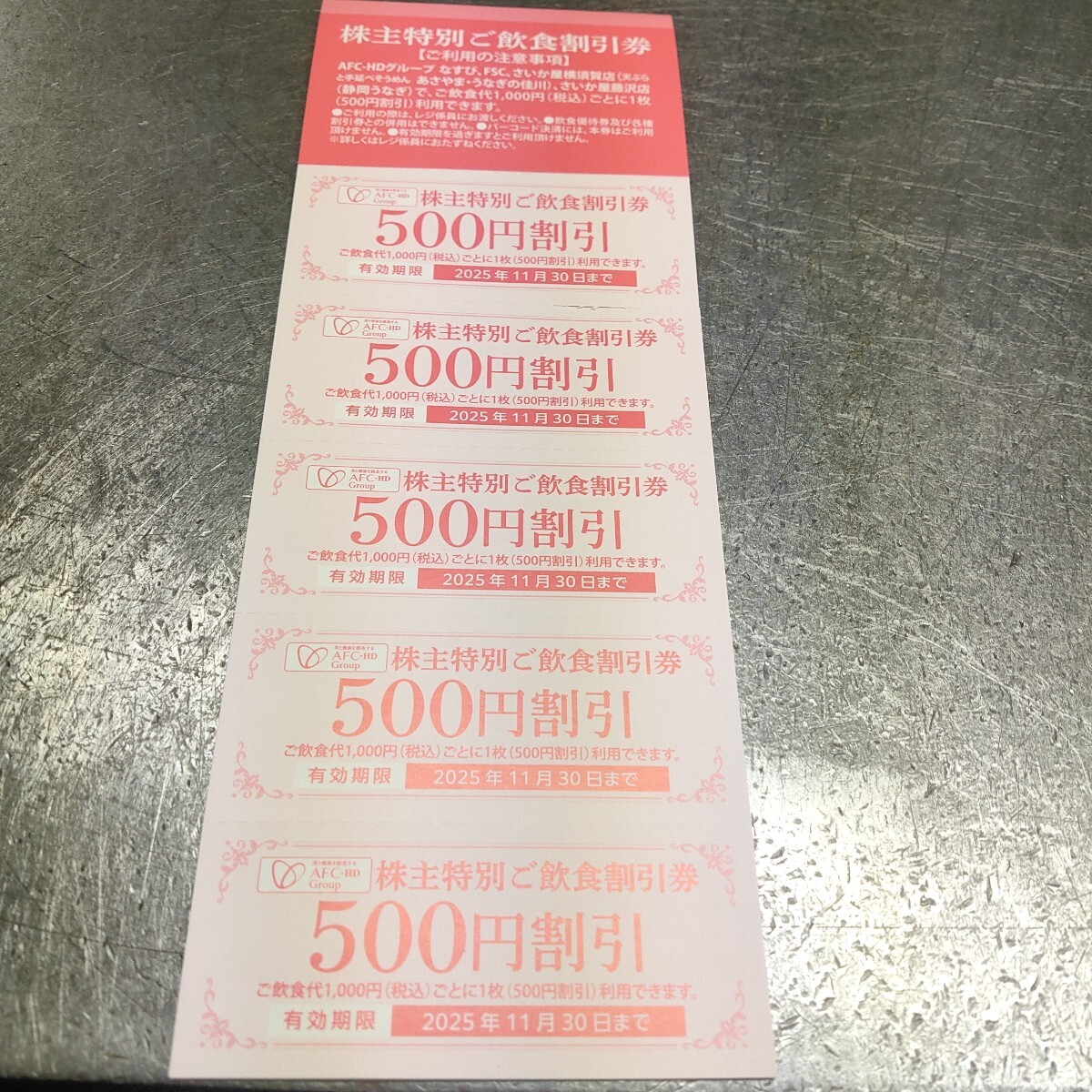 AFC株主優待です。飲食割引券500円×10枚となります。
