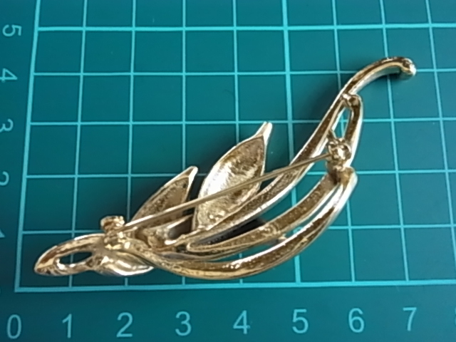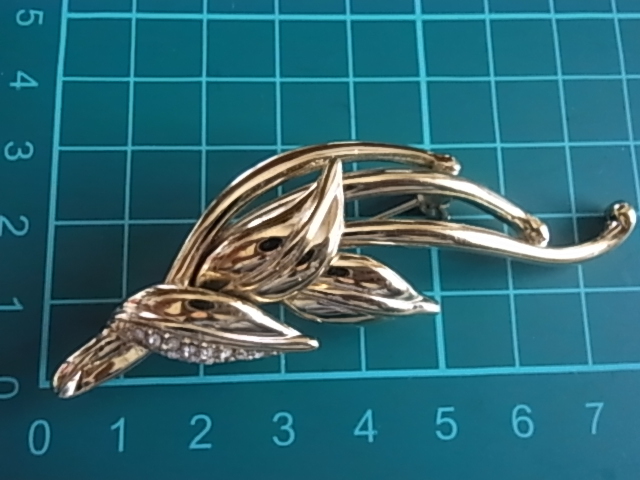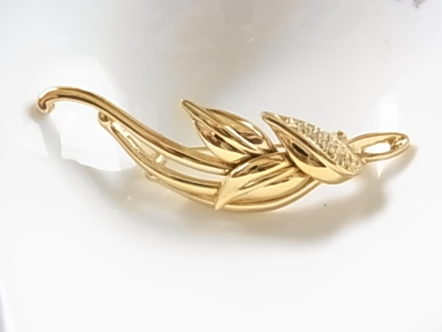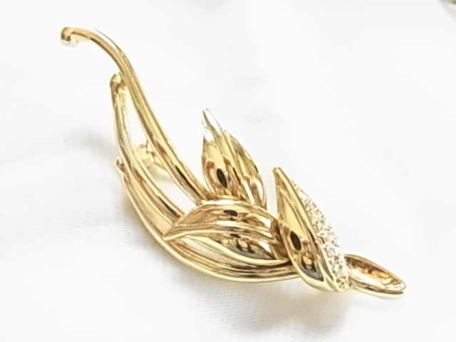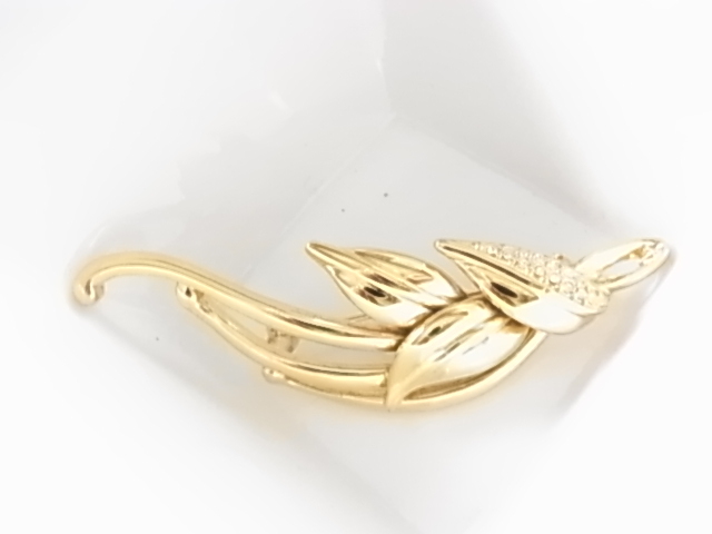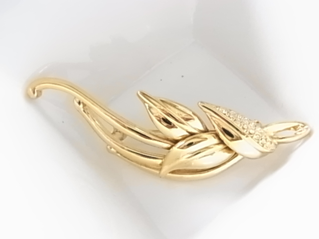 ■ビンテージ/ヴィンテージ ゴールドトーン 金色トーンにクリアラインストーンが煌く リーフデザイン 葉のモチーフの素敵なブローチ