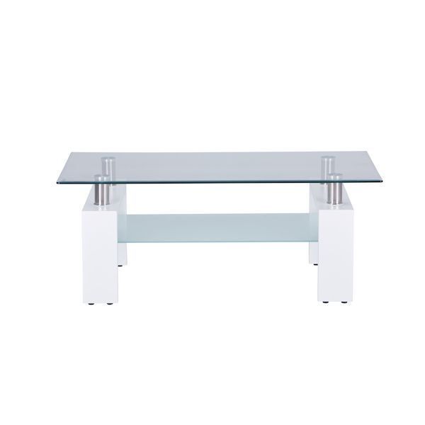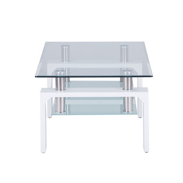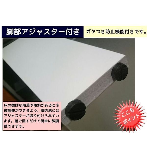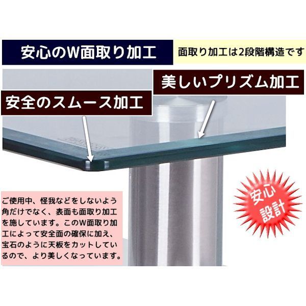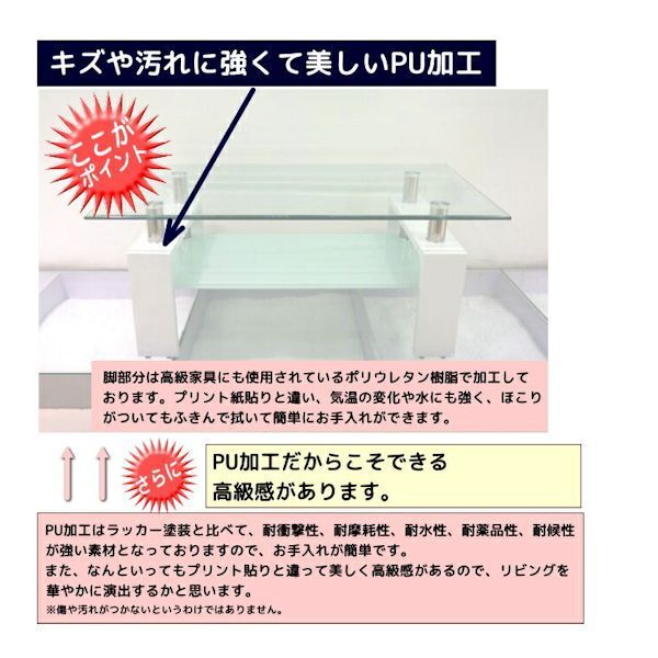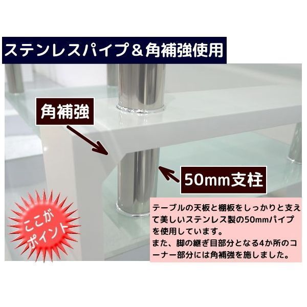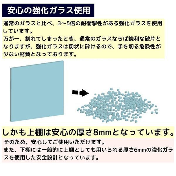 | 構成部材 | ガラス・厚さ8mm強化ガラス(上棚)・透明、 厚さ6mm強化ガラス(下棚)・ホワイト 脚部・MDF(PU加工)・白、ステンレス |