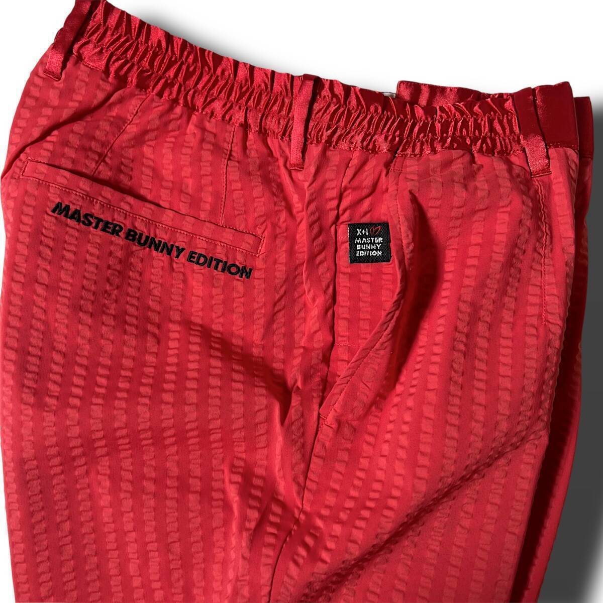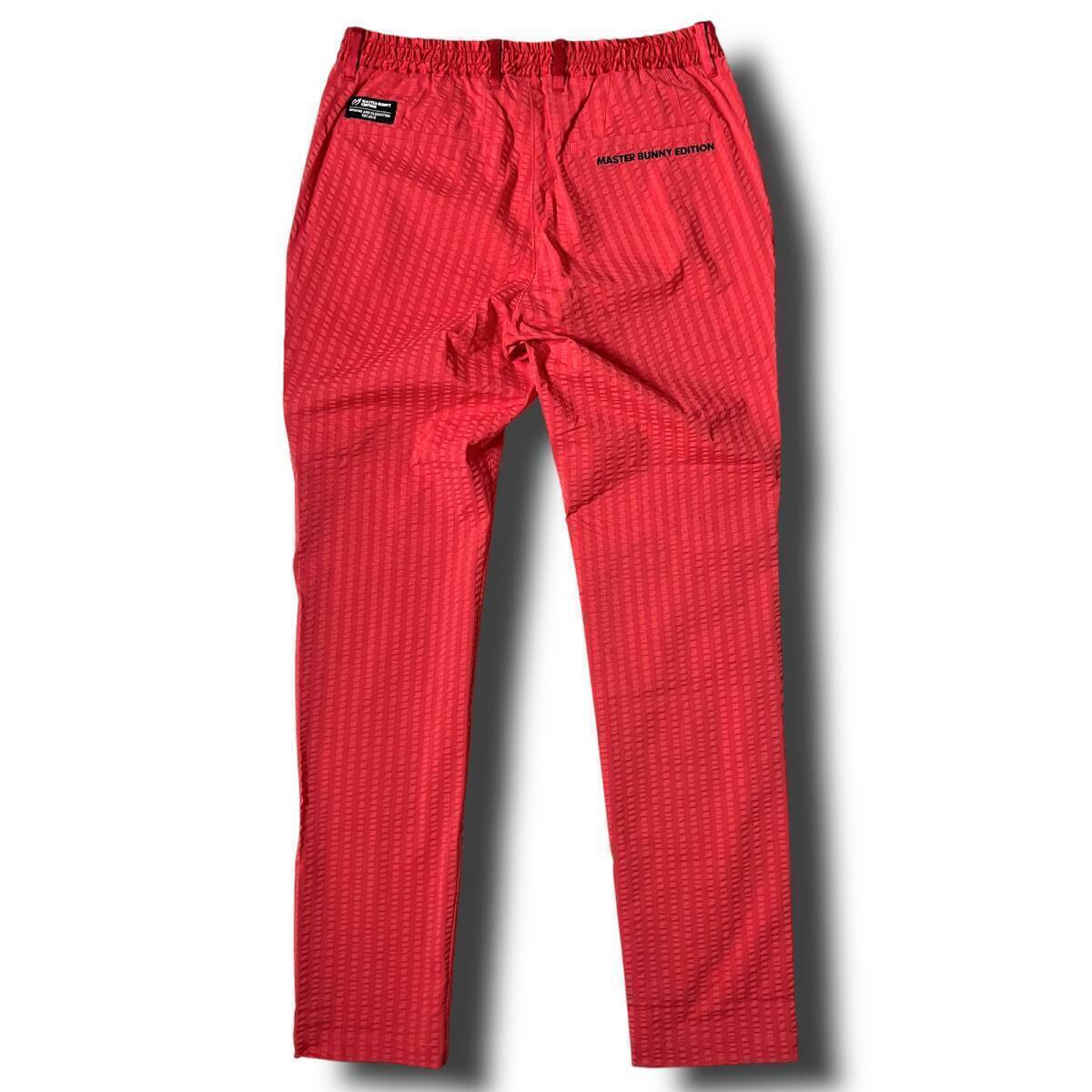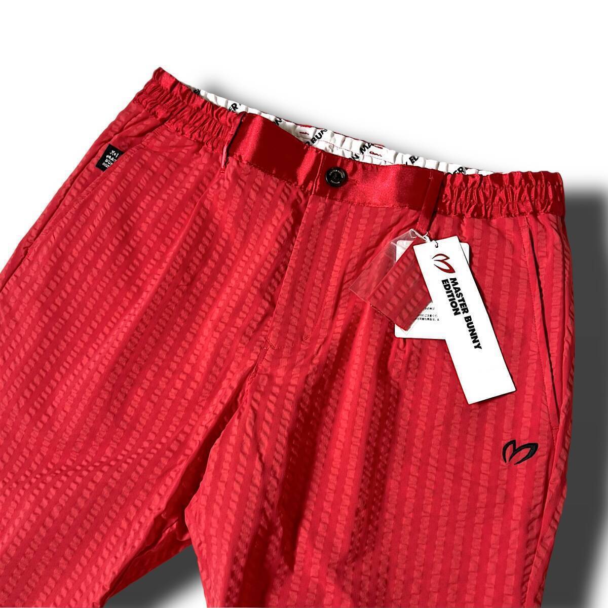 タイトル 新品 MASTER BUNNY EDITION マスターバニー 定価2.4万 パーリーゲイツ取扱 清涼素材 速乾 通気性 シアサッカー ロゴ刺繍 ウエストゴム テーパードパンツ ゴルフウェア 5 L 相当 GOLF メンズ スポーツ レジャー 普段使い タウンユース カジュアル 春夏 SS 150 レッド系