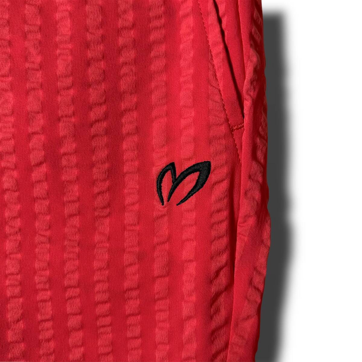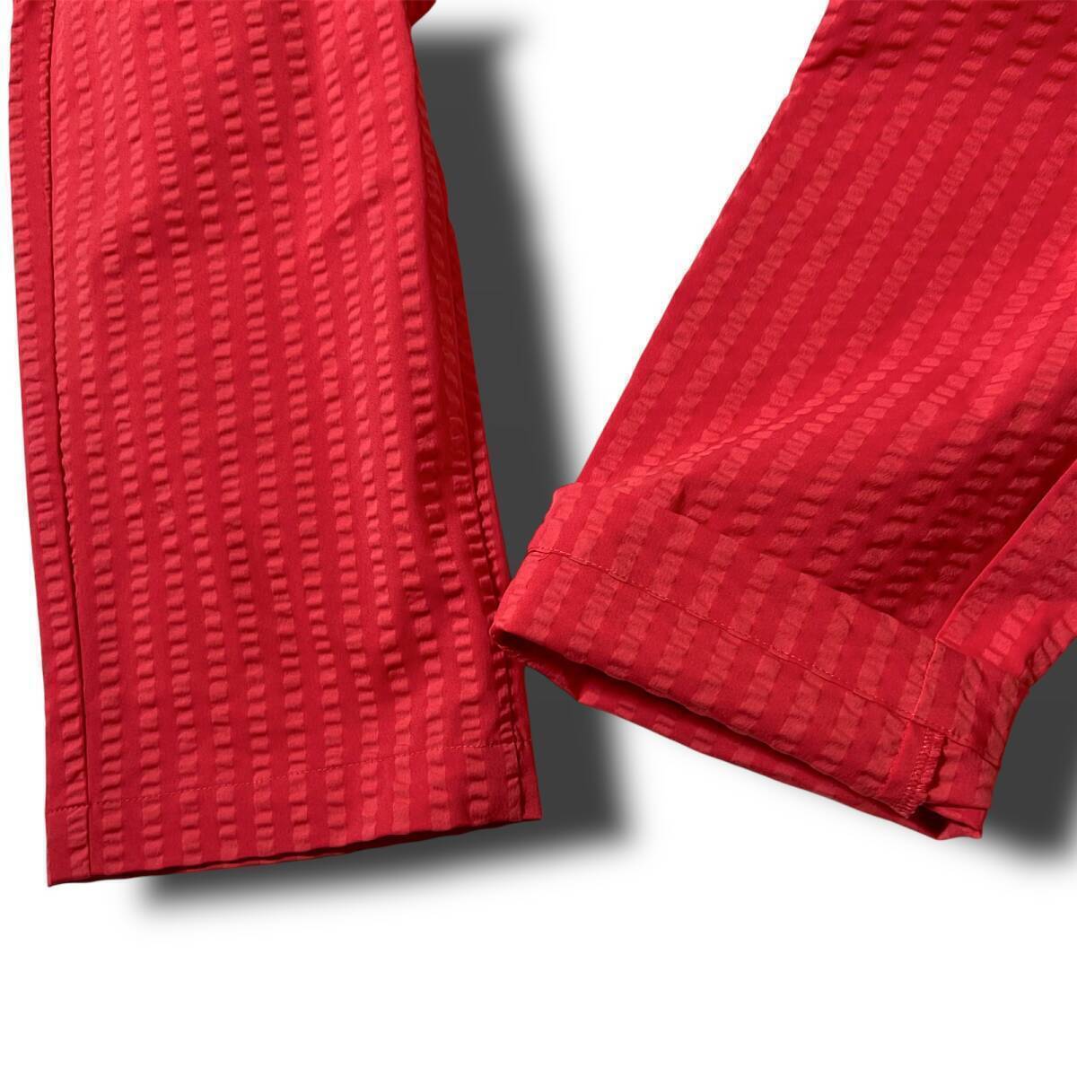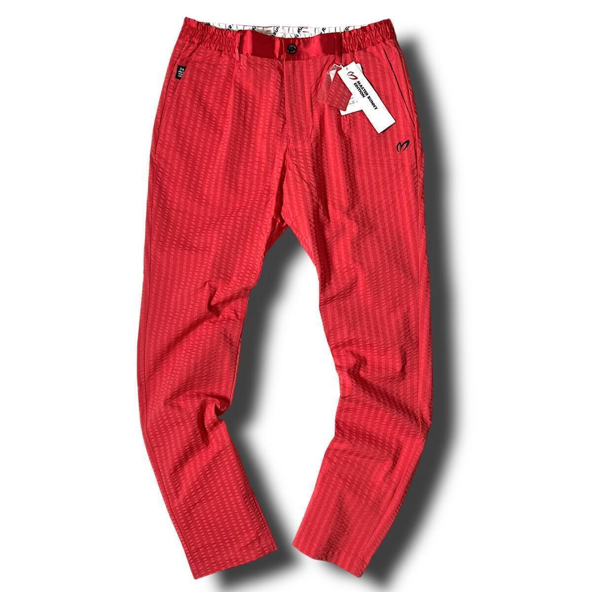 タイトル 新品 MASTER BUNNY EDITION マスターバニー 定価2.4万 パーリーゲイツ取扱 清涼素材 速乾 通気性 シアサッカー ロゴ刺繍 ウエストゴム テーパードパンツ ゴルフウェア 5 L 相当 GOLF メンズ スポーツ レジャー 普段使い タウンユース カジュアル 春夏 SS 150 レッド系