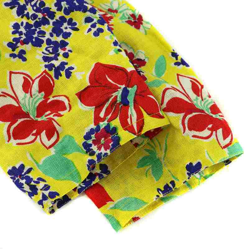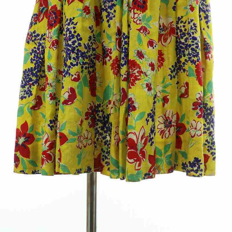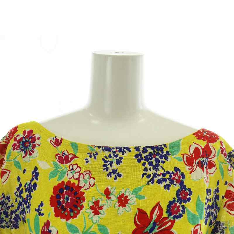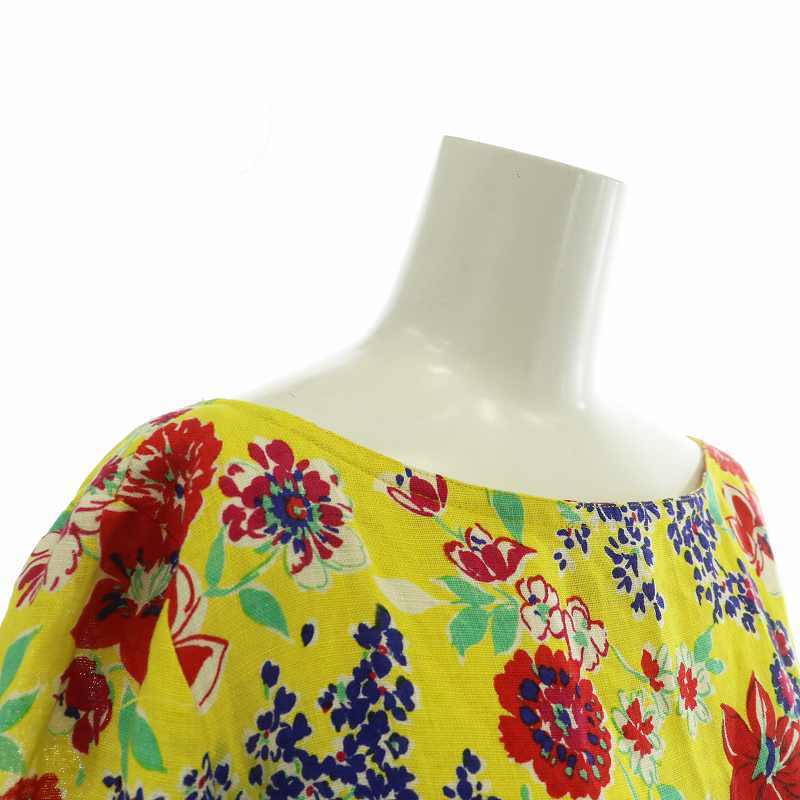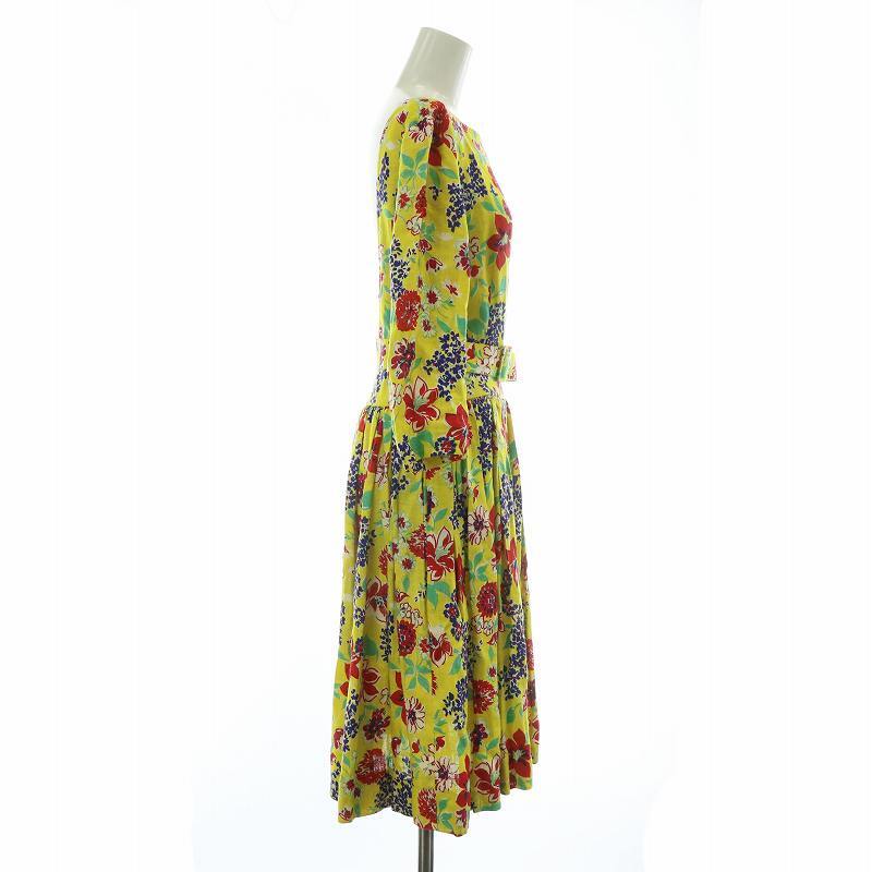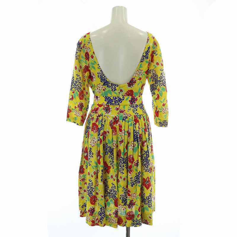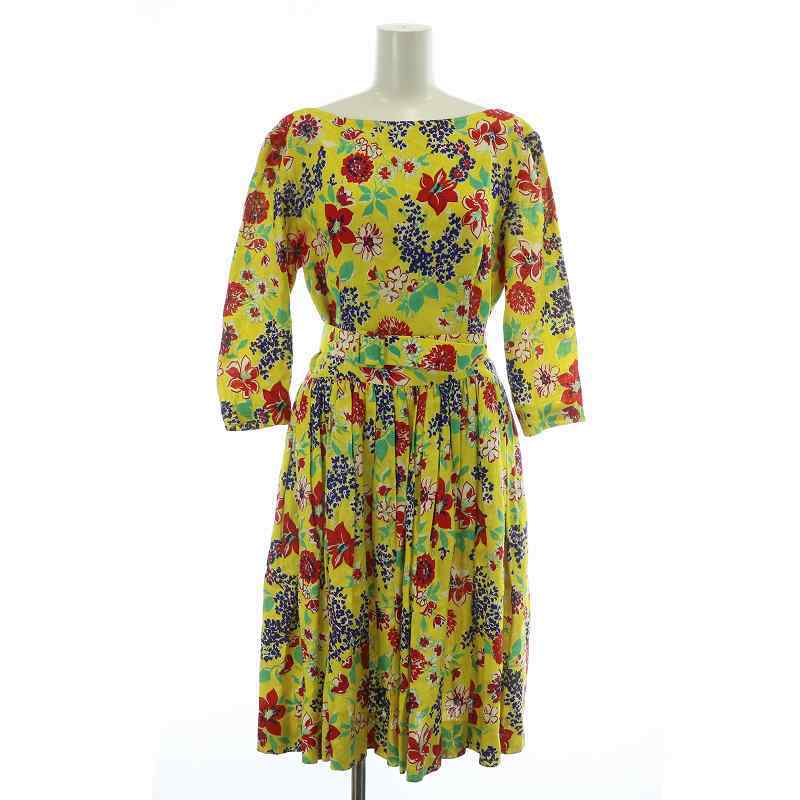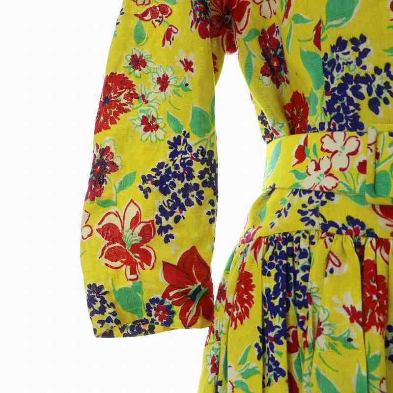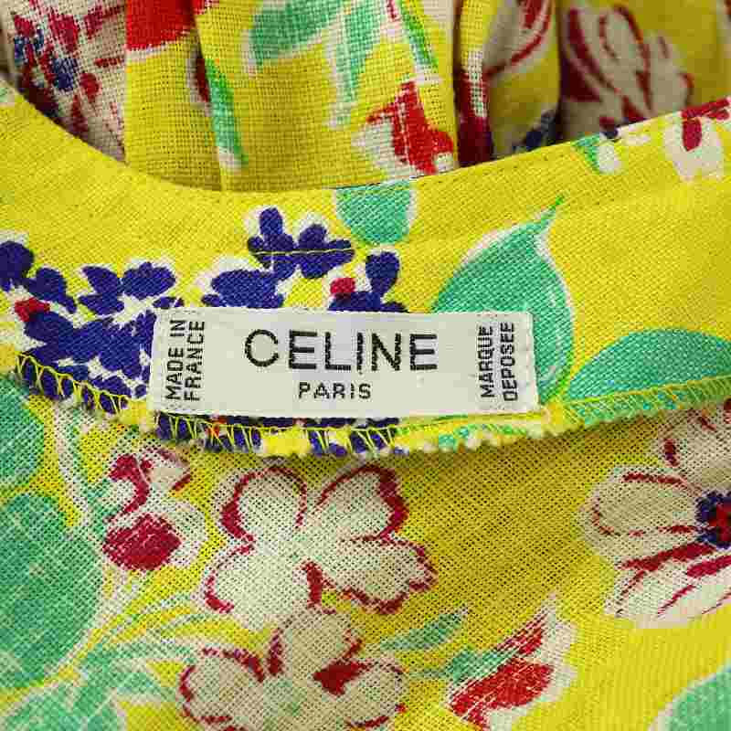 セリーヌ CELINE ヴィンテージ ワンピース リネン 麻100% 七分袖 ひざ丈 ギャザー 花柄 総柄 オープンバック ベルト付き 40 L 黄色