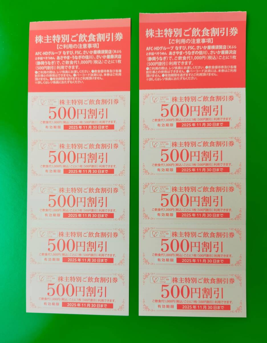 AFC-HDグループ株主優待 特別ご飲食優待券 5000円分です。 なすび FSC さいか屋横須賀店(あさやま・うなぎの佳川)さいか屋藤沢店(静岡うなぎ)で1000円ごとに1枚(500円分)使えます。有効期限は、2025年11月30日までです。