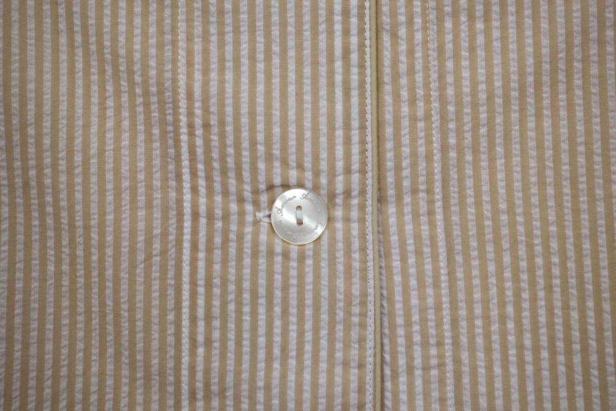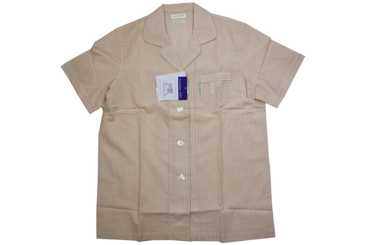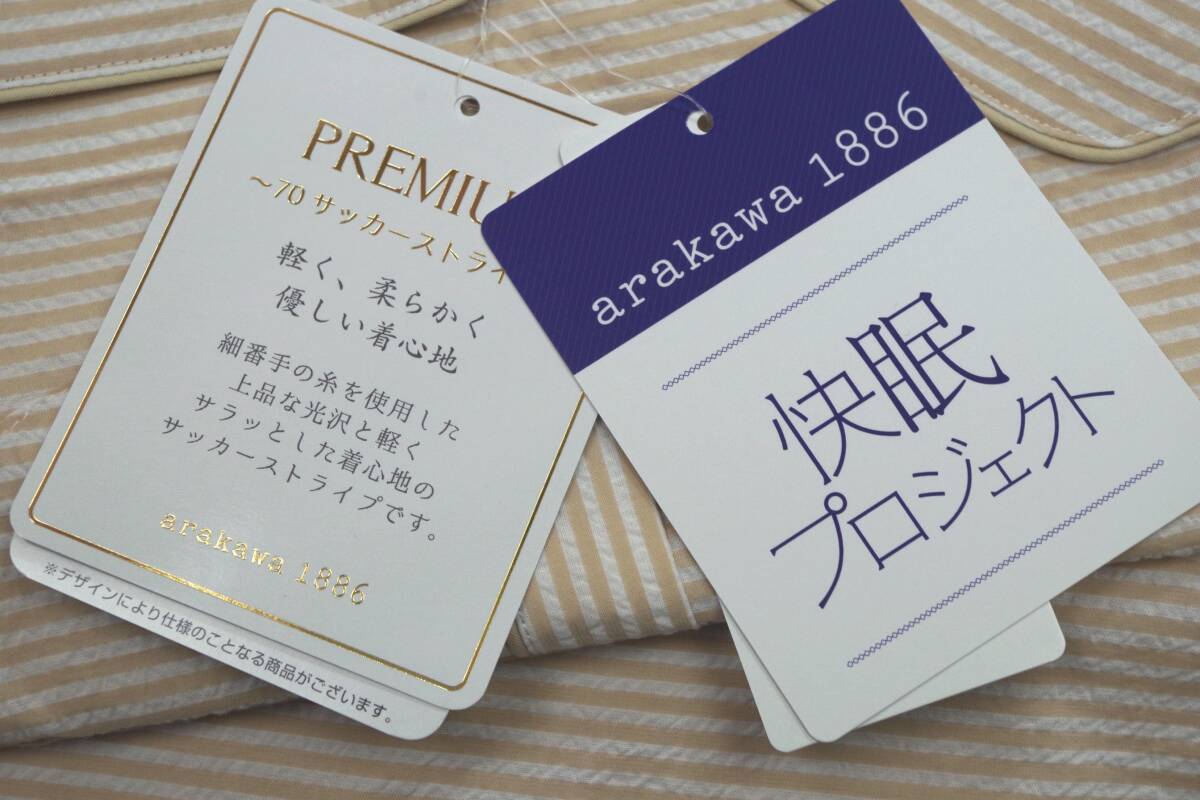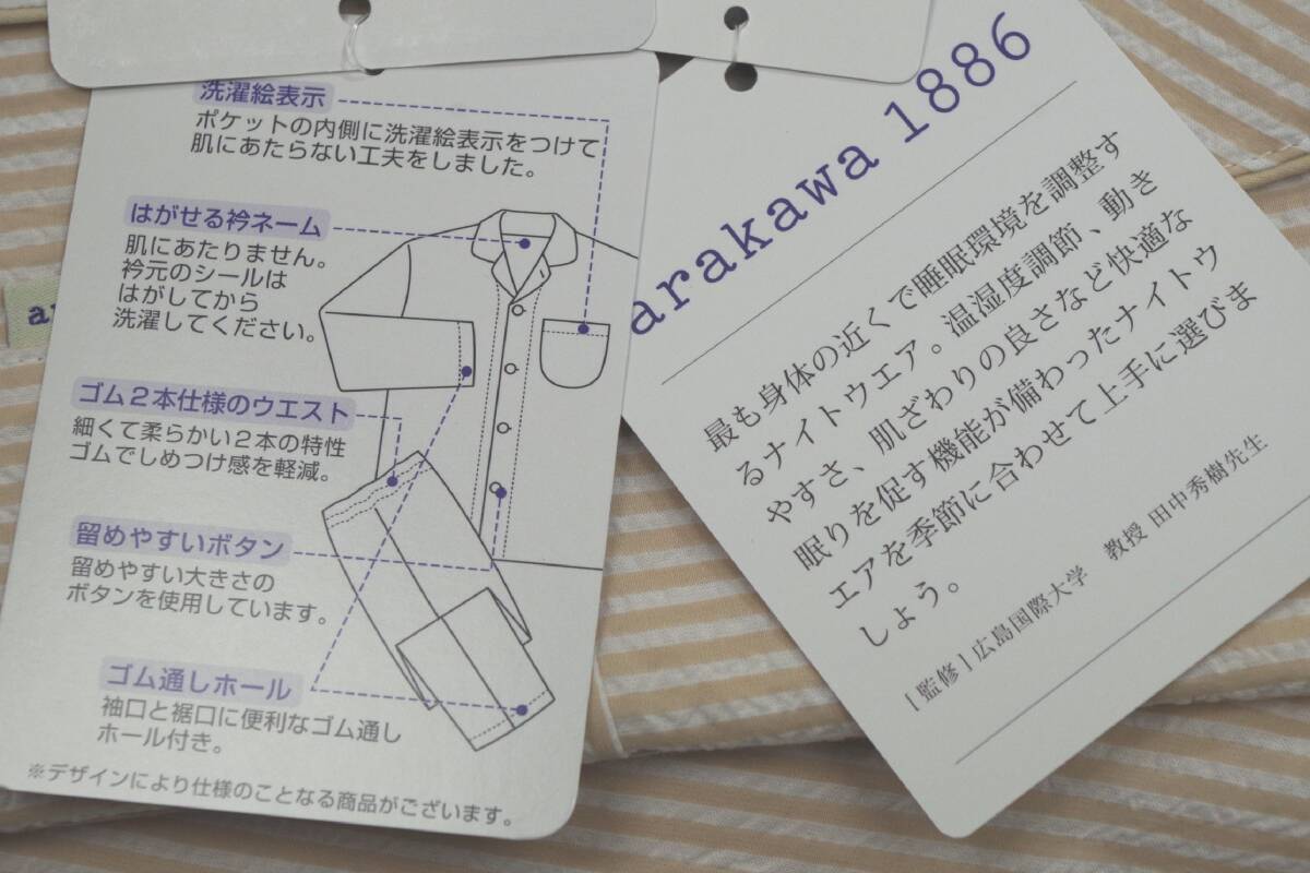 arakawa1886快眠プロジェクトは温度調節、動きやすさ、肌ざわりなど睡眠環境を調整するナイトウェアです。 素材は綿100%の軽く柔らかいプレミアム素材、70サッカーストライプが使用されています。 サイズはL。前開き、半袖、ロングパンツ。バスト86-94㎝。色はベージュ。日本製です。