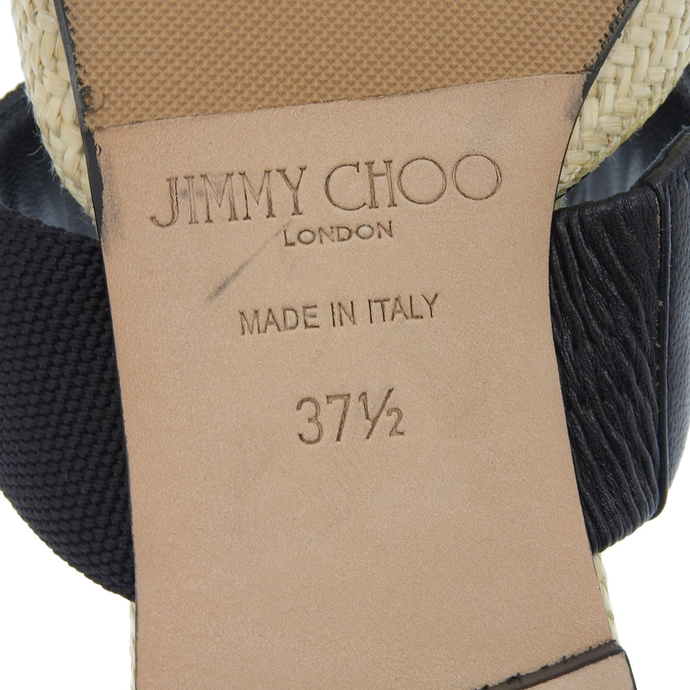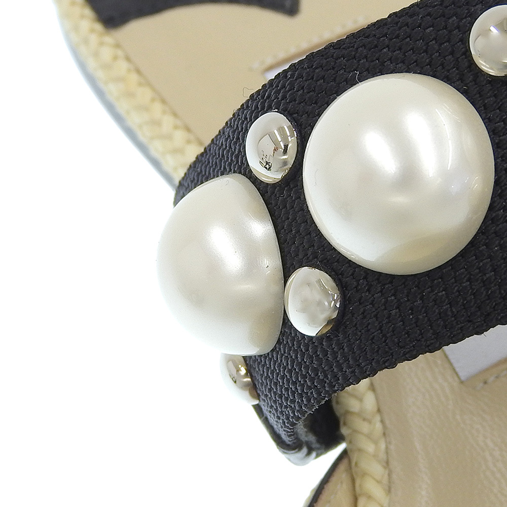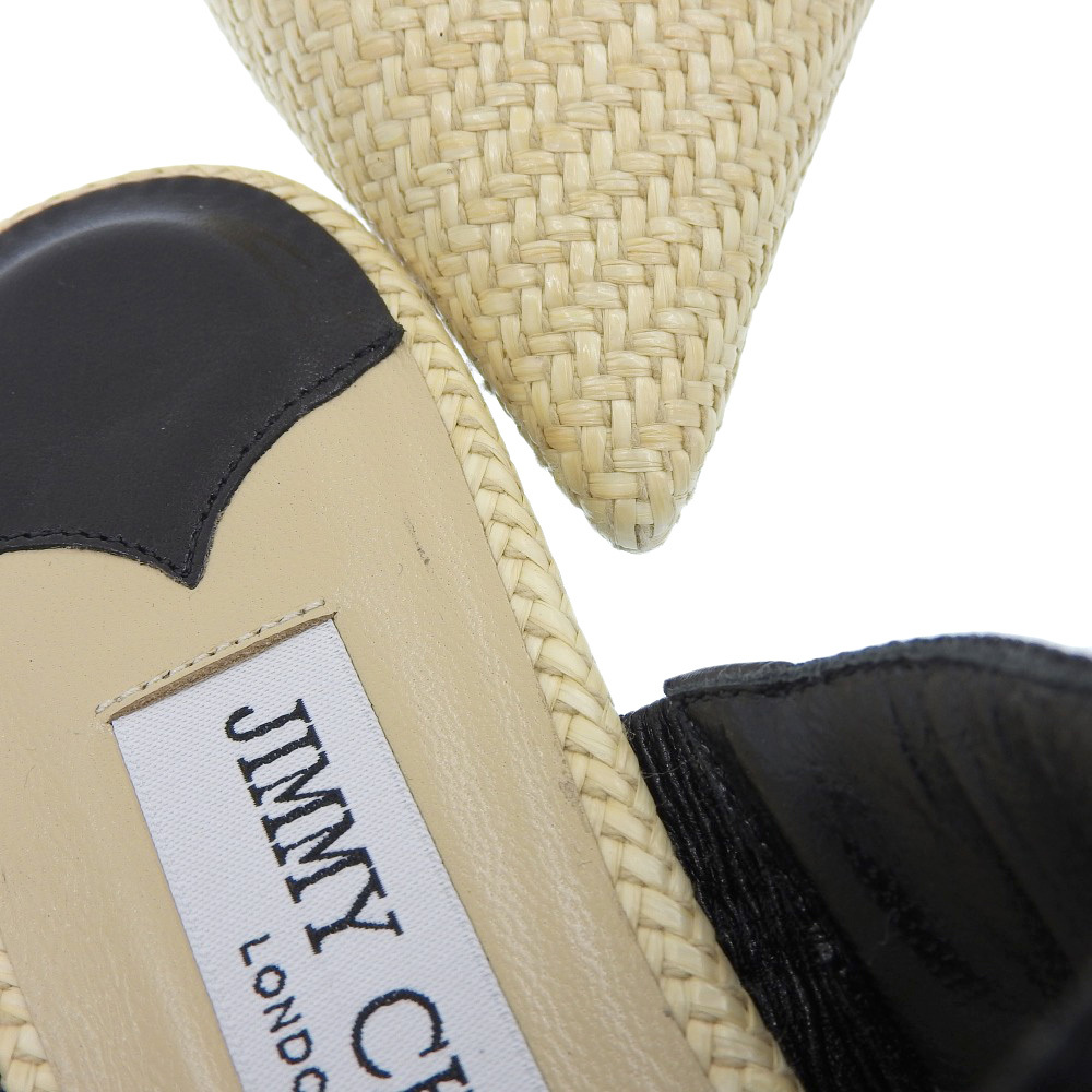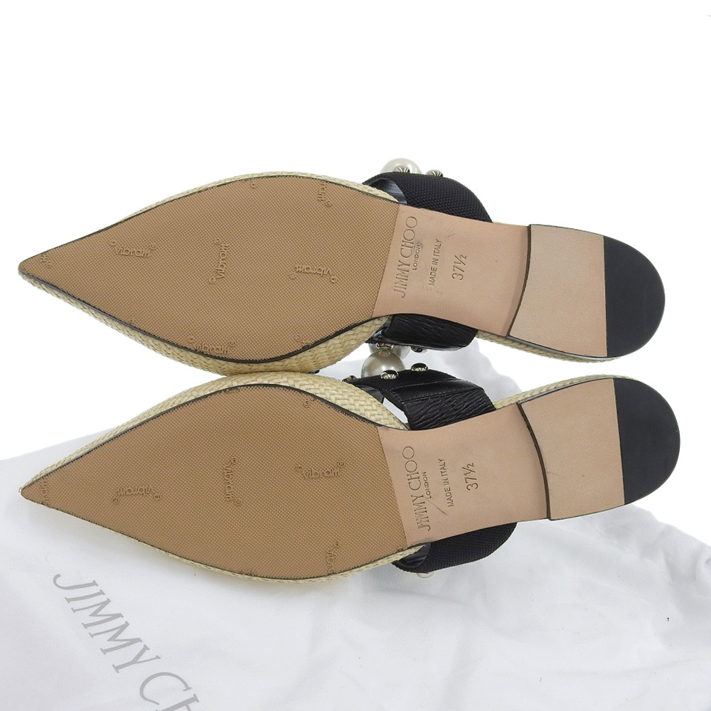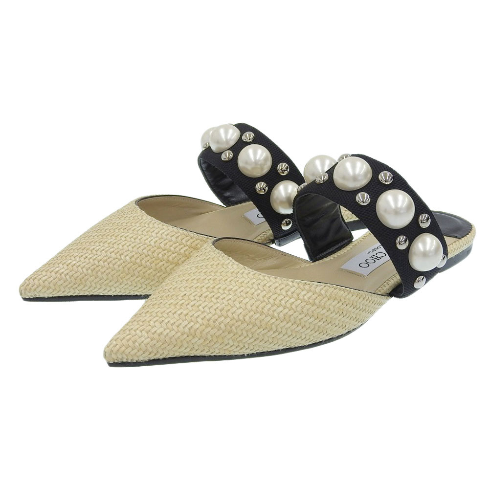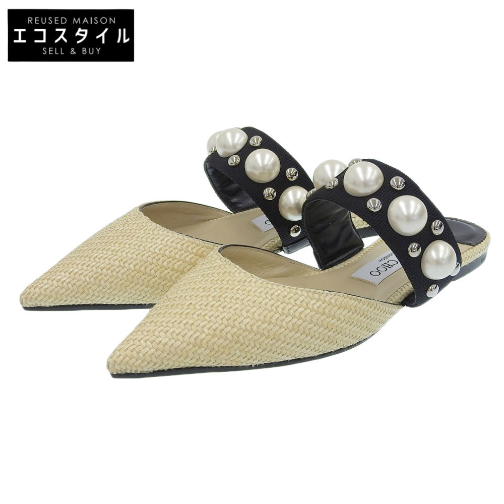 商品名 ジミーチュウ 新品同様 BASETTE FLAT ラフィア パール ポインテッドトゥ サンダル レディース ベージュ×ブラック 37 1/2シューズ