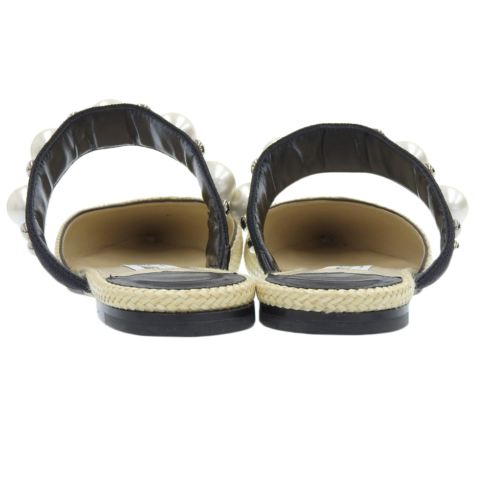 新品同様 JIMMY CHOO ジミーチュウ BASETTE FLAT ラフィア パール ポインテッドトゥ サンダル レディース ベージュ×ブラック 37 1/2