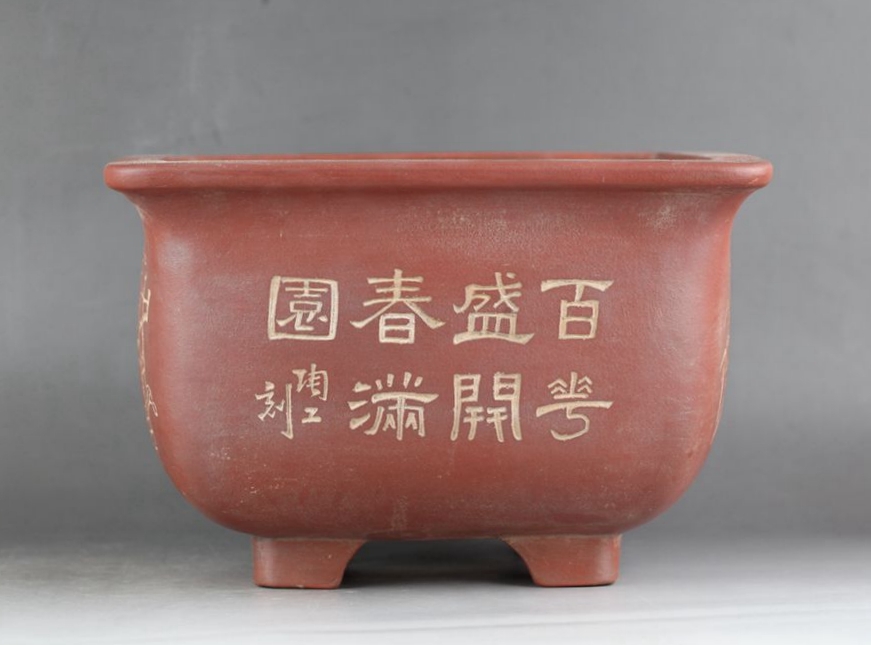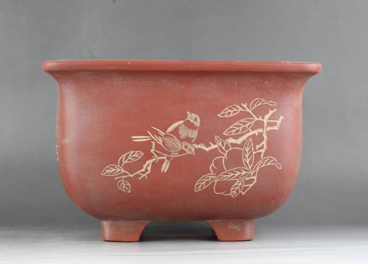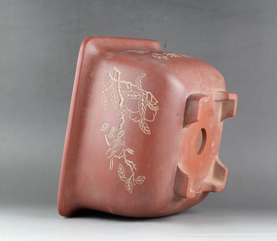 中国美術 中国古盆器 紫砂 朱泥 竹花鳥漢詩文 正方鉢 花器 盆栽鉢・珍品旧蔵・古賞物・時代物
