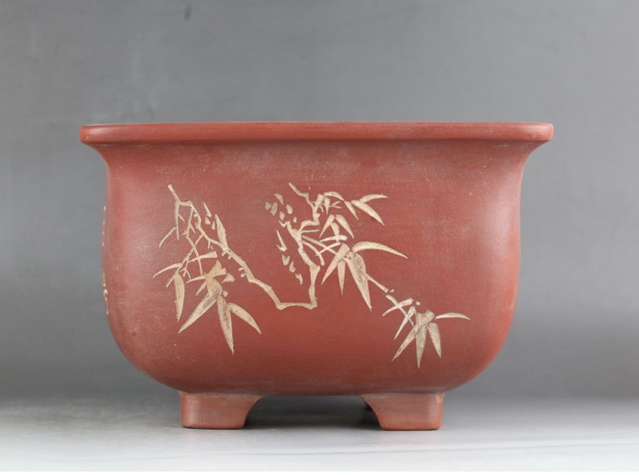 ☀ 中国美術 中国古盆器 紫砂 朱泥 竹花鳥漢詩文 正方鉢 花器 盆栽鉢・珍品旧蔵・古賞物・時代物 ☀