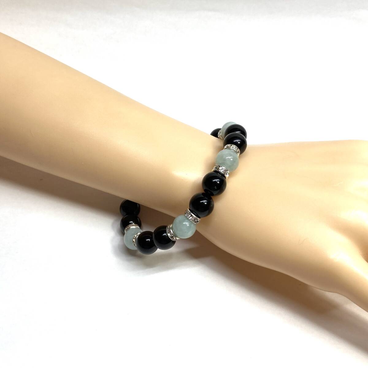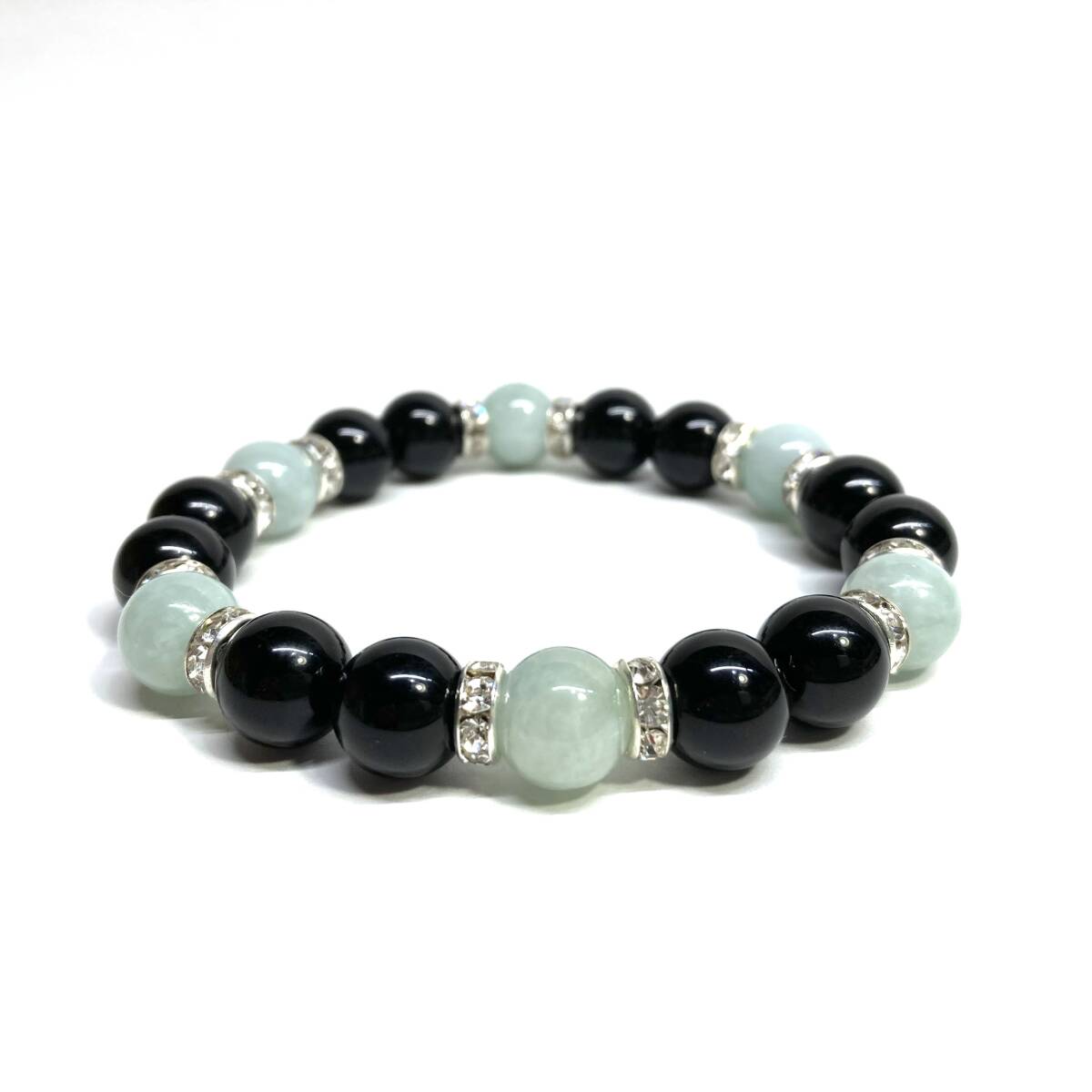 こちらは、モリオンとビルマ翡翠を組み合わせたパワーストーンブレスレットです。間にはロンデルを挟み高級感あるデザインに仕上げております。石大きさは腕にも馴染みやすいように10mm玉で内径約18cm(伸可能)です。(サイズ変更の場合は取引ナビにてご連絡をお願いします。) 数に限りがございますので気になる方はお早めにどうぞ。