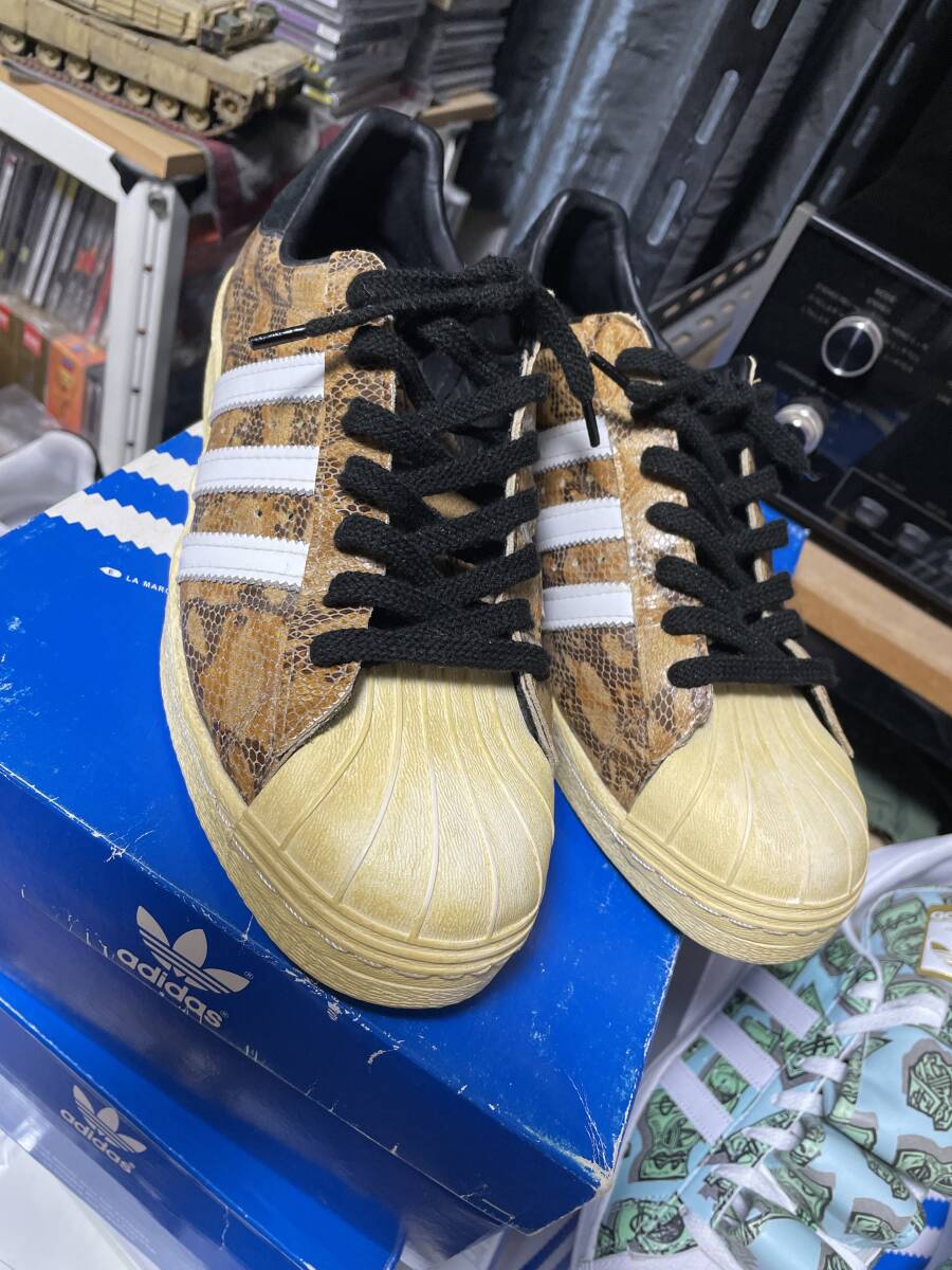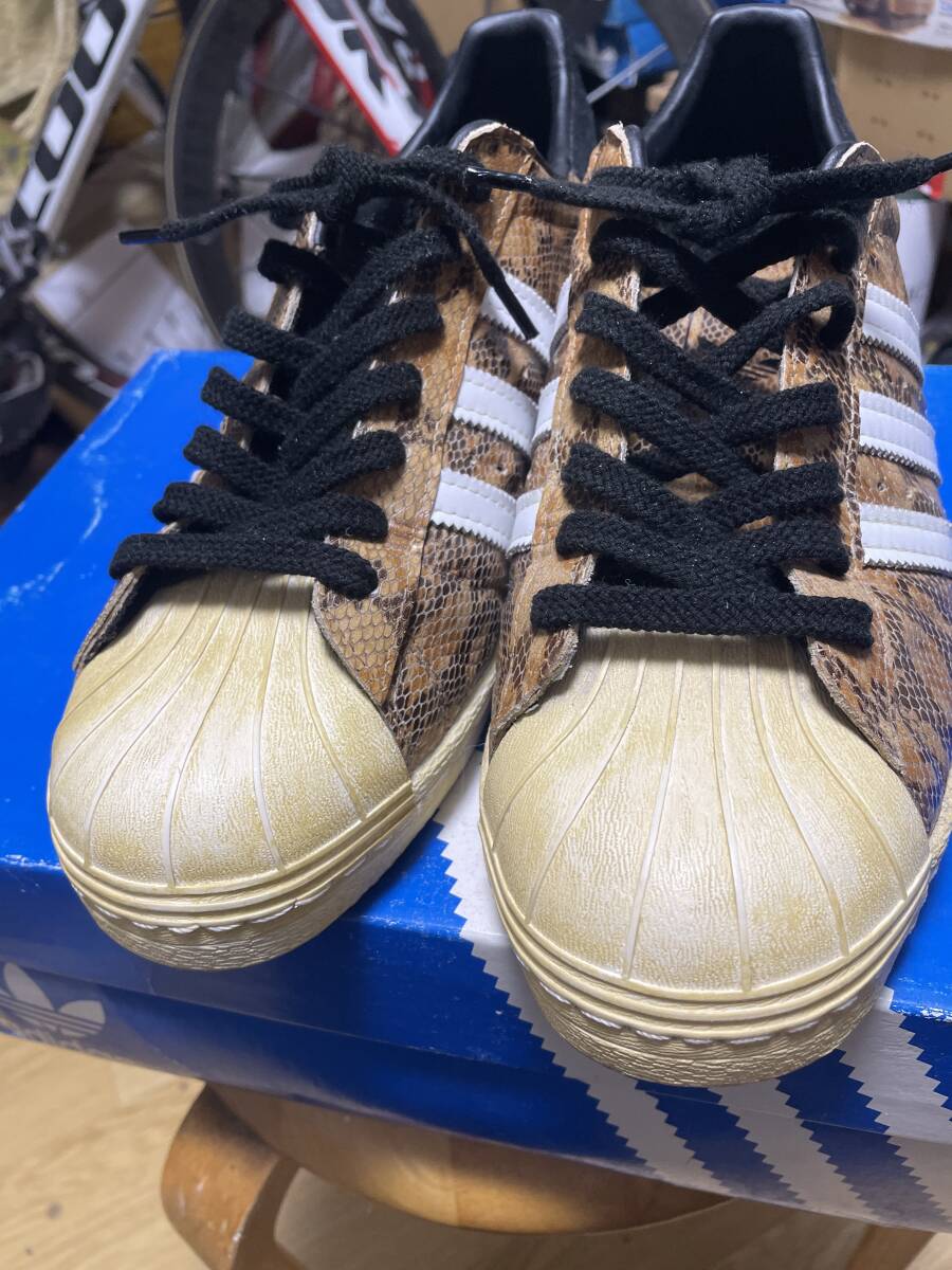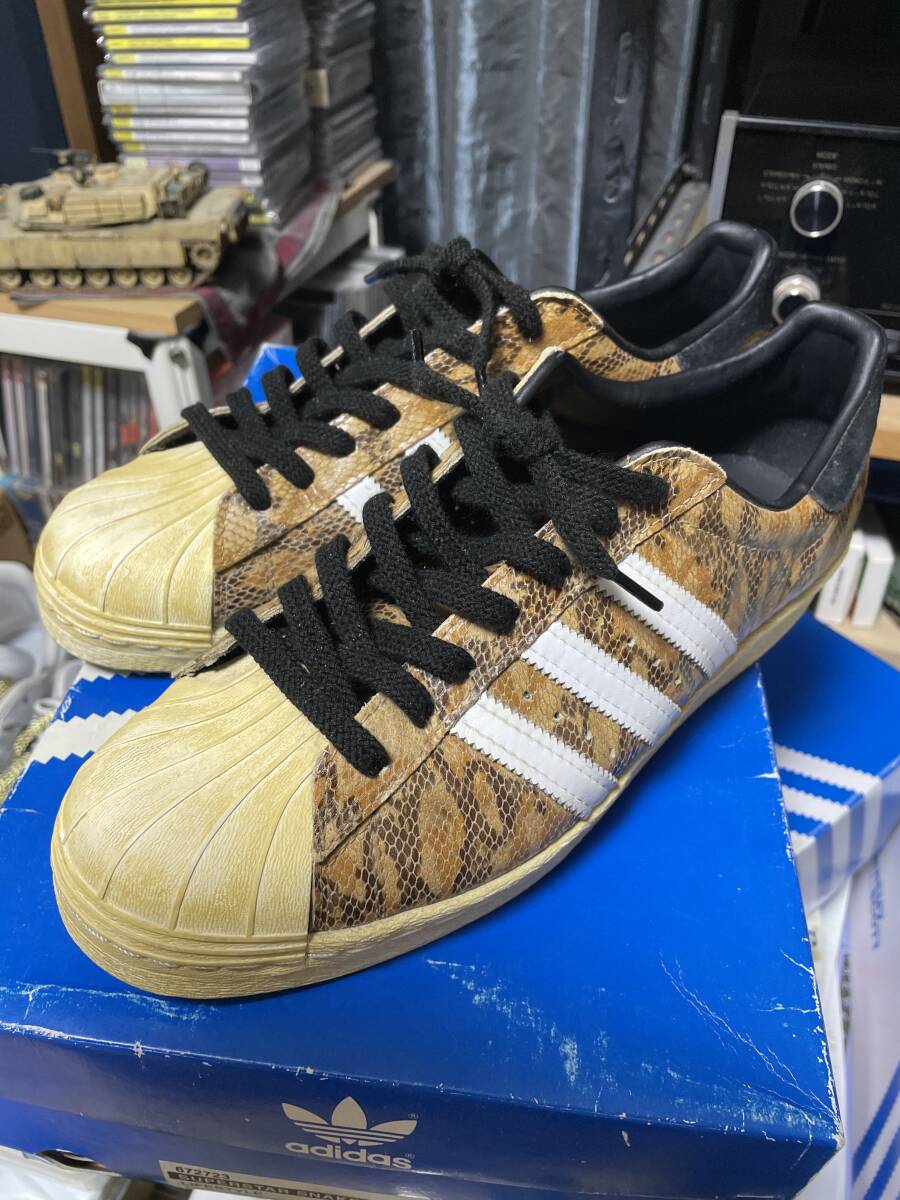 使用状況:ブラウンスネーク地にホワイト三本ラインのレアカラーなスーパースタースネークです。靴のサイズは28.0ですが箱の表示は27.5cmで、流通の過程で入れ違ったものと思われます。使用機会が少なく目立った傷や汚れも無い美品です。数年前に本オークションで入手しコレクションしていた物ですがサイズが合わないので出品します。この機会にぜひご検討ください。