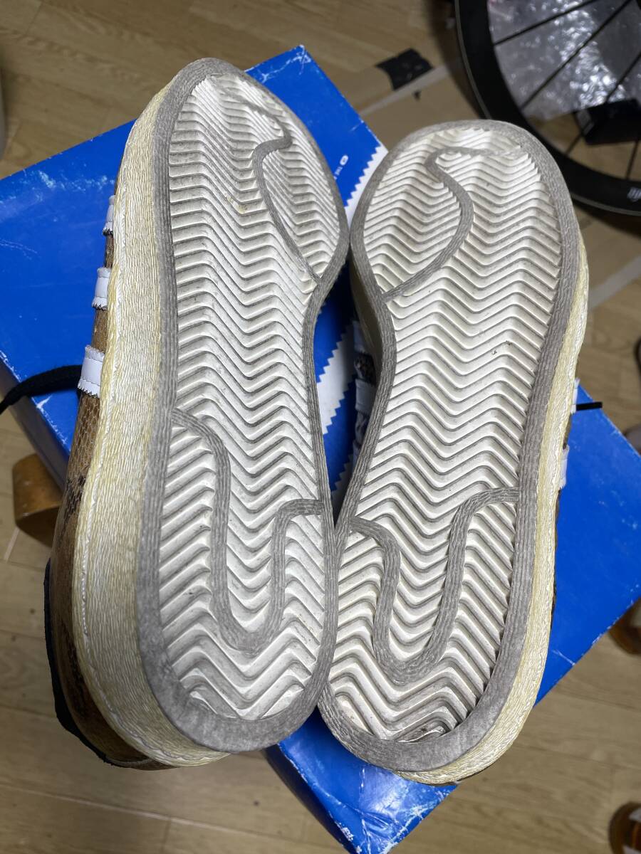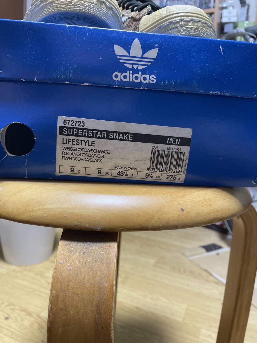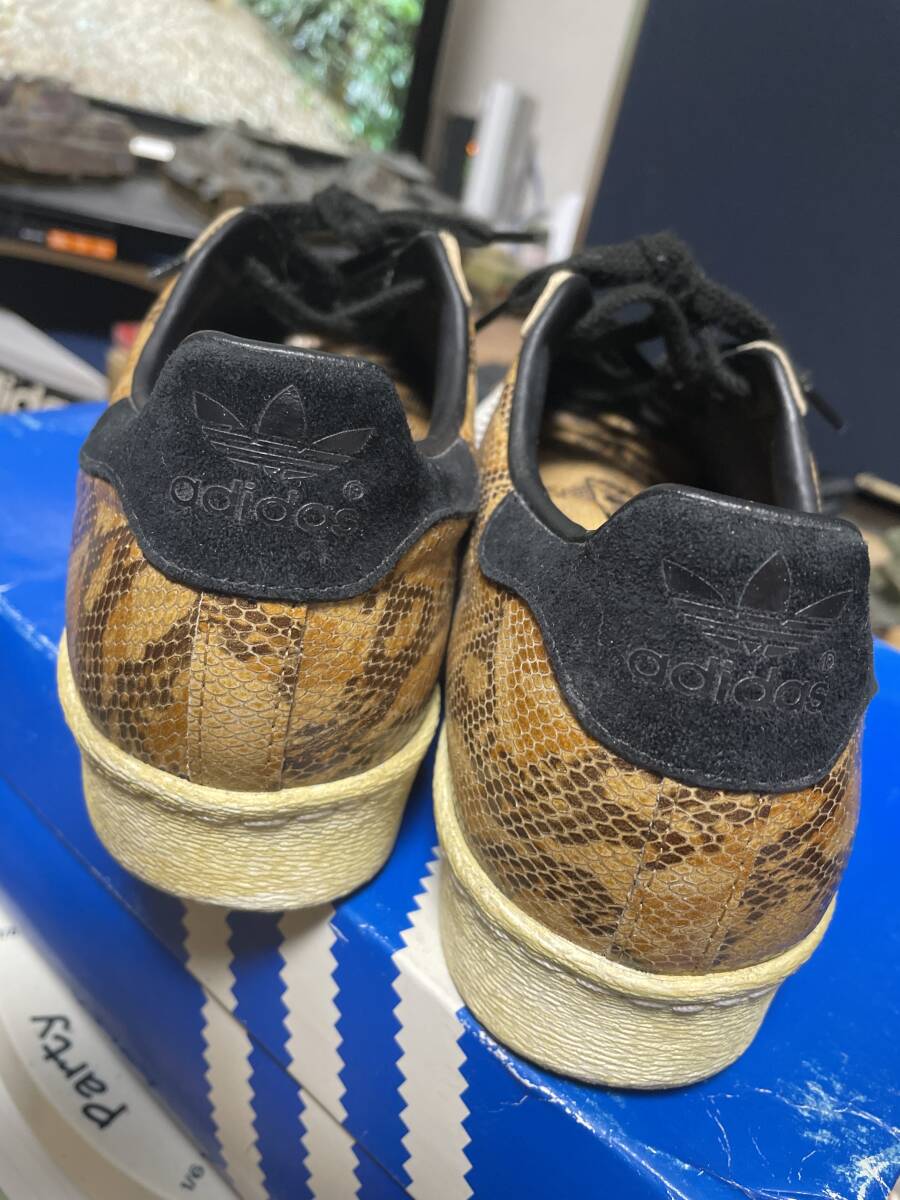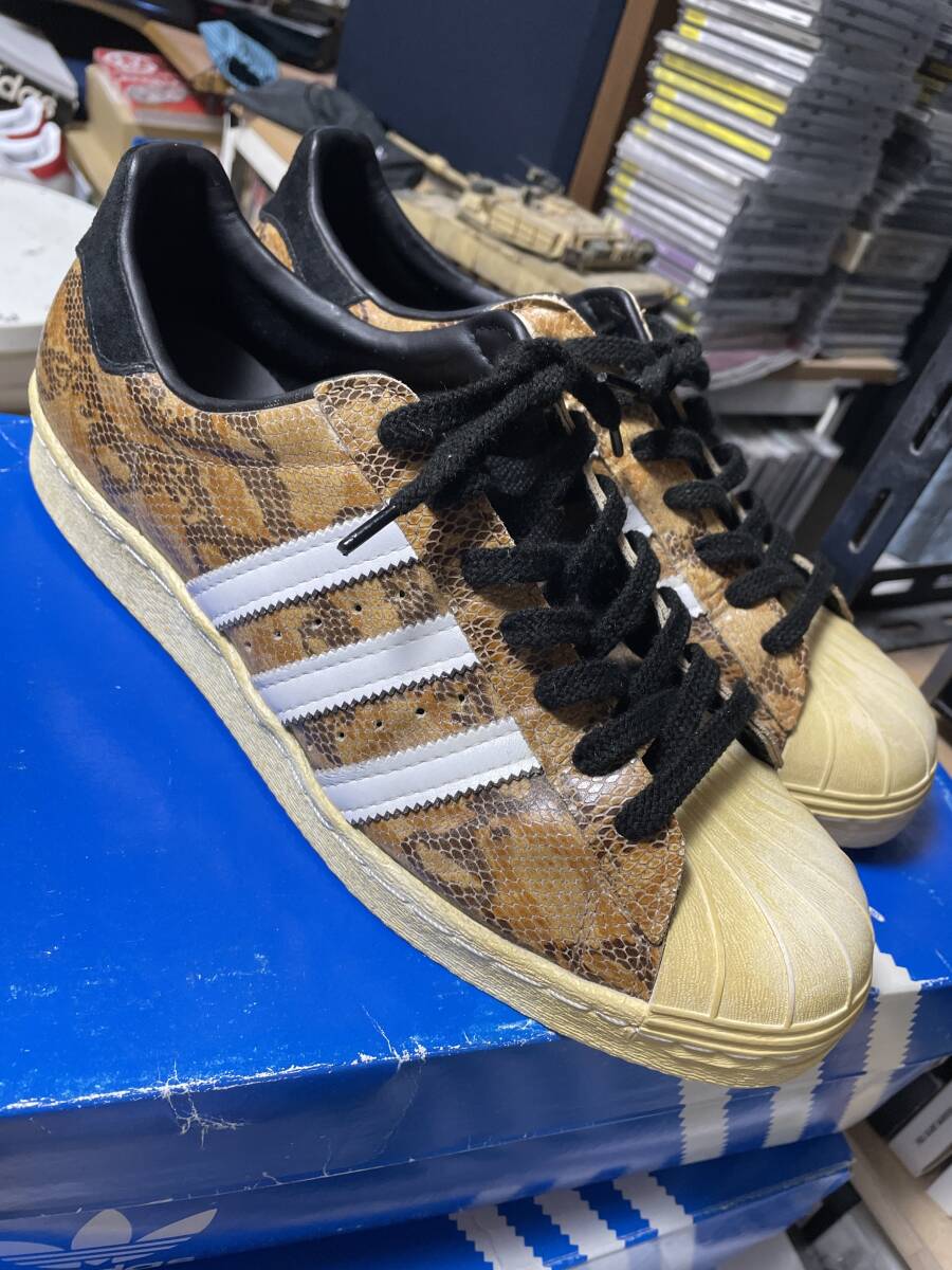 使用状況:ブラウンスネーク地にホワイト三本ラインのレアカラーなスーパースタースネークです。靴のサイズは28.0ですが箱の表示は27.5cmで、流通の過程で入れ違ったものと思われます。使用機会が少なく目立った傷や汚れも無い美品です。数年前に本オークションで入手しコレクションしていた物ですがサイズが合わないので出品します。この機会にぜひご検討ください。