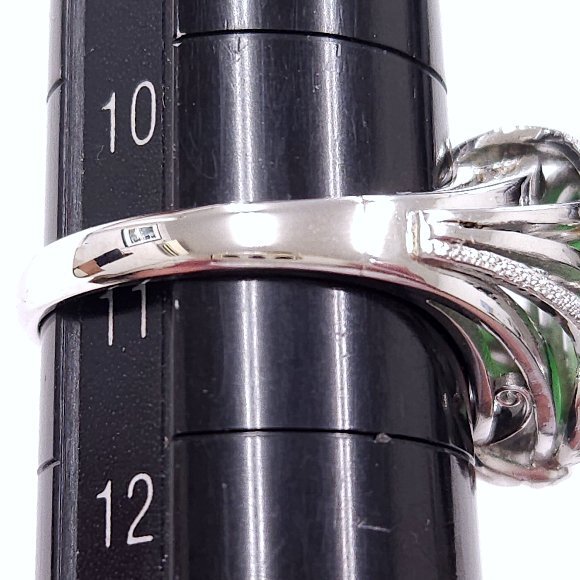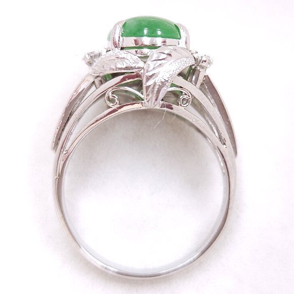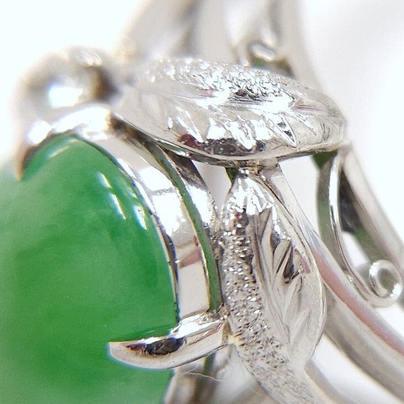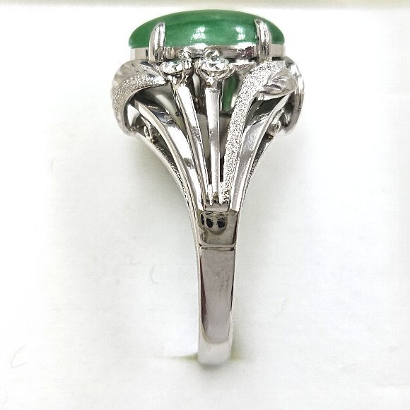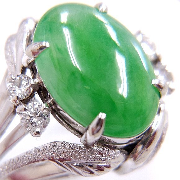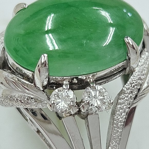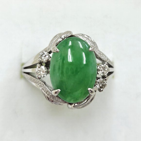 オーバルカボッションカットの天然ヒスイをセンターにセットし ヒスイの両脇には、合計 4ピース 0.28カラット ラウンドカットの天然ダイヤモンドを石留めデザインしております。天然ヒスイは使用感による擦れキズ等は ほぼ無く カケやワレも見られません。僅かに色ムラを確認できますが緑色のお色は深く良い状態のお石になるかと思います。リングサイズは 11号で素材は、プラチナ850です。ダイヤモンドのクラリティは主観になりますが、SIクラスから Iクラスに揃えられており 輝きは まずまずに綺麗です。 |