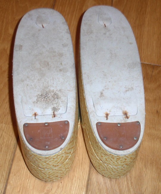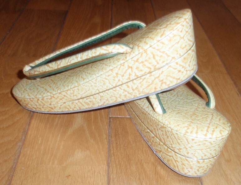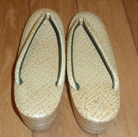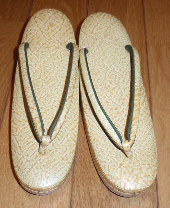 表と鼻緒はレザー調の花葉色系に幾何学模様と螺鈿細工の様な加工が施されています。底面はクローム表、踵プロテクター付きの丈夫な作りです。