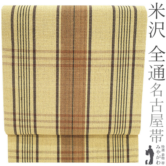 名古屋帯 八寸 米沢 米澤 全通 正絹 織り柄 黄ベージュ 茶色 格子 長尺 ロングサイズ カジュアル 中古 仕立て上がり みやがわ sb52246