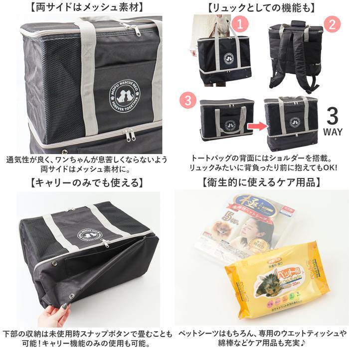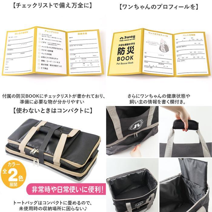 商品説明 | ・・【愛犬のもしもの備えに】 ・いざッというときにパッと持ち出せる!ペット防災18点セットが新登場。 ・【万が一の時に】 ・災害などによるワンちゃんと避難時に役立つキャリーを含んだ小物18点セット。 ・【キャリーにもなるトートバッグ】 ・専用のトートバッグはキャリーケースと兼ねた作り。2層に分かれており下には小物をIN ・【両サイドはメッシュ素材】 ・通気性が良く、ワンちゃんが息苦しくならないよう両サイドはメッシュ素材に。 ・【リュックとしての機能も】 ・トートバッグの背面にはショルダーを搭載。リュックみたいに背負ったり前に抱えてもOK! ・【キャリーのみでも使える】 ・下部の収納は未使用時スナップボタンで畳むことも可能!キャリー機能のみの使用も可能。 ・【衛生的に使えるケア用品】 ・ペットシーツはもちろん、専用のウエットティッシュや綿棒などケア用品も充実♪ ・【寒さ対策のブランケット】 ・起毛素材のブランケットは肌寒い日や冷房対策にピッタリ☆ ・【餌や水入れに】 ・折り畳めるシリコーンボウルは餌や水入れに。使用後はサッと洗うだけで汚れが落ちる。 ・【ワンちゃんの迷子対策に】 ・リードや迷子札が付いており、避難中や移動時の迷子対策もばっちり。 ・【他にも役立つアイテムあり】 ・飼い主も役立つテープやライトなど、避難生活をサポートするアイテム多数! ・【チェックリストで備え万全に】 ・付属の防災BOOKにチェックリストが書かれており、準備に必要な物が分かりやすい ・【ワンちゃんのプロフィールを】 ・さらにワンちゃんの健康状態や飼い主の情報を書く欄付き。 ・【使わないときはコンパクトに】 ・トートバッグはコンパクトに畳めるので、未使用時の収納場所に困らない♪ |