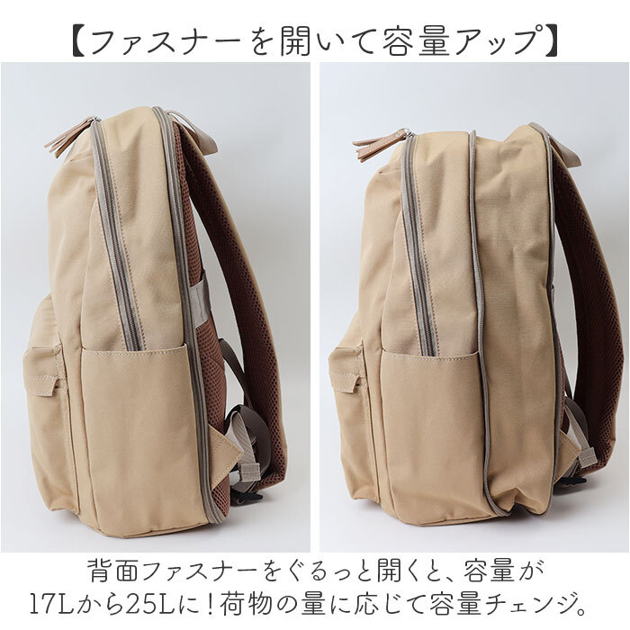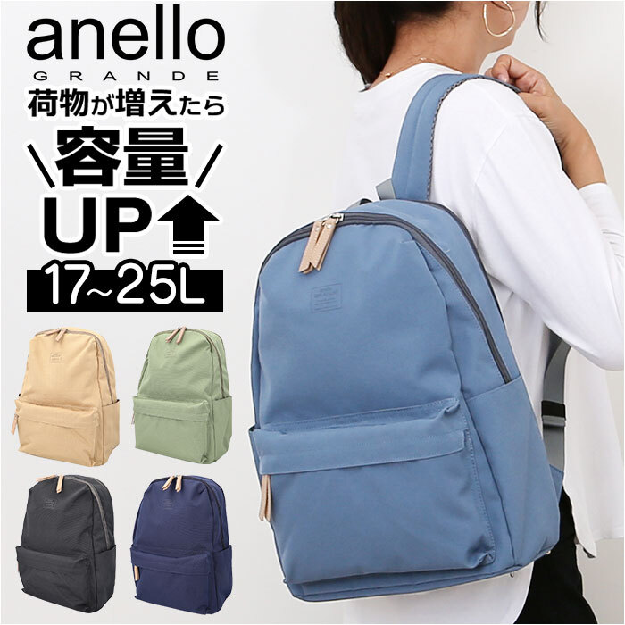 | 商品説明 | ・・【荷物が増えても安心の拡張バッグ】 ・普段使いからトラベルシーンまで重宝!「anelloGRANDE ふえる リュック」。 ・【ファスナーを開いて容量アップ】 ・背面ファスナーをぐるっと開くと、容量が17Lから25Lに!荷物の量に応じて容量チェンジ。 ・【ガバっと開くダブルファスナー】 ・左右どちらからもオープン。中身を確認しやすく、出し入れスムーズ。 ・【A4対応でざっくりひとまとめ】 ・A4がすっぽり、着替え等も収納可能。底面にはソフトな底板を内蔵しており、安定性も。 ・【通勤や出張等、ビジネスシーンでも】 ・書類やノートPCが収まるクッションポケット。へたれにくく、何でもザクザク収納できて万能! ・【サクッと取り出せて迷子知らず】 ・クッションポケットの他にも、複数のポケットを配置。バッグの中で、小物を探す手間が不要。 ・【軽やかな背負い心地でノンストレス】 ・体に負担をかけない軽量仕上げ。クッション性と通気性のある仕様の背面&ショルダー。 ・【キャリーオンできて移動もラクラク】 ・背面の面ファスナーベルトを、キャリーのハンドルに通せるキャリーオンタイプ。 ・【ちょっとの雨なら大丈夫】 ・汚れや水滴を弾きやすい、はっ水加工済み。お手入れも拭き取るだけ。 ・(※)完全防水ではありません。 ・【持つ人を選ばないユニセックス仕様】 ・年代や性別問わず持ち歩ける、シンプルなデザイン。お気に入りのカラーをチョイス! ・【ポケット仕様】 ・内側:クッションポケット×1、オープンポケット×2、ファスナー式メッシュポケット×1 ・前面:ファスナーポケット×1 ・サイド:オープンポケット×2 |