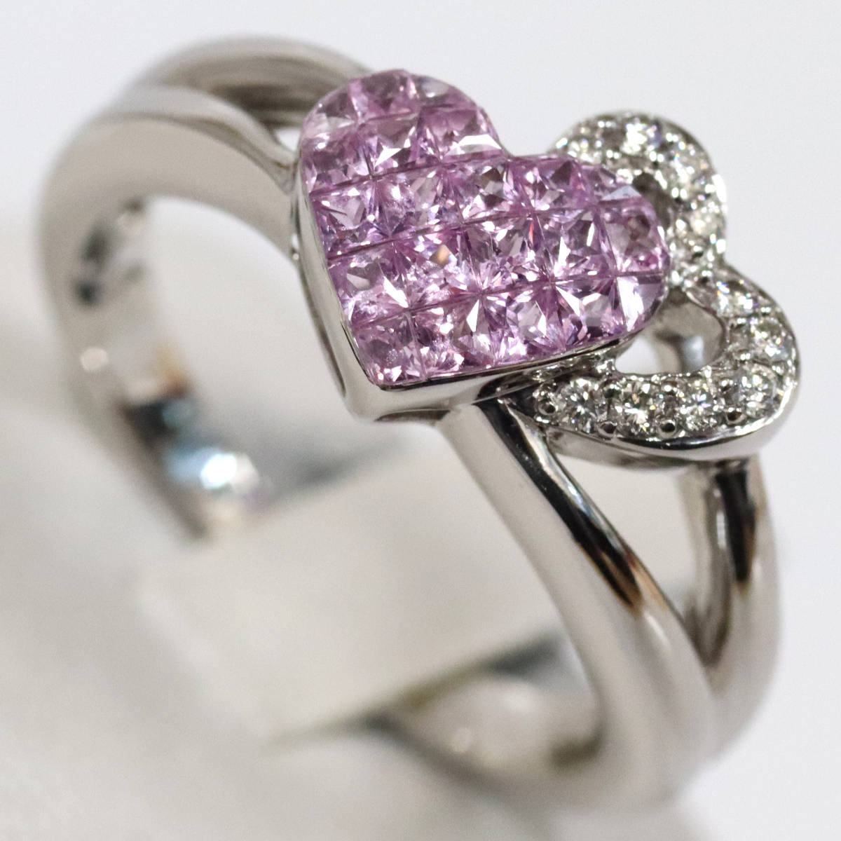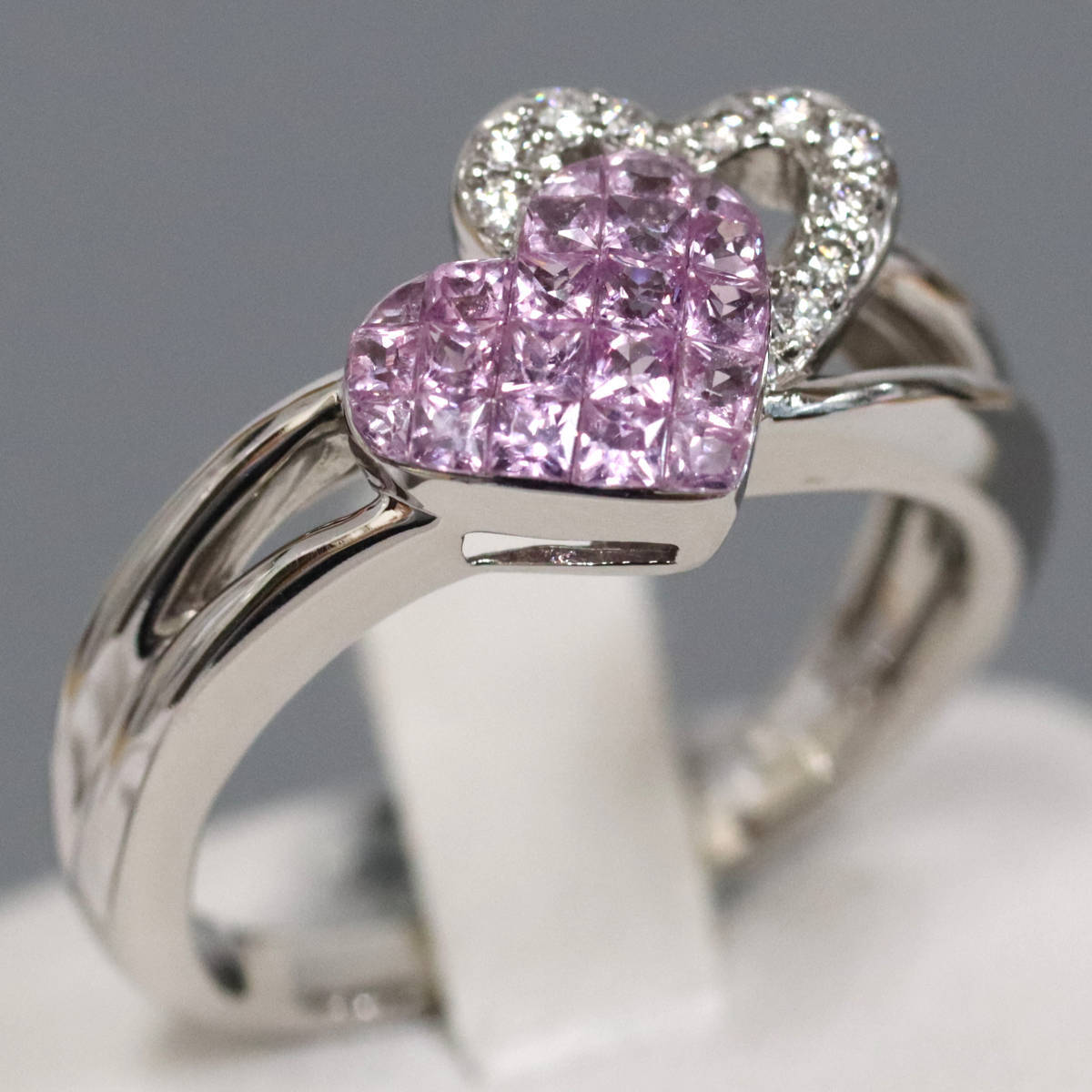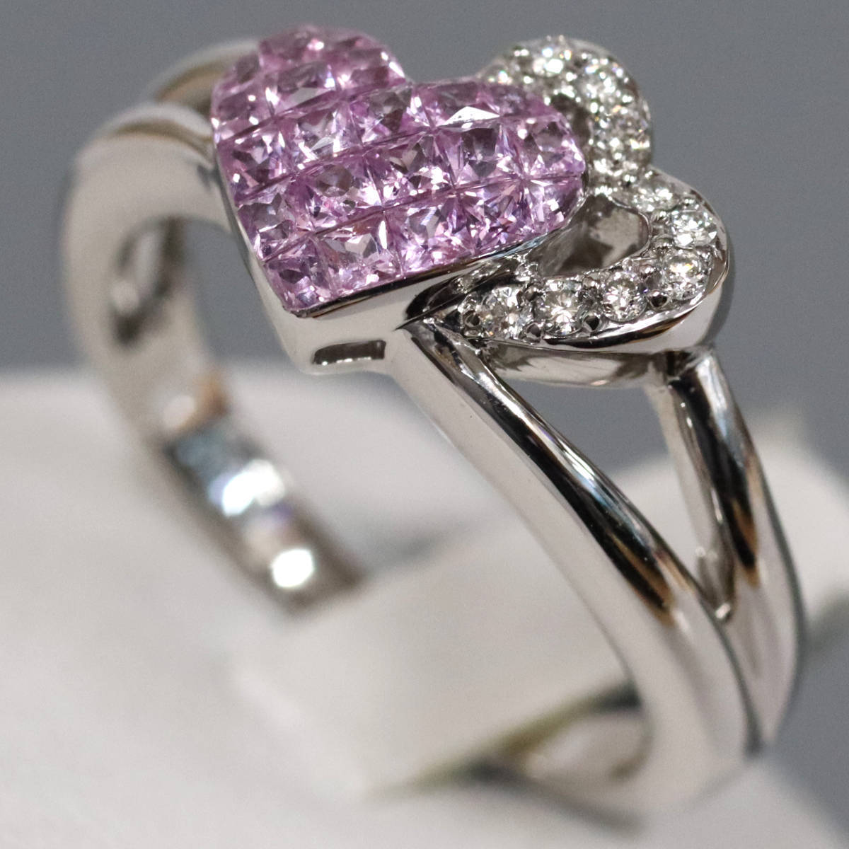 笠原真寿美のK18WGサファイアダイヤモンドリングの中古品です。 ハートモチーフの可愛らしいデザインです。 石目の刻印はありません。 サファイアはミステリーセッティングでセットされています。 薄いピンク色で、わずかにインクルージョンがありますが、肉眼では見えません。 ダイヤモンドは全体的にインクルージョンが少ないです。 地金には小傷があります。